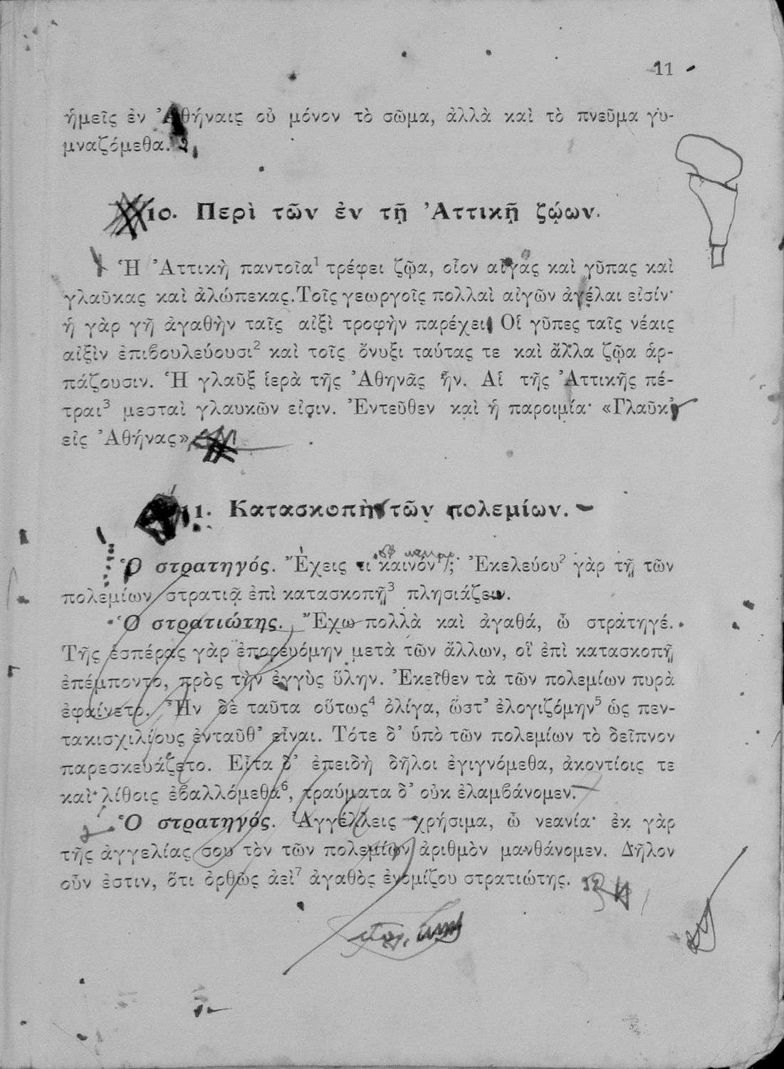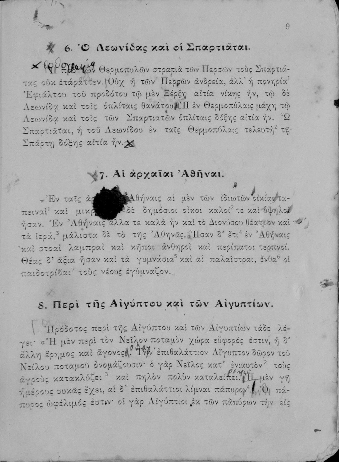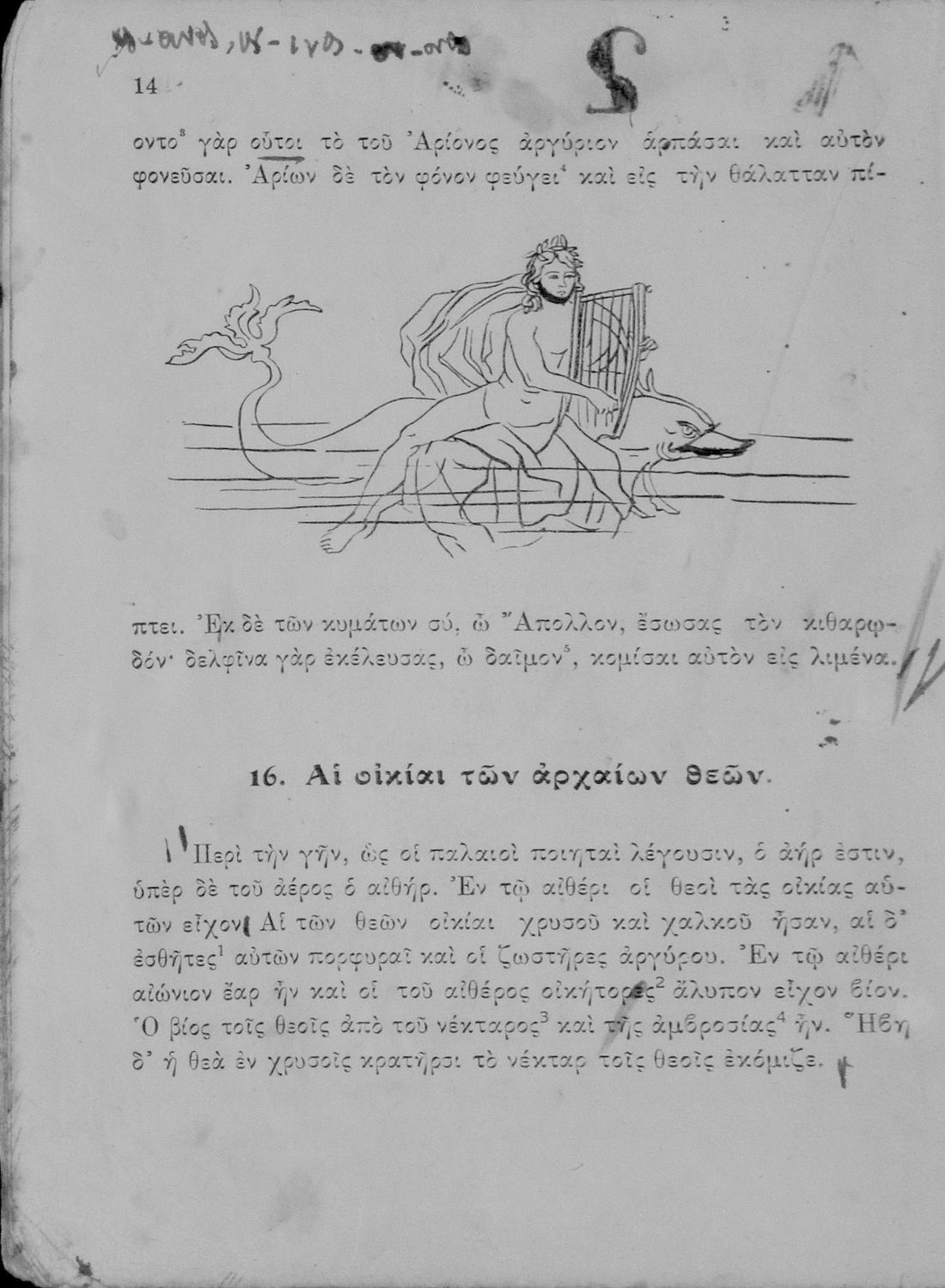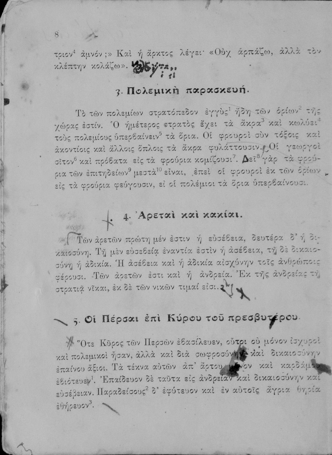 Σχολικό εγχειρίδιο Αρχαίων Ελληνικών Γυμνασίου που περιέχει κείμενα βασισμένα στην αρχαία ελληνική ιστορία και μυθολογία και γραμματικές, συντακτικές και ετυμολογικές παρατηρήσεις.
