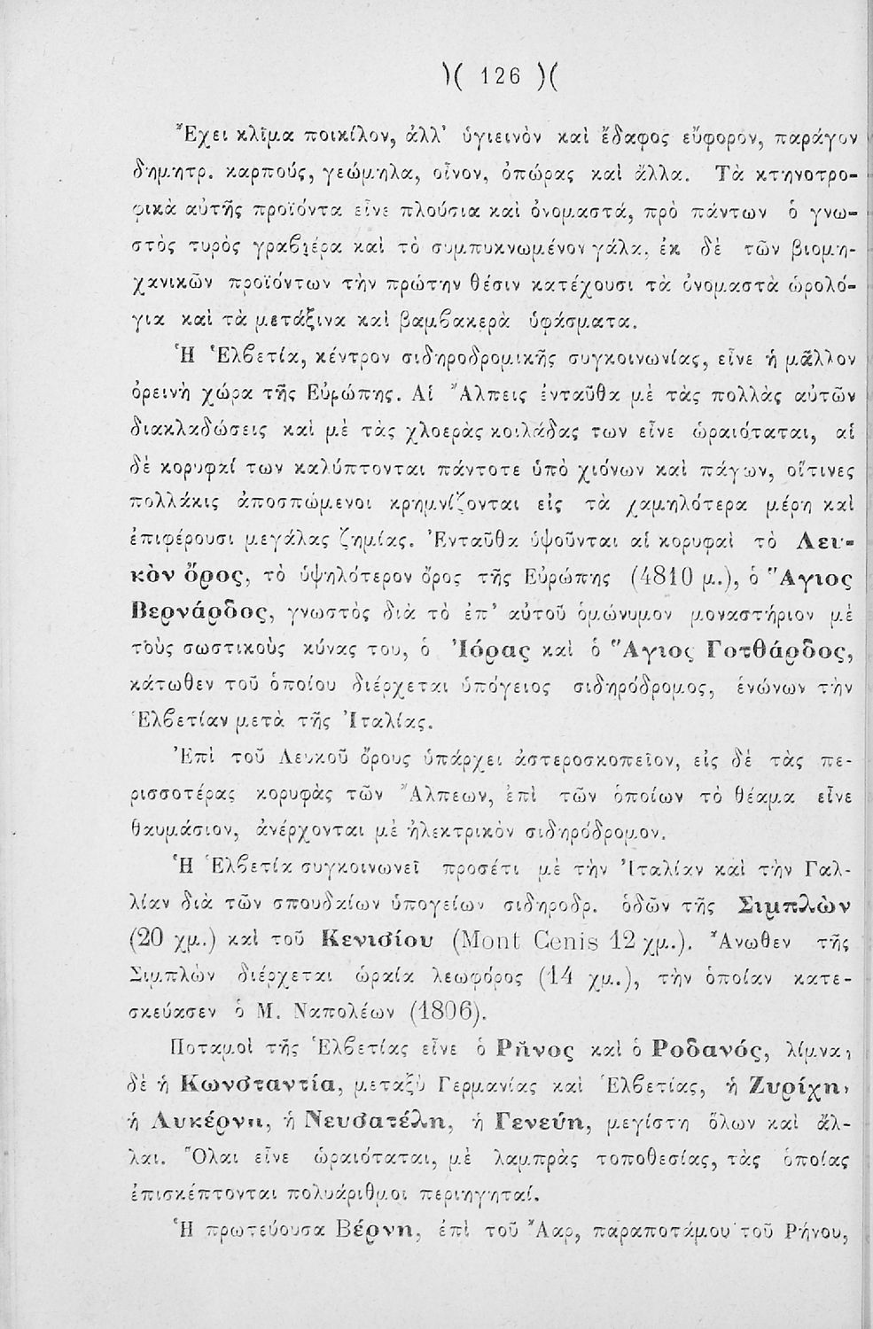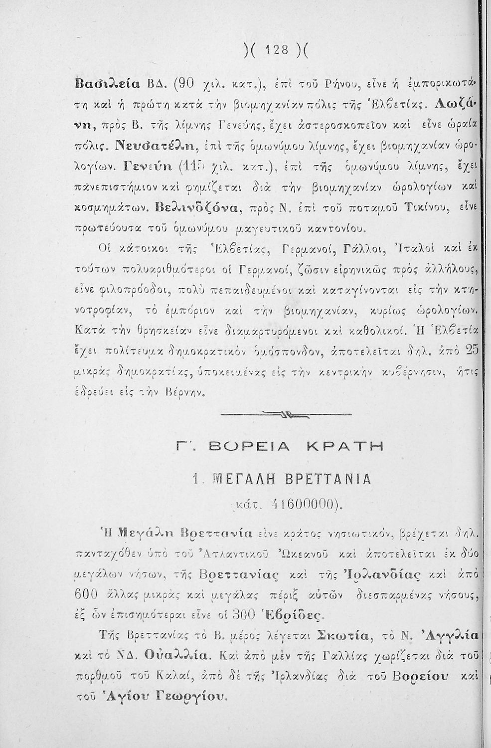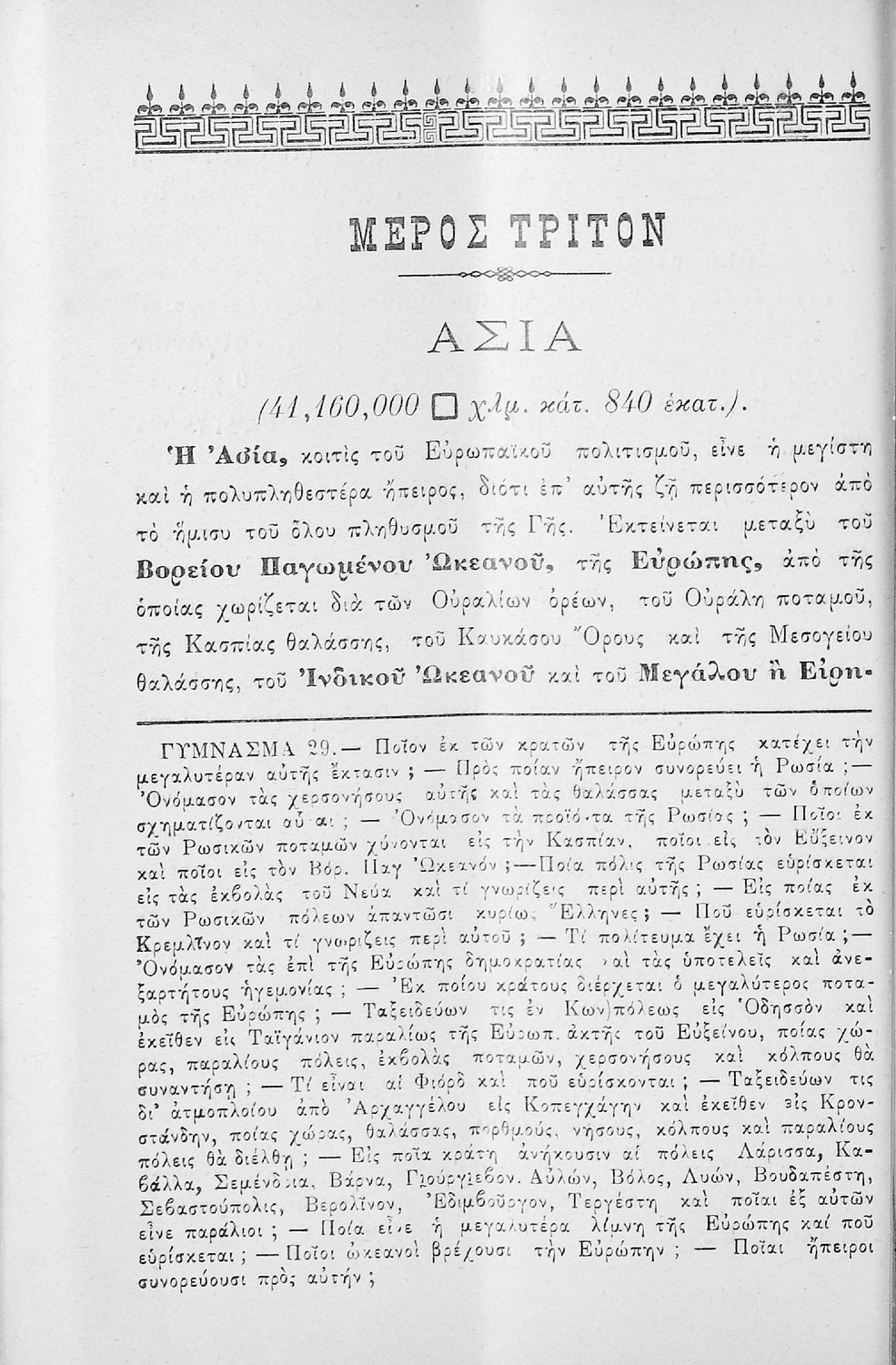 Σχολικό εγχειρίδιο Γεωγραφίας για τους μαθητές της Γ΄ τάξης των Ελληνικών Σχολείων και των Παρθεναγωγείων που περιέχει εισαγωγή στη μαθηματική, φυσική, φυσιογραφική και ανθρωπολογική γεωγραφία και παρουσιάζει ...