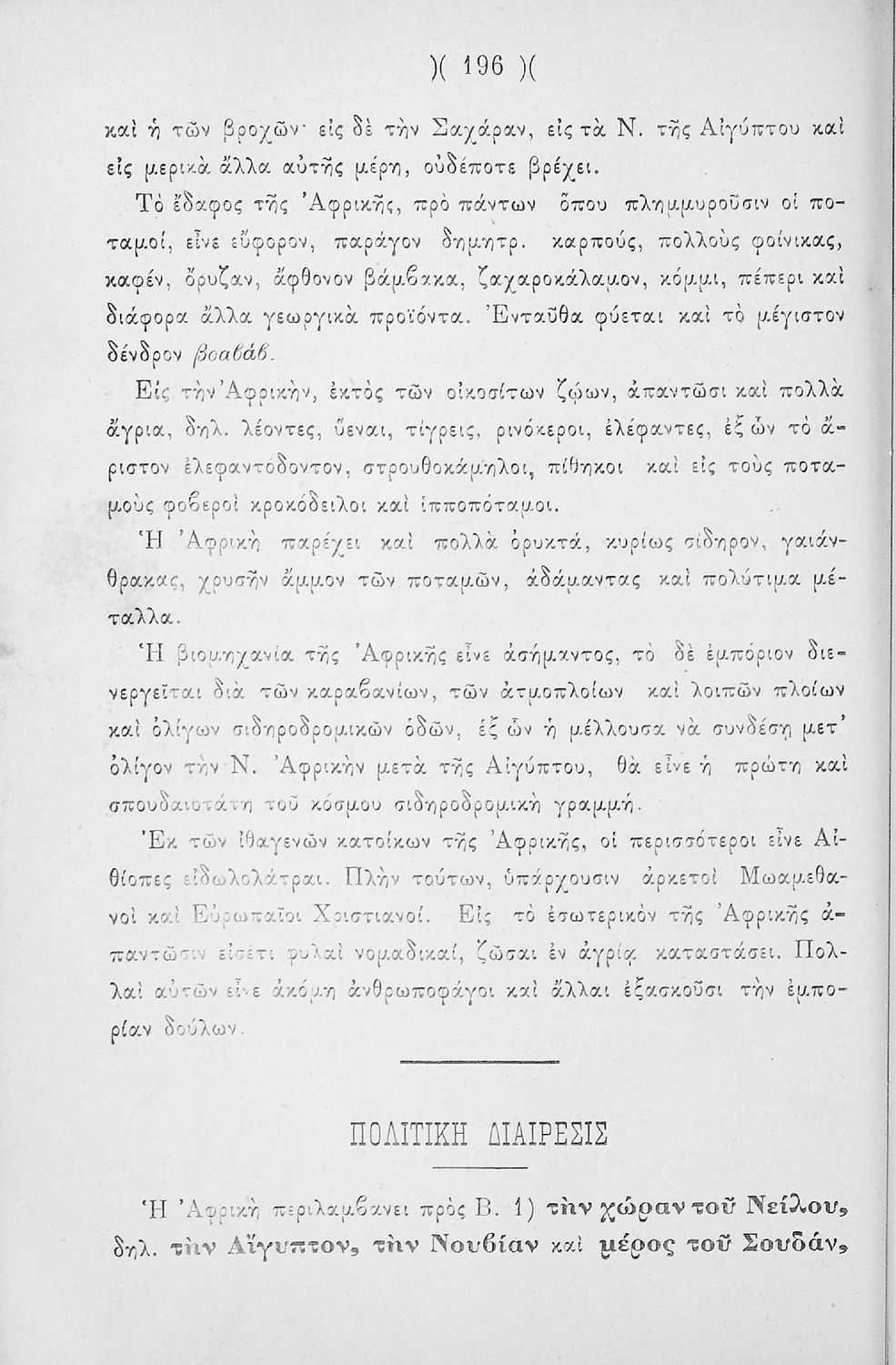 Σχολικό εγχειρίδιο Γεωγραφίας για τις Δ΄, Ε΄, ΣΤ΄ Ζ΄ Αστικών Σχολείων και Παρθεναγωγείων που περιλαμβάνει εισαγωγή στη φυσική, πολιτική και οικονομική γεωγραφία και παρουσιάζει χώρες από τις πέντε ηπείρους. Περιέχει και ασκήσεις.