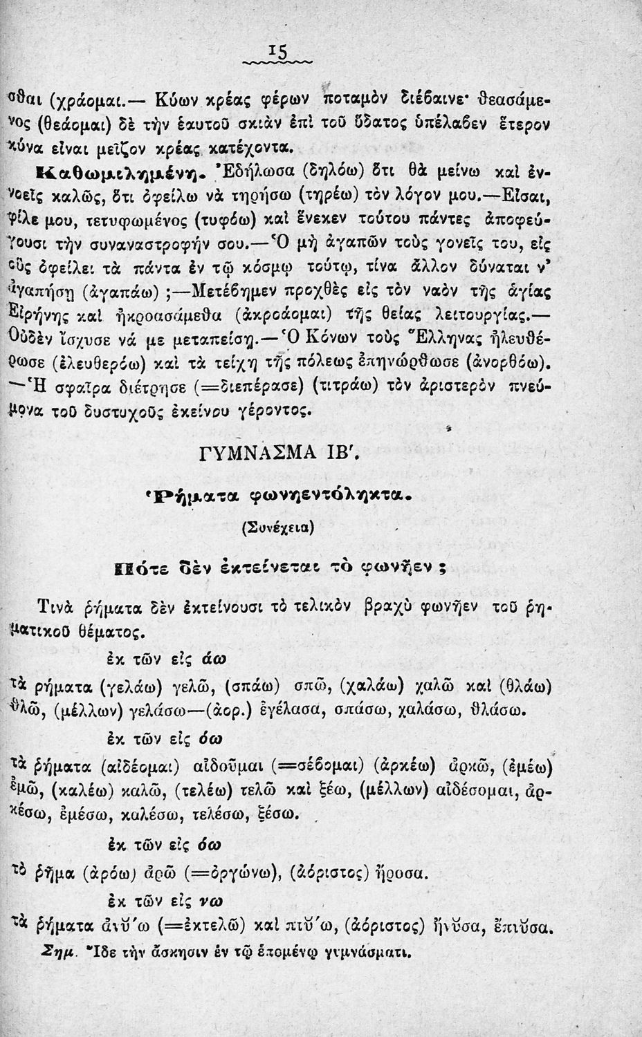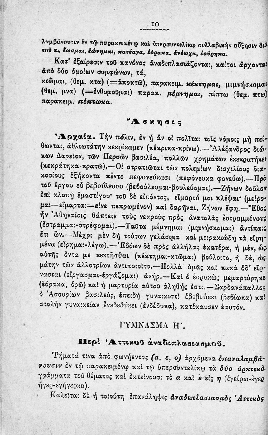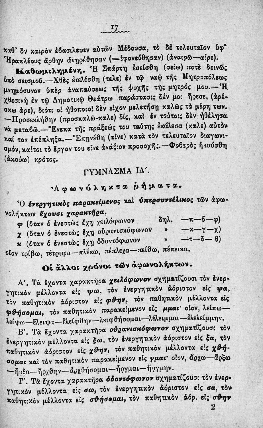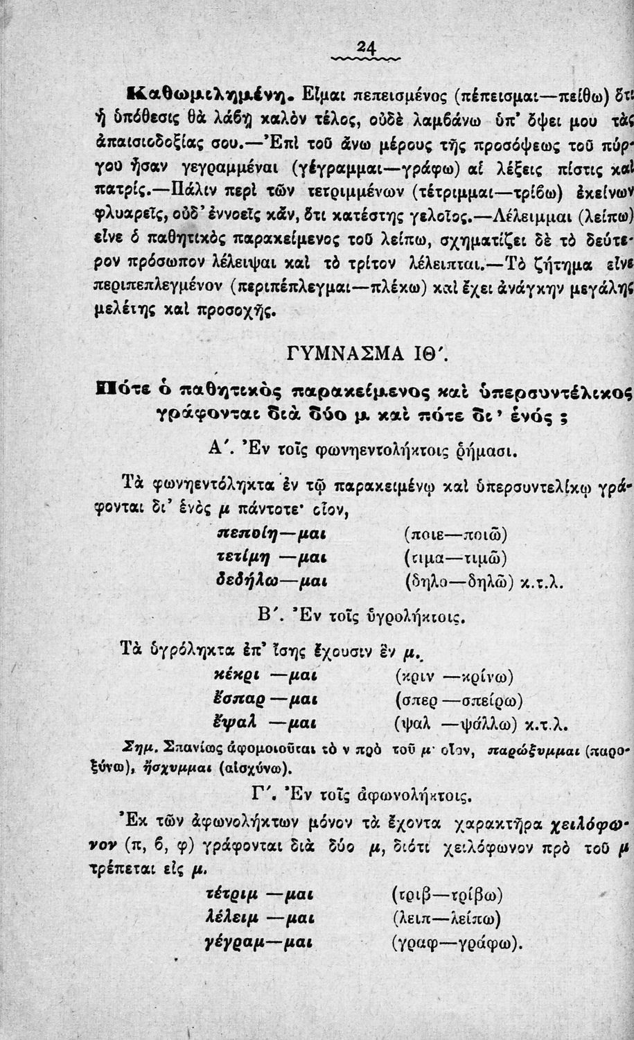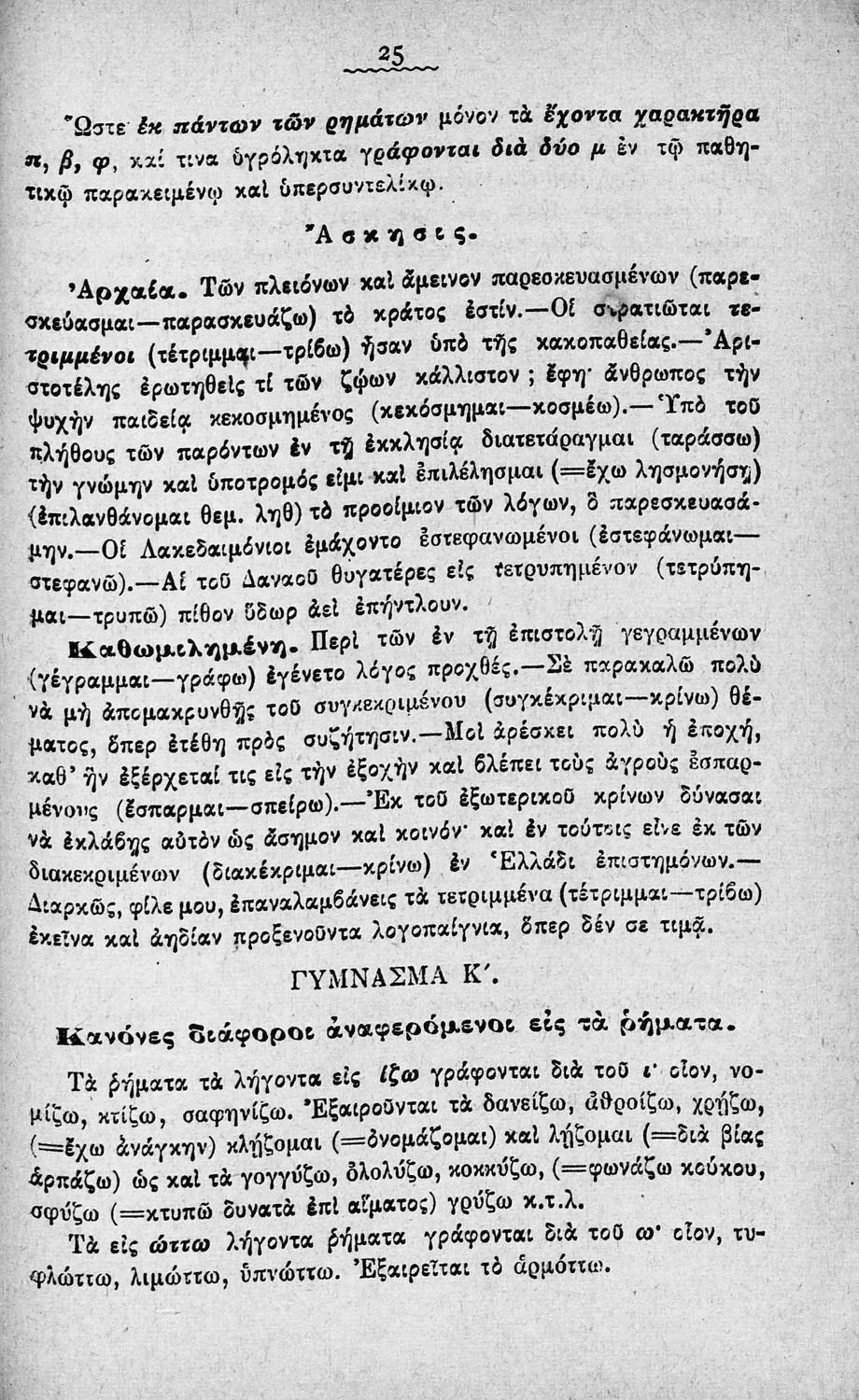 Σχολικό εγχειρίδιο Αρχαίων Ελληνικών Γυμνασίου που περιέχει τους κανόνες γραμματικής και είναι χωρισμένο σε φθογγολογικό, τυπολογικό και ετυμολογικό μέρος. Περιέχει και κατάλογο ανωμάλων ρημάτων.