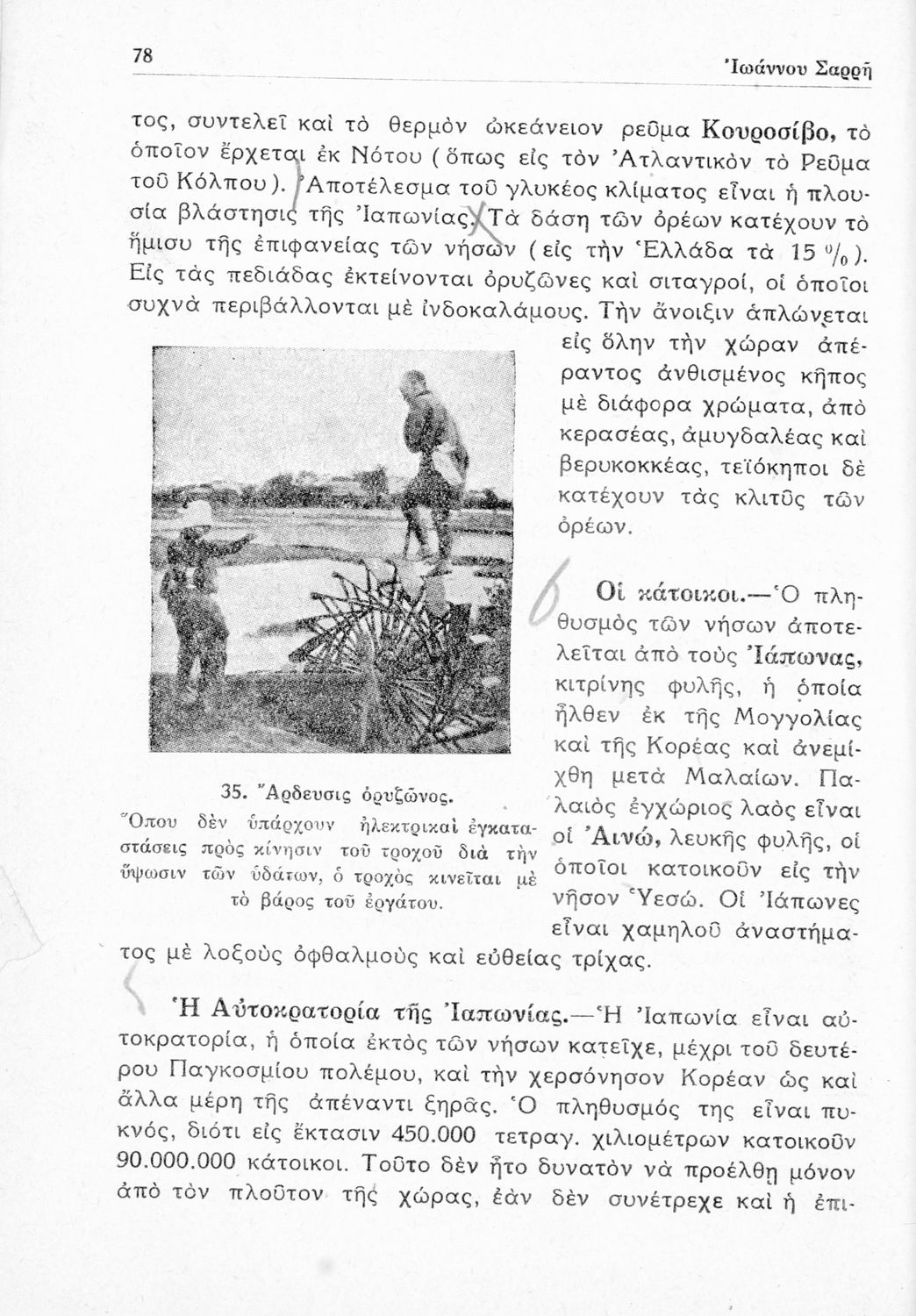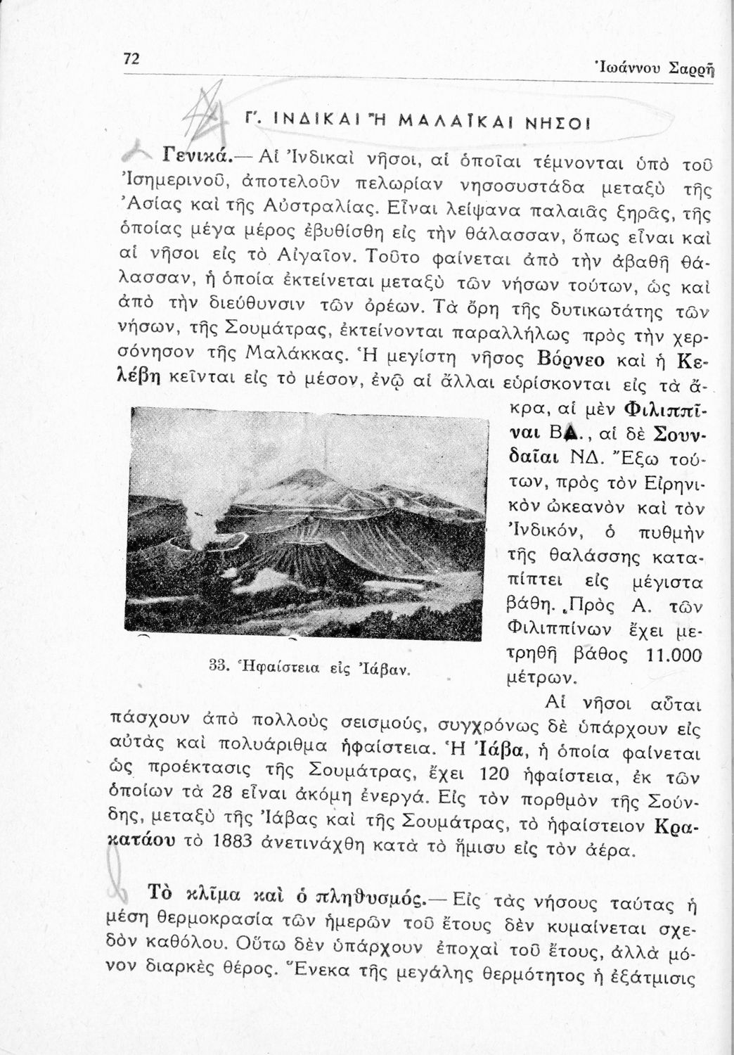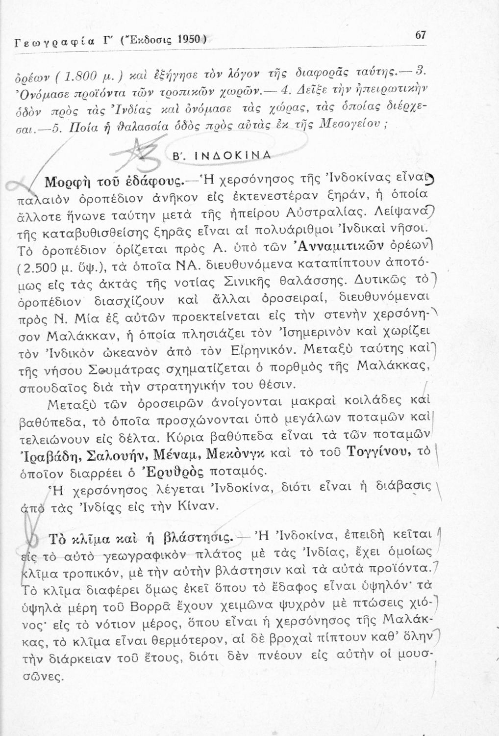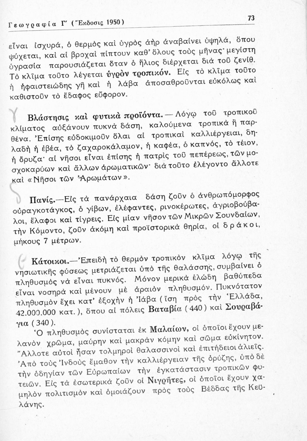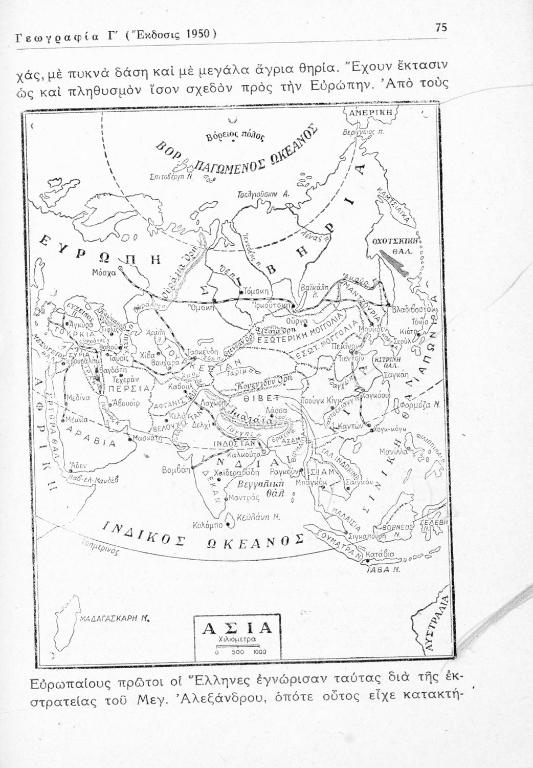 Βαθμίδα εκπαίδευσης: Δευτεροβάθμια Τάξη: Γ' Γυμνασίου Μάθημα: Γεωγραφία Γλώσσα: Απλή καθαρεύουσα Παρουσίαση περιεχομένου: Σχολικό εγχειρίδιο Γεωγραφίας Γ' Γυμνασίου που αποτελεί μια επισκόπηση των ηπείρων εκτός της Ευρώπης και εξετάζει ενδεικτικά κράτη και περιοχές από γεωφυσική, πολιτική και οικονομική σκοπιά. Γίνεται αναφορά στις παγκόσμιες συγκοινωνίες. |