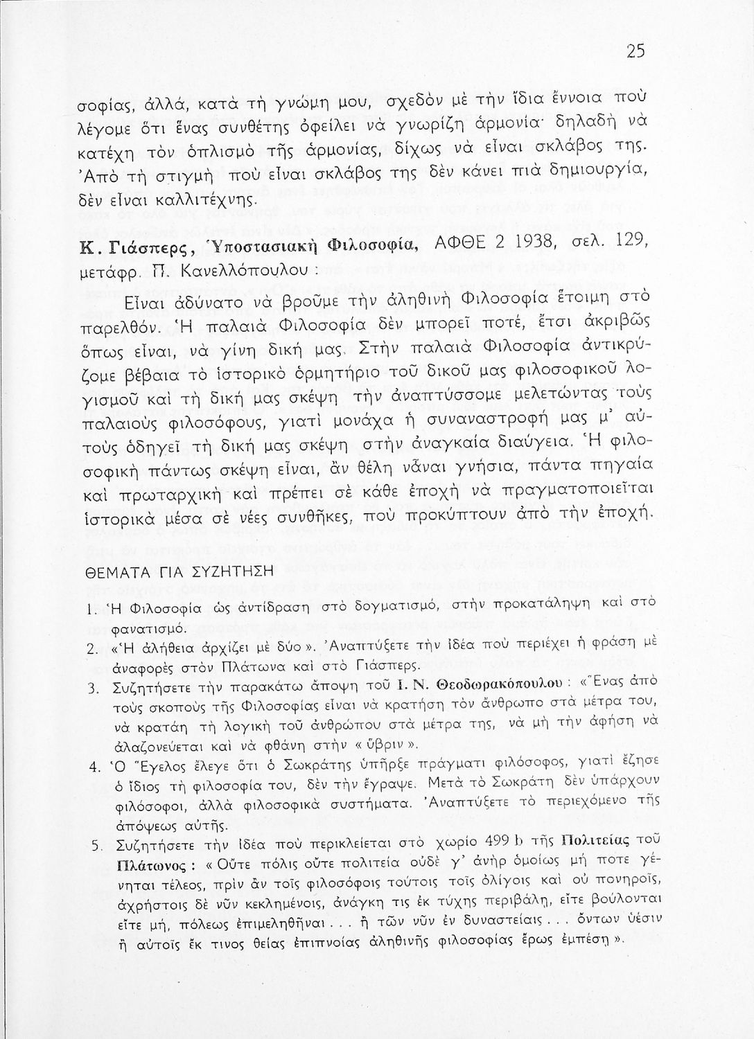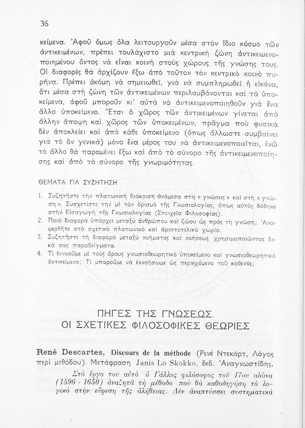 Σχολικό εγχειρίδιο Φιλοσοφίας για την ΣΤ΄ Γυμνασίου που περιέχει αποσπάσματα από διάσημα φιλοσοφικά κείμενα τόσο της ελληνικής αρχαιότητας όσο και της σύγχρονης ευρωπαϊκής σκέψης και θέματα προς συζήτηση. Περιλαμβάνει και λεξιλόγιο φιλοσοφικών όρων και ειδικό κεφάλαιο για τους προσωκρατικούς.