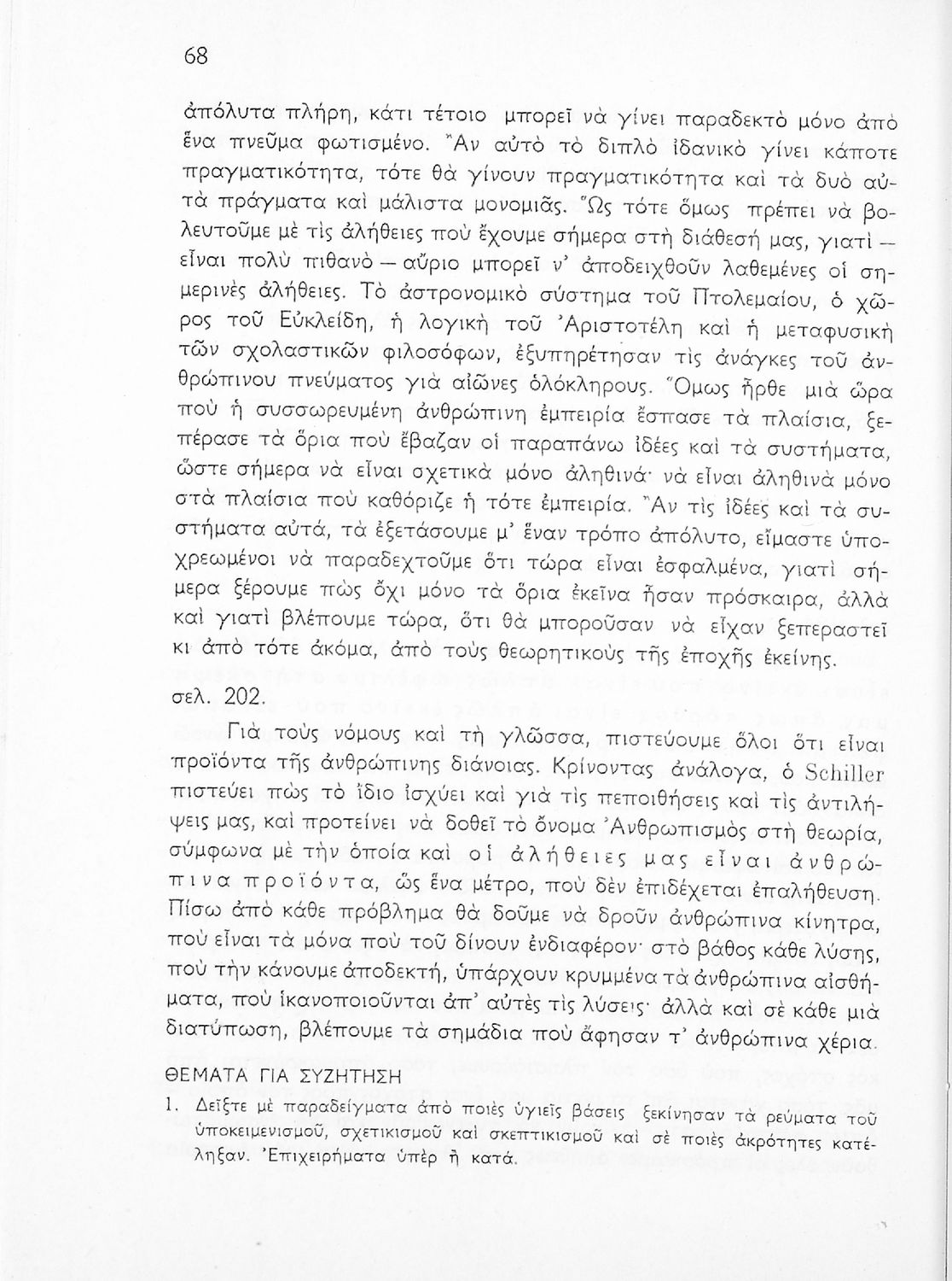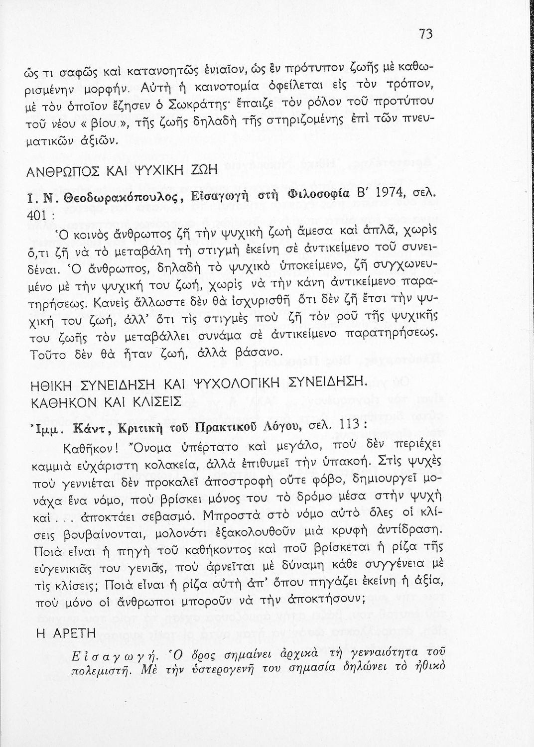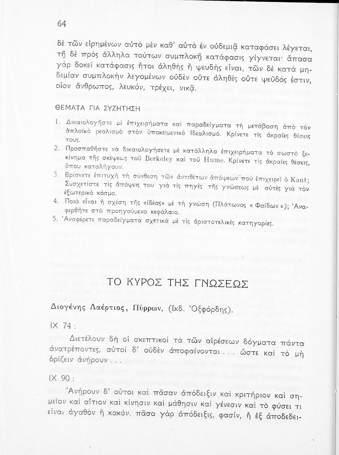 Σχολικό εγχειρίδιο Φιλοσοφίας για την ΣΤ΄ Γυμνασίου που περιέχει αποσπάσματα από διάσημα φιλοσοφικά κείμενα τόσο της ελληνικής αρχαιότητας όσο και της σύγχρονης ευρωπαϊκής σκέψης και θέματα προς συζήτηση. Περιλαμβάνει και λεξιλόγιο φιλοσοφικών όρων και ειδικό κεφάλαιο για τους προσωκρατικούς.