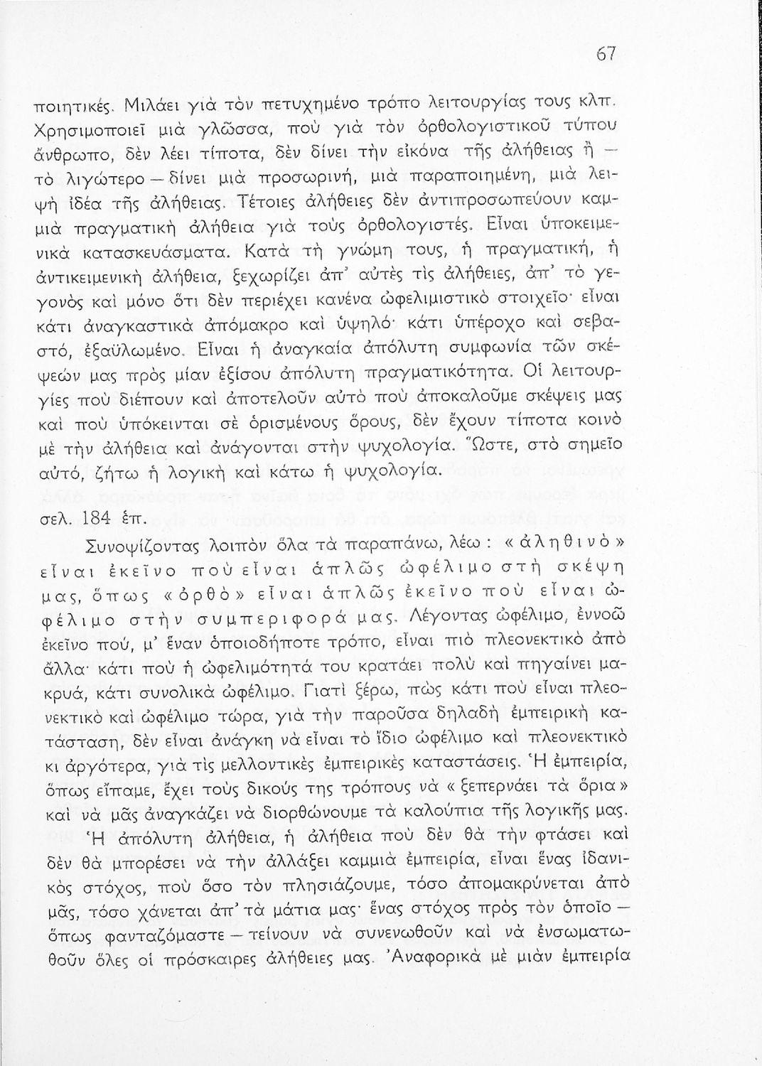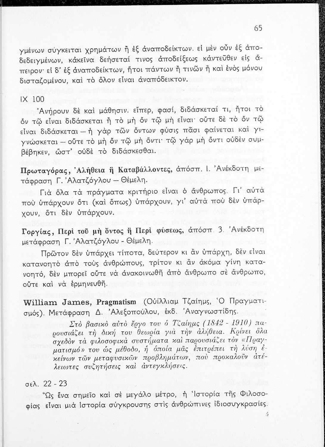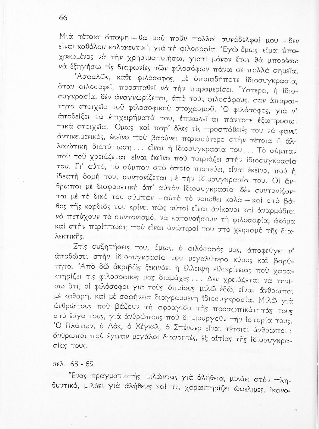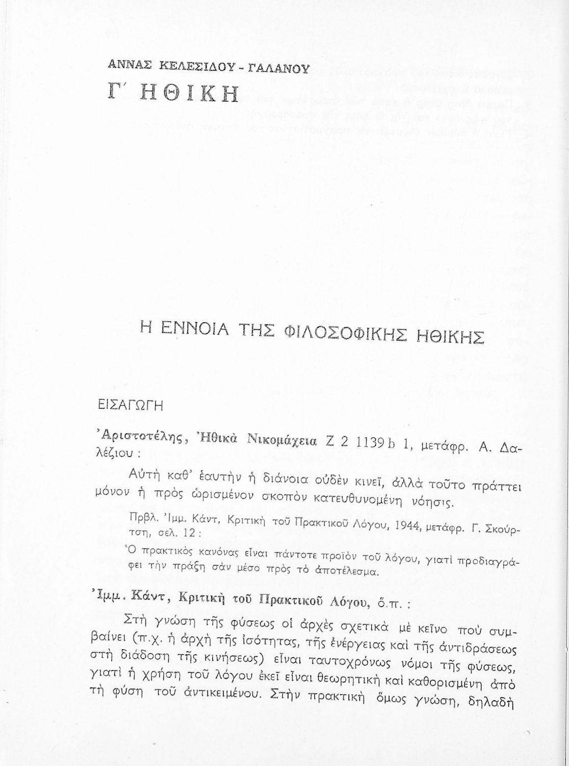 Σχολικό εγχειρίδιο Φιλοσοφίας για την ΣΤ΄ Γυμνασίου που περιέχει αποσπάσματα από διάσημα φιλοσοφικά κείμενα τόσο της ελληνικής αρχαιότητας όσο και της σύγχρονης ευρωπαϊκής σκέψης και θέματα προς συζήτηση. Περιλαμβάνει και λεξιλόγιο φιλοσοφικών όρων και ειδικό κεφάλαιο για τους προσωκρατικούς.