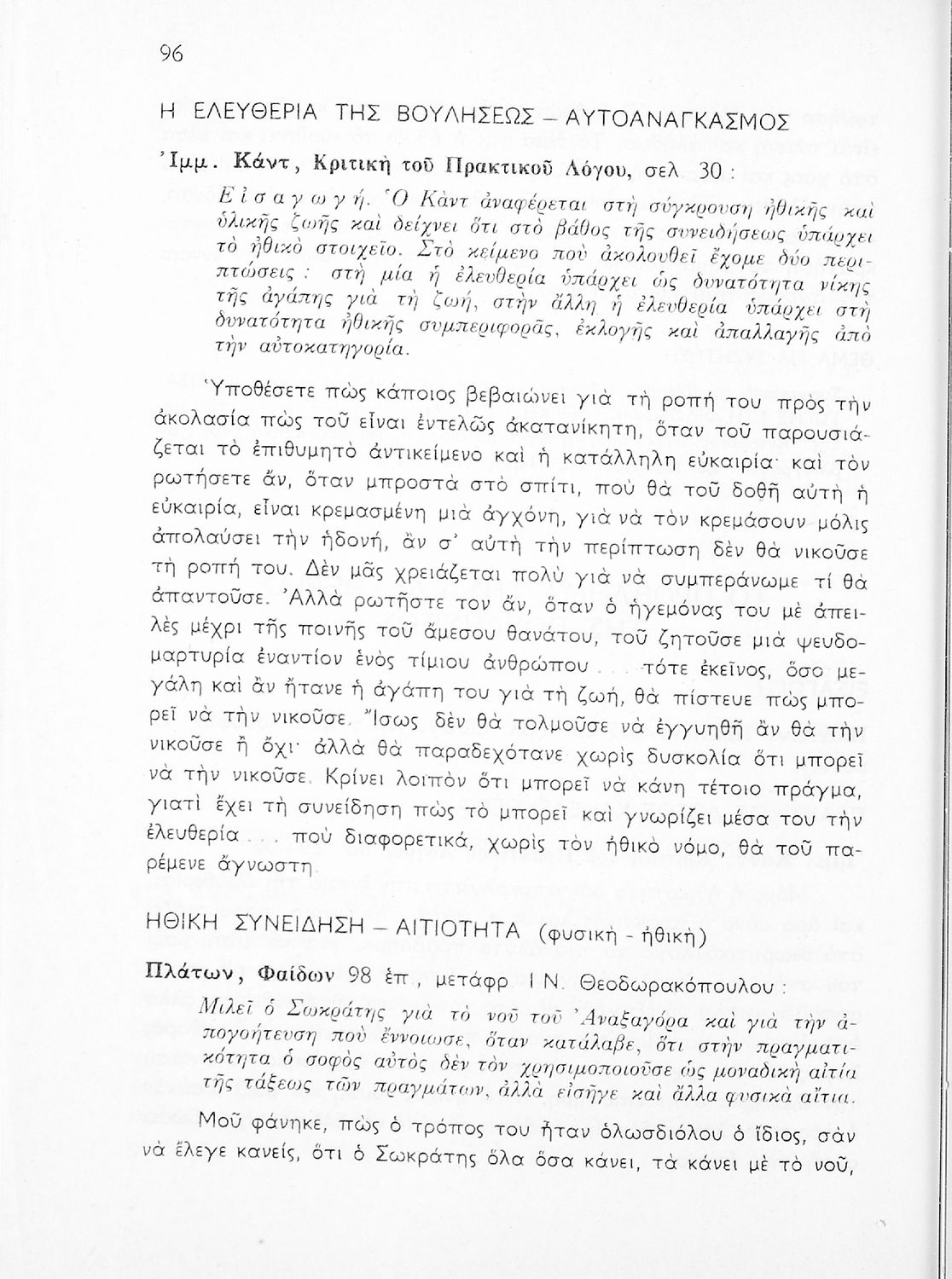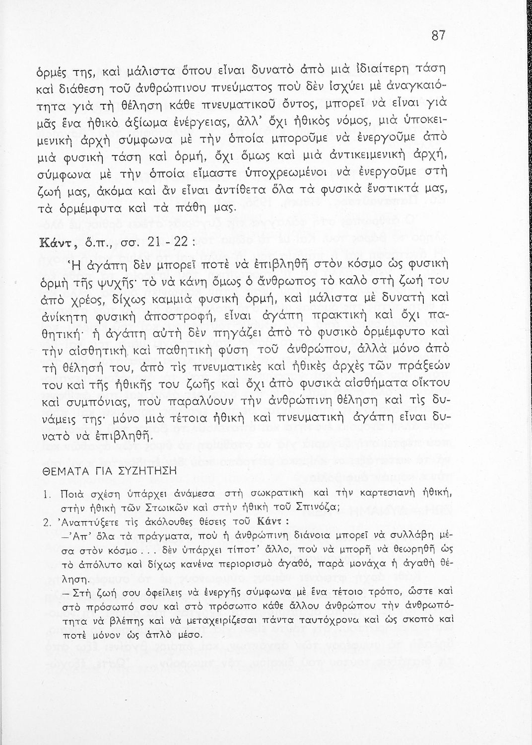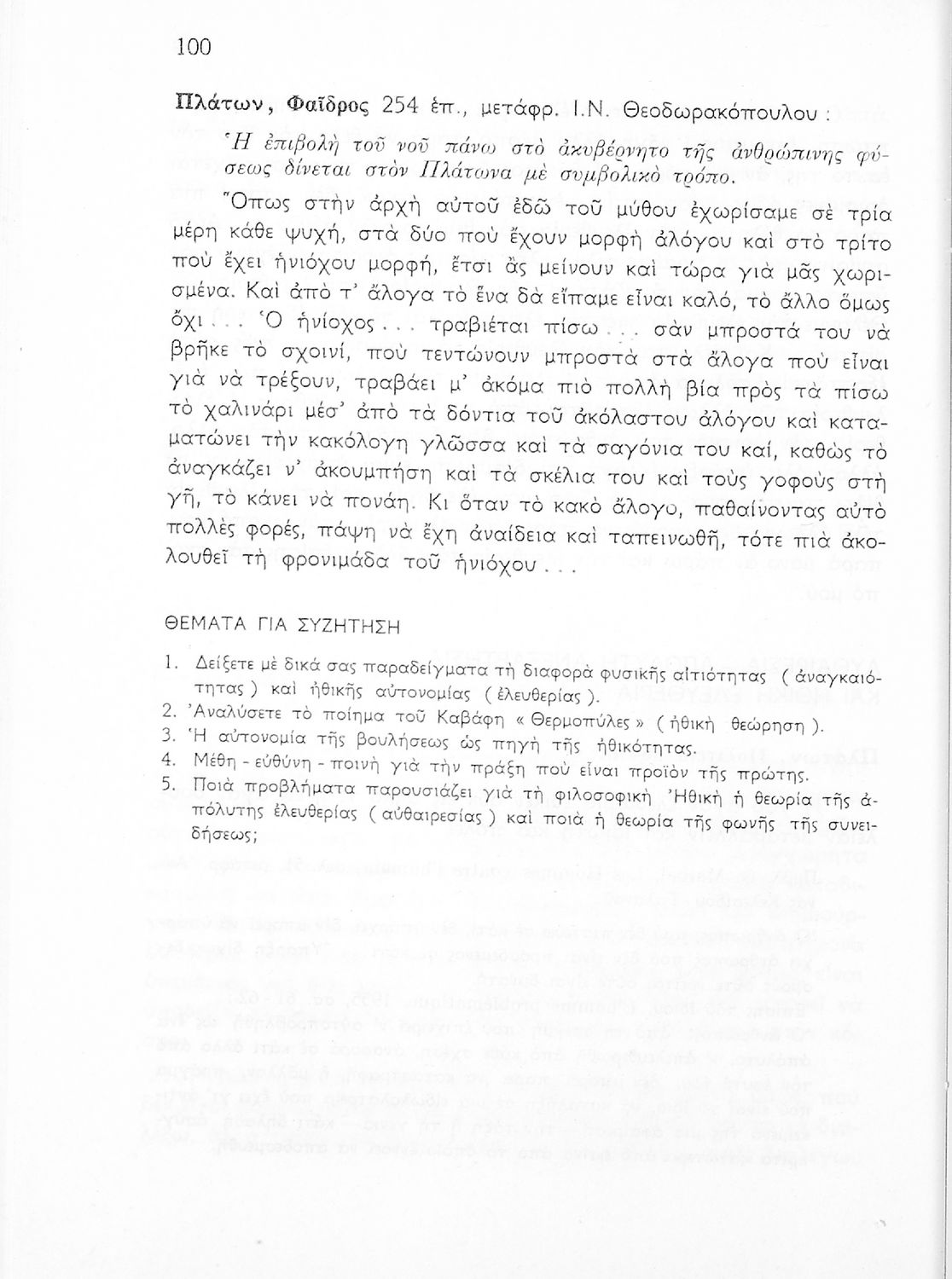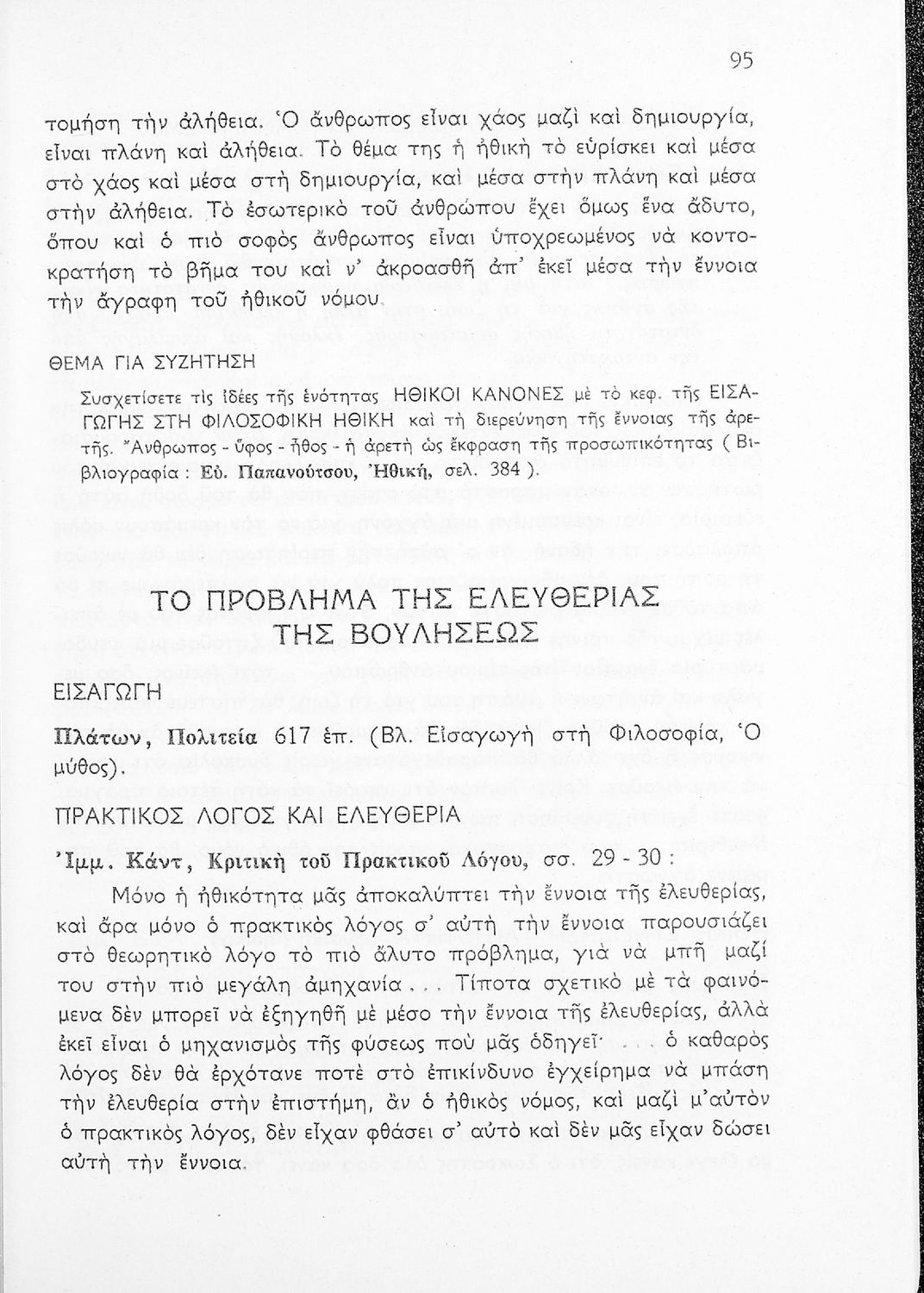 Σχολικό εγχειρίδιο Φιλοσοφίας για την ΣΤ΄ Γυμνασίου που περιέχει αποσπάσματα από διάσημα φιλοσοφικά κείμενα τόσο της ελληνικής αρχαιότητας όσο και της σύγχρονης ευρωπαϊκής σκέψης και θέματα προς συζήτηση. Περιλαμβάνει και λεξιλόγιο φιλοσοφικών όρων και ειδικό κεφάλαιο για τους προσωκρατικούς.