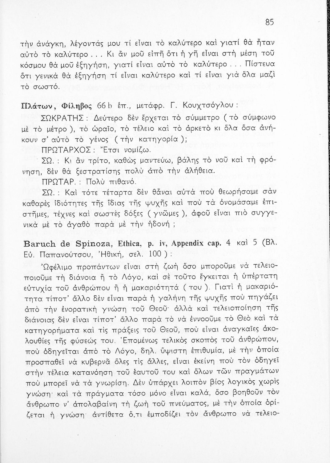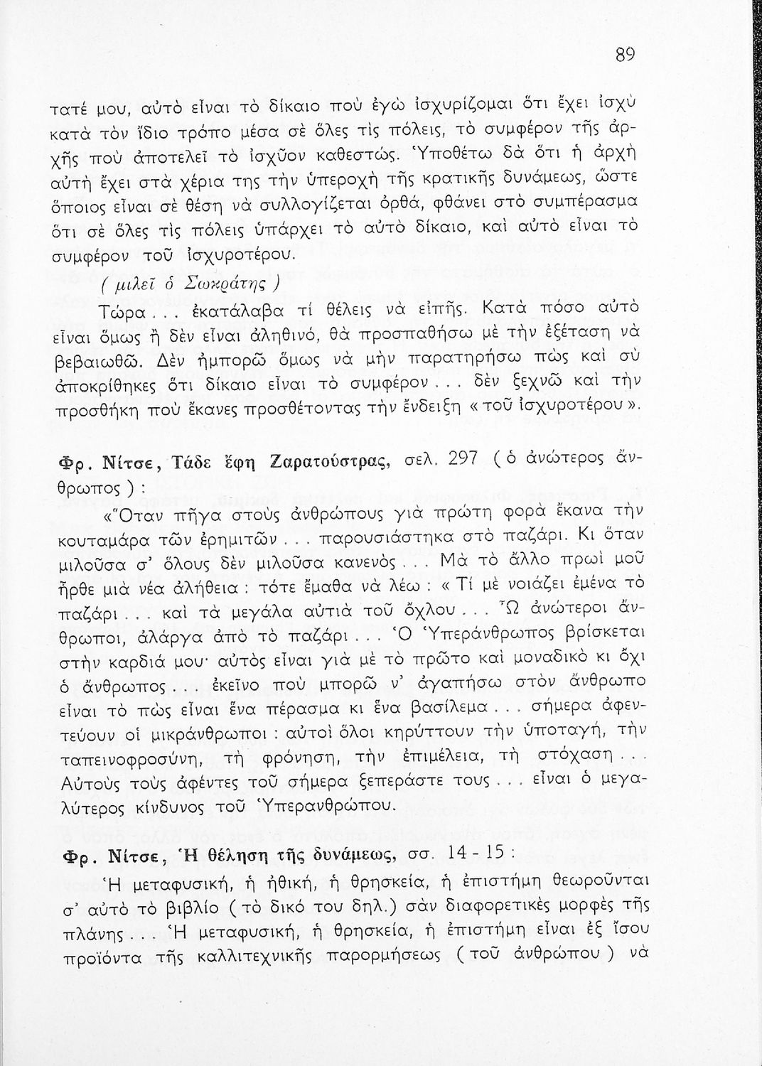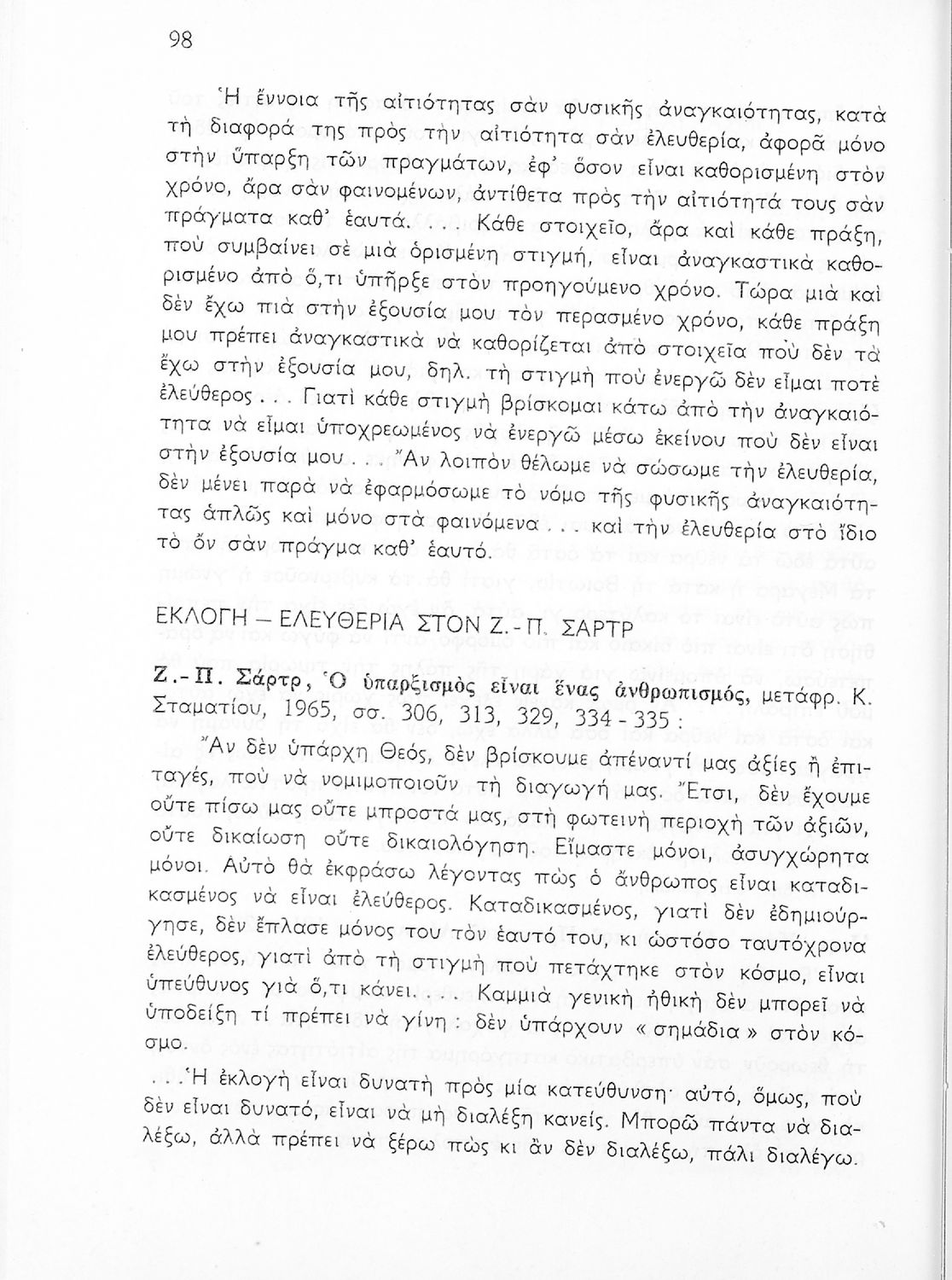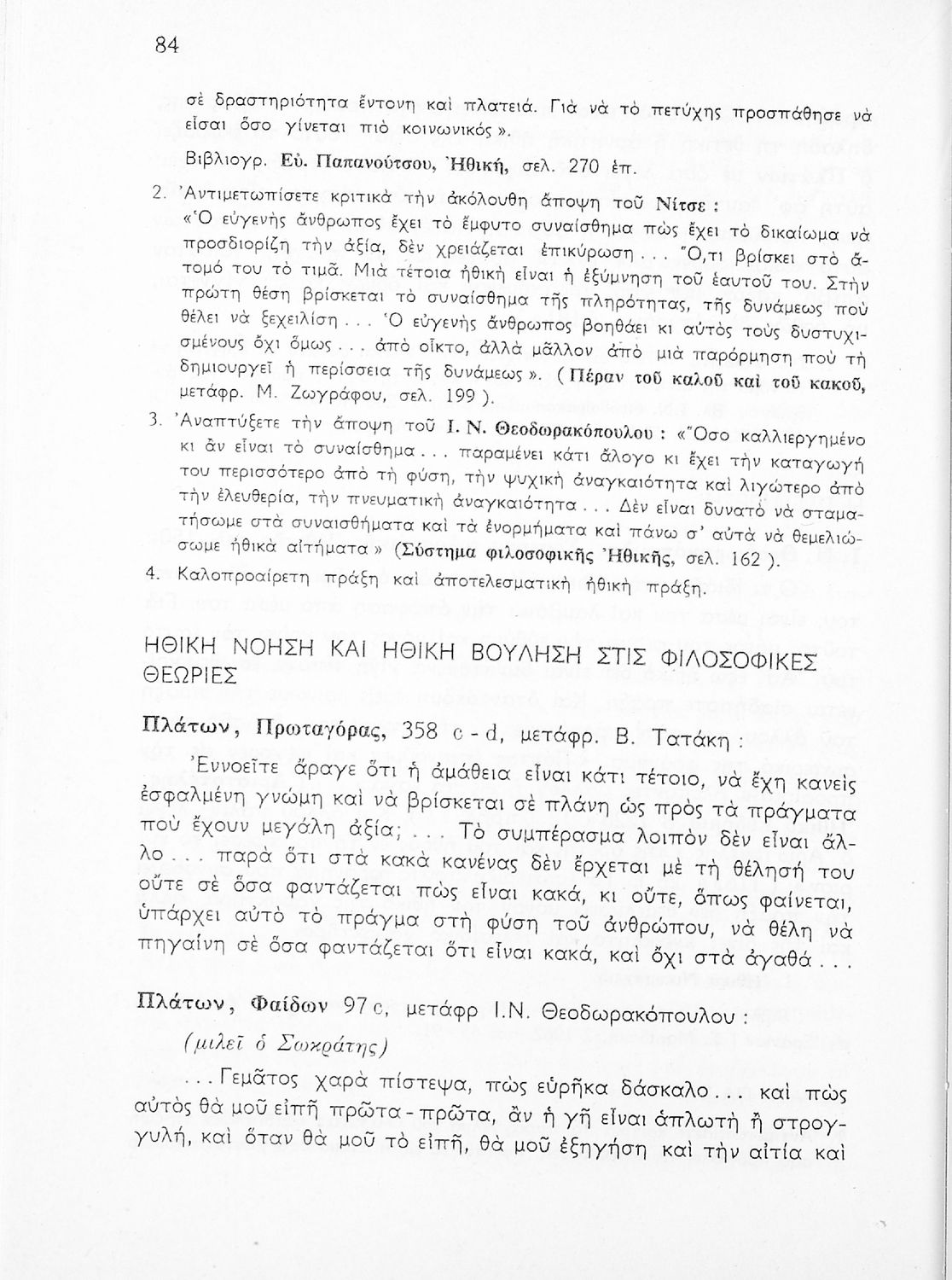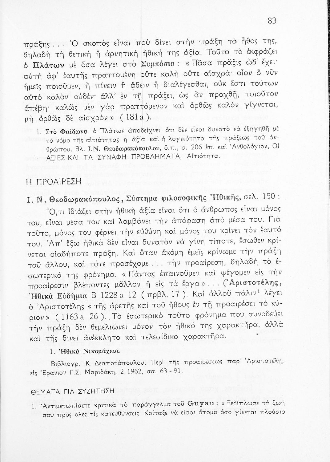 Σχολικό εγχειρίδιο Φιλοσοφίας για την ΣΤ΄ Γυμνασίου που περιέχει αποσπάσματα από διάσημα φιλοσοφικά κείμενα τόσο της ελληνικής αρχαιότητας όσο και της σύγχρονης ευρωπαϊκής σκέψης και θέματα προς συζήτηση. Περιλαμβάνει και λεξιλόγιο φιλοσοφικών όρων και ειδικό κεφάλαιο για τους προσωκρατικούς.