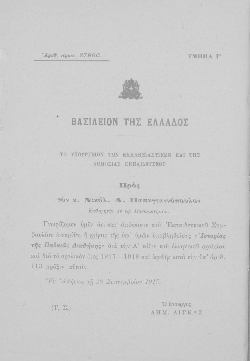 Τίτλος: Ιερά Ιστορία της Παλαιάς Διαθήκης δια την πρώτην τάξιν του Ελληνικού Σχολείου