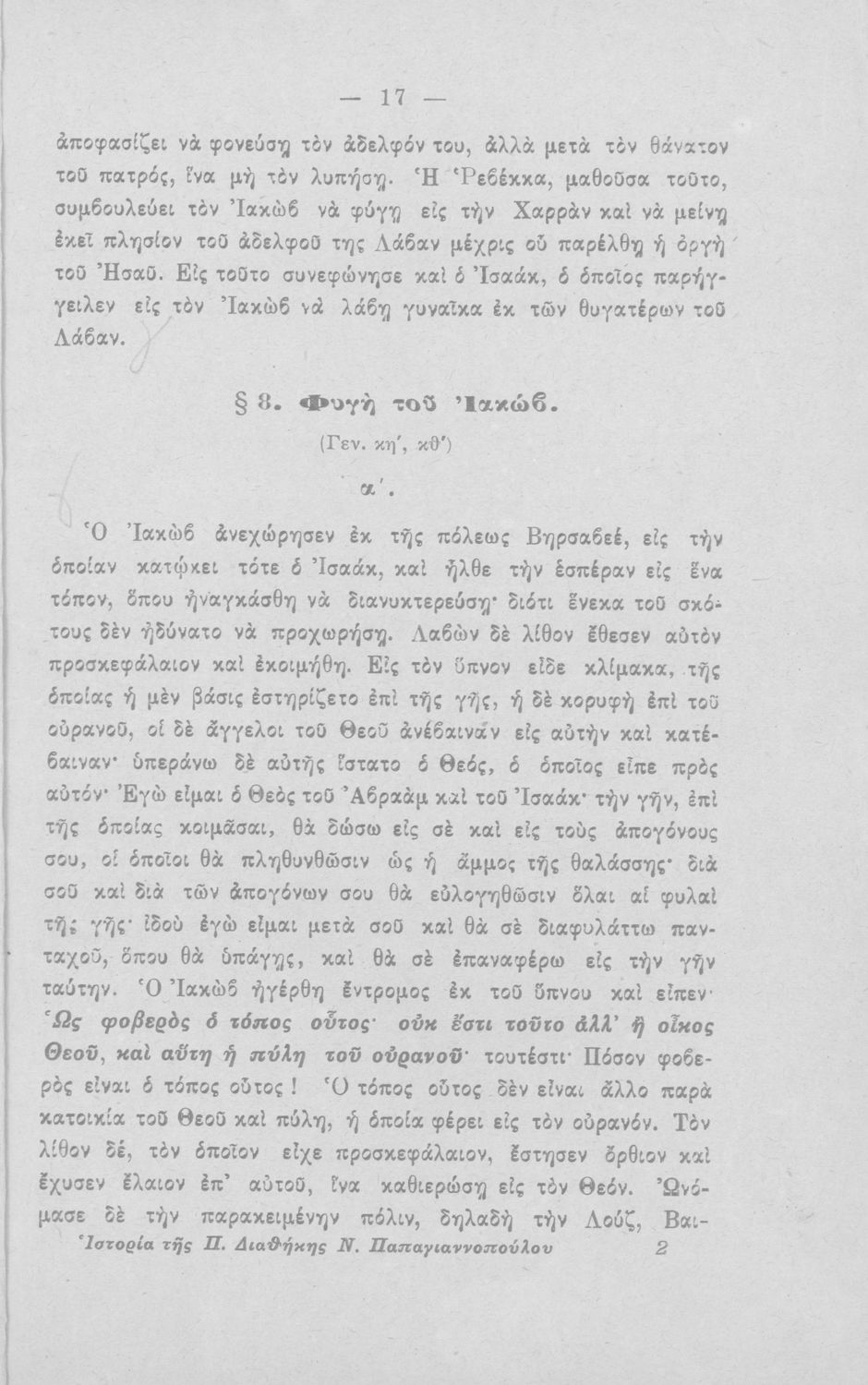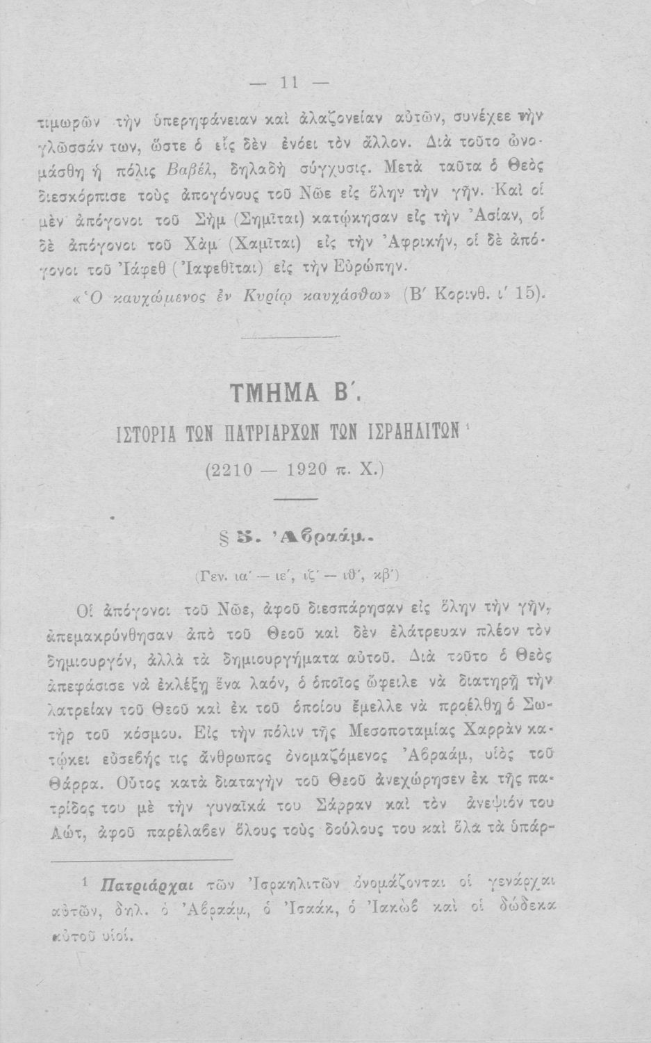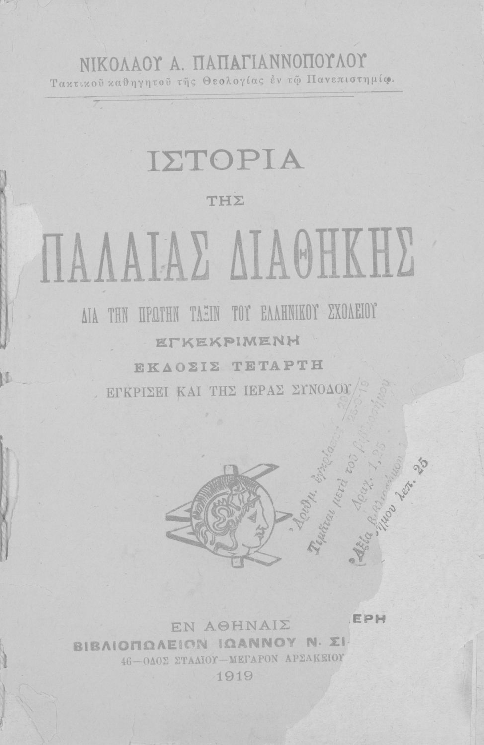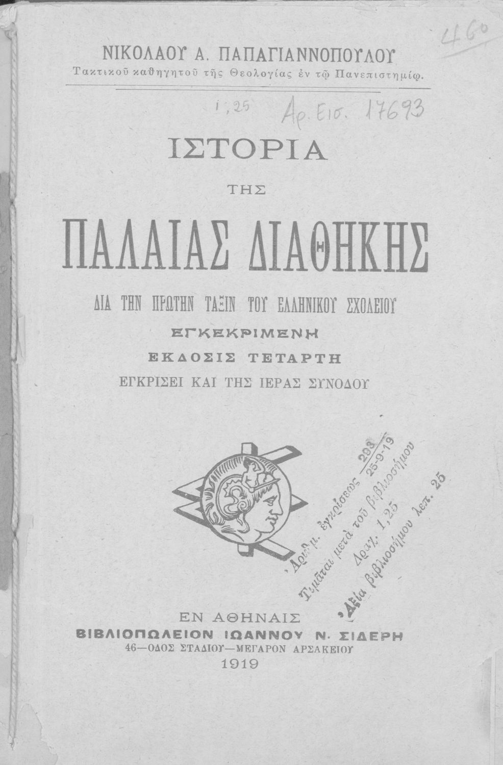 Βαθμίδα εκπαίδευσης: Δευτεροβάθμια Τάξη: Α' Ελληνικού Σχολείου Μάθημα: Θρησκευτικά Γλώσσα: Καθαρεύουσα Παρουσίαση περιεχομένου: Σχολικό εγχειρίδιο Θρησκευτικών Α΄ Ελληνικού Σχολείου που συνιστά μία εξιστόρηση της Παλαιάς Διαθήκης από τη δημιουργία του κόσμου ως τους Μακκαβαίους. |