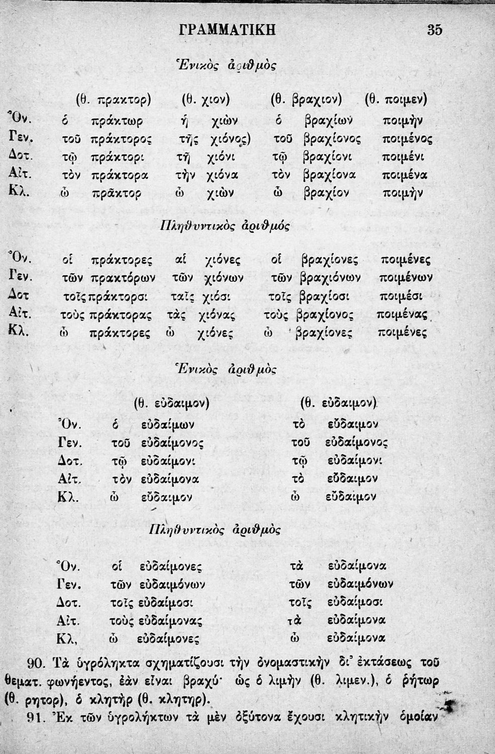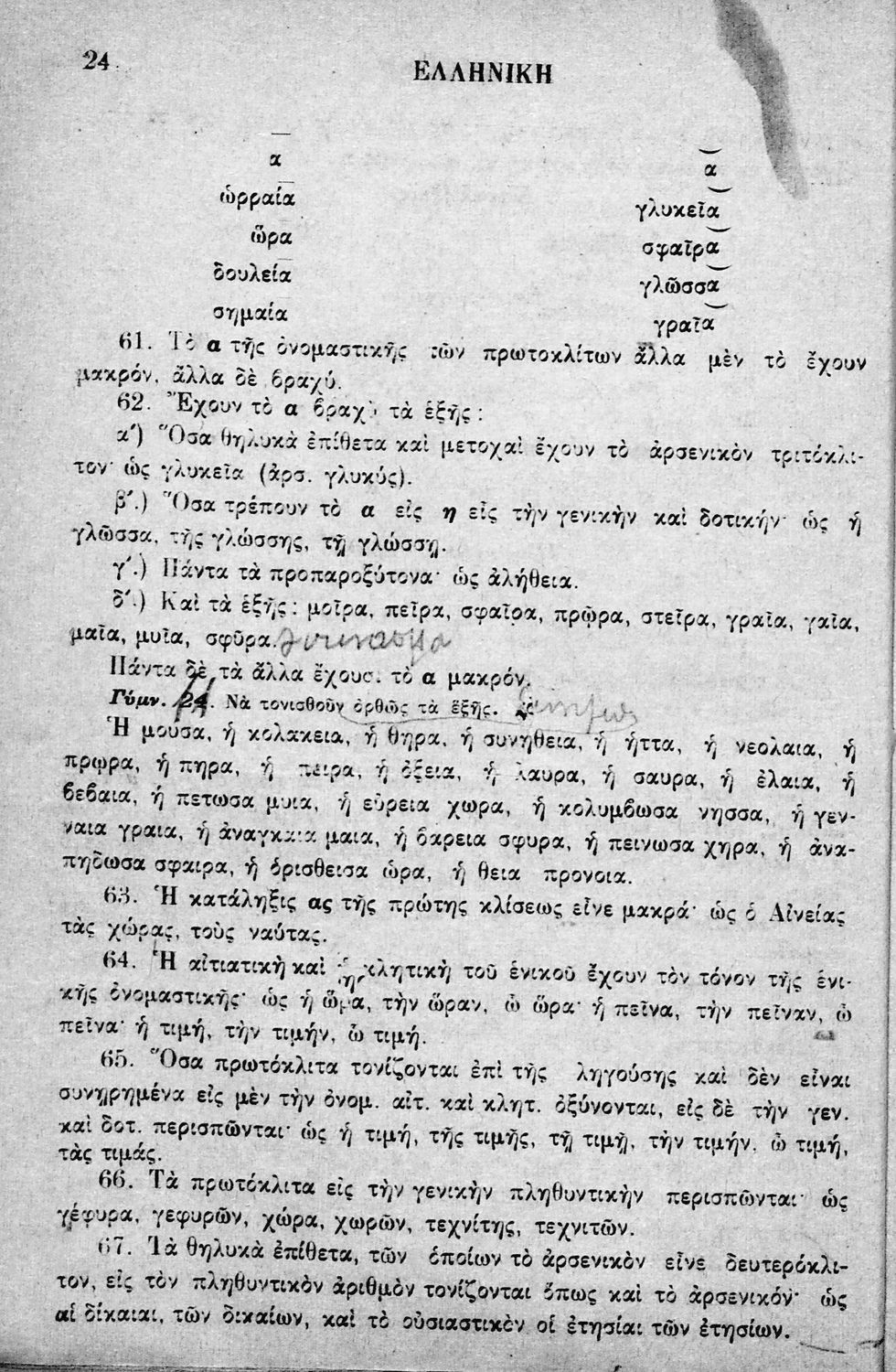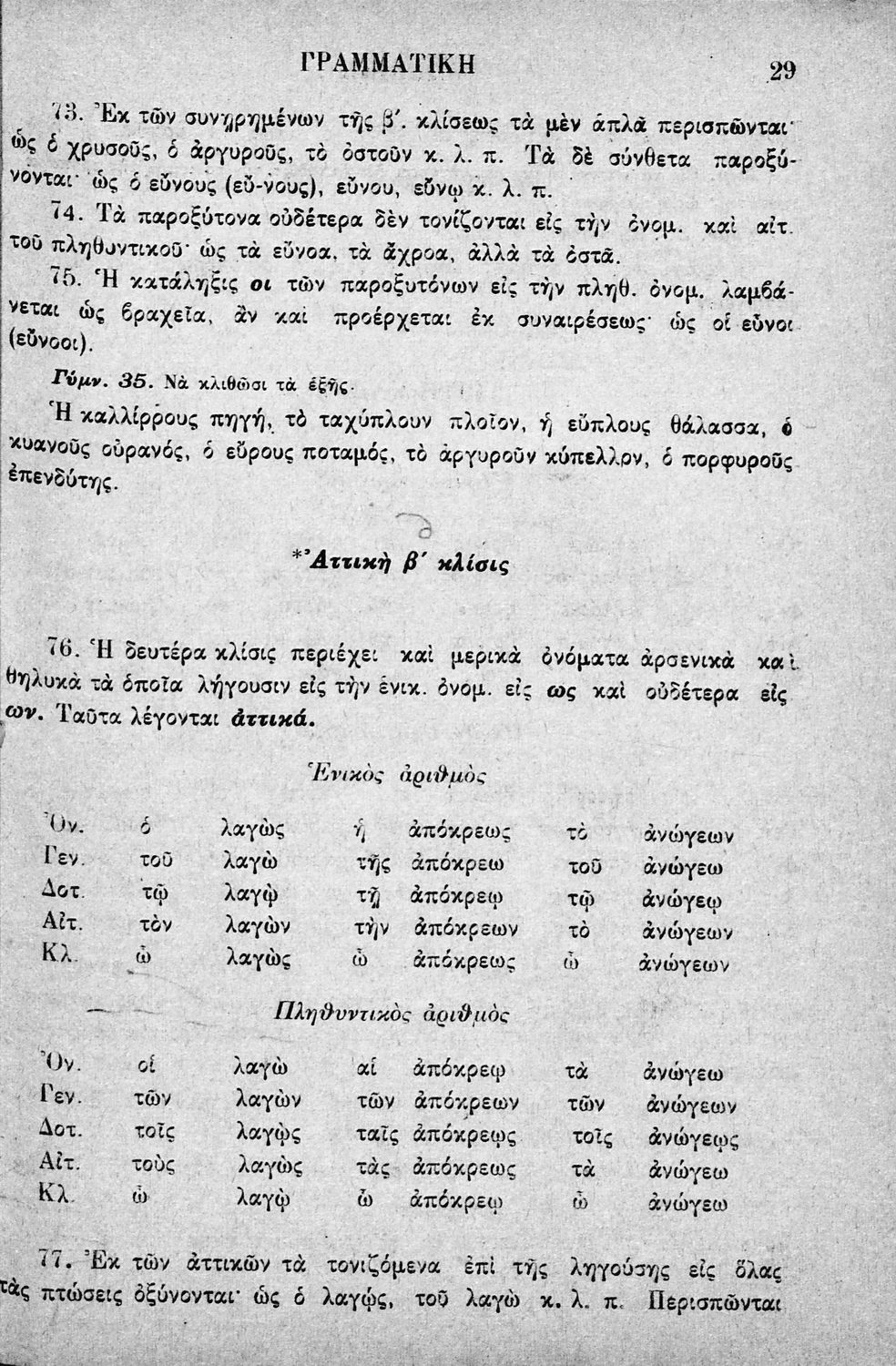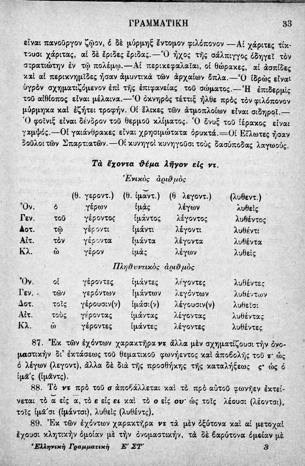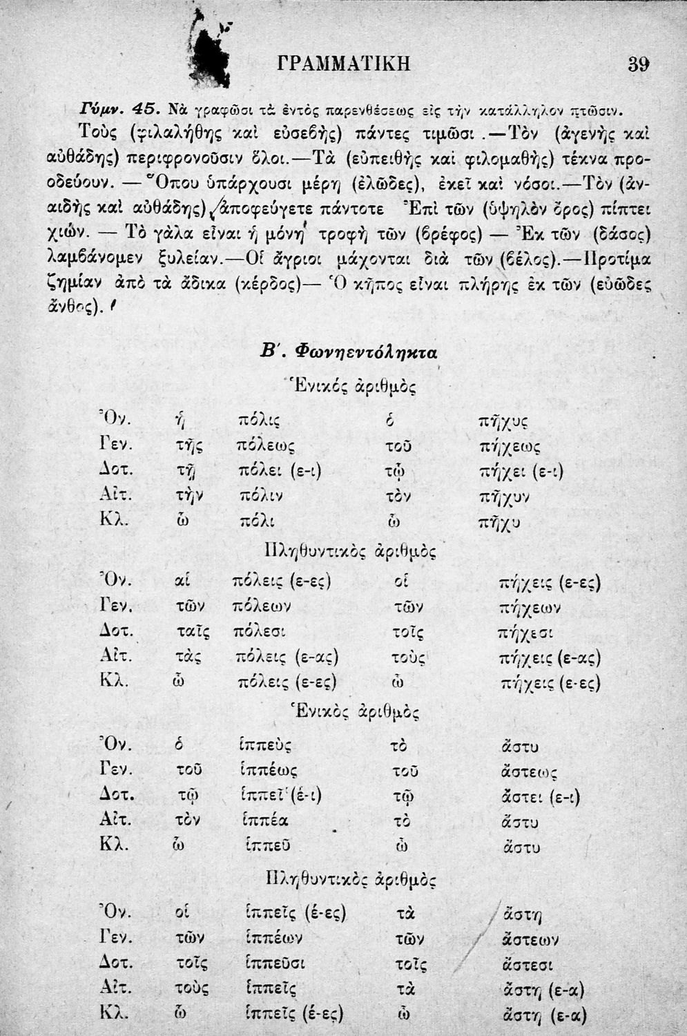 Σχολικό εγχειρίδιο Αρχαίων Ελληνικών Δημοτικού που περιλαμβάνει τους κανόνες γραμματικής και είναι χωρισμένο σε φθογγολογικό, τυπικό και ετυμολογικό μέρος.