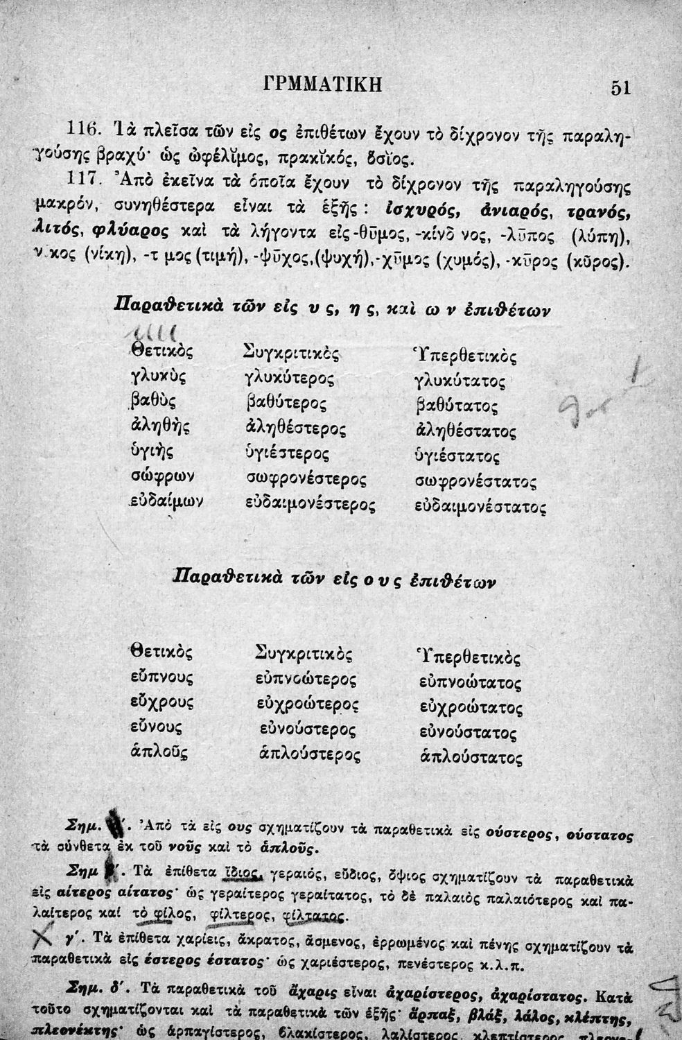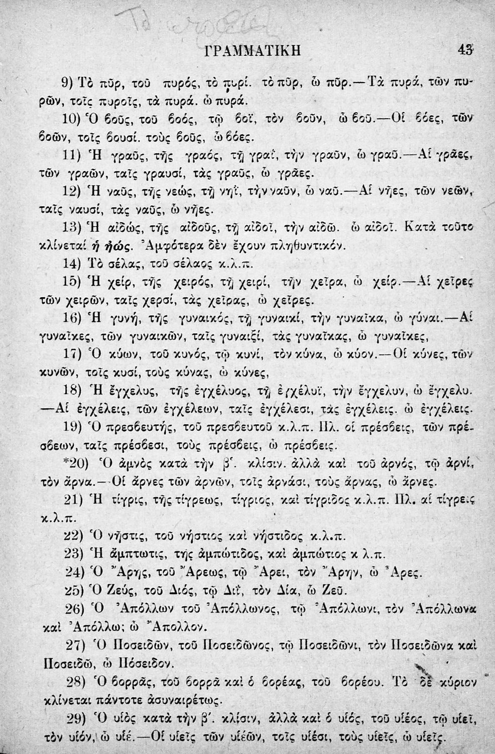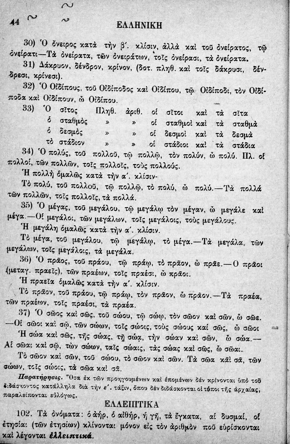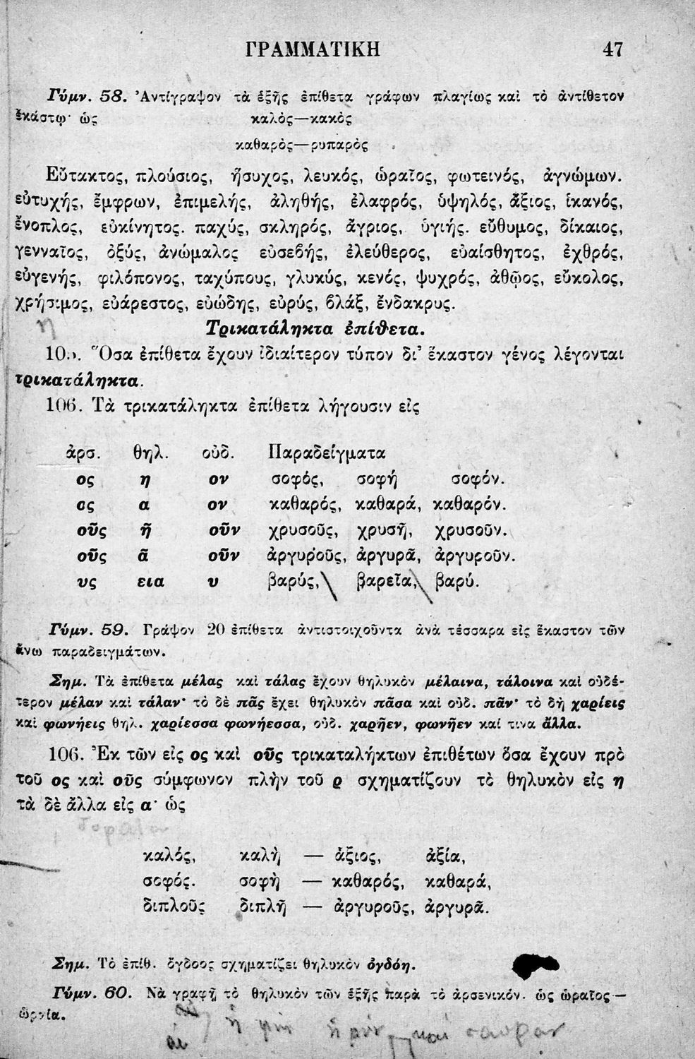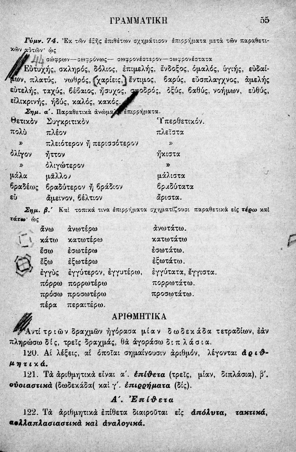 Σχολικό εγχειρίδιο Αρχαίων Ελληνικών Δημοτικού που περιλαμβάνει τους κανόνες γραμματικής και είναι χωρισμένο σε φθογγολογικό, τυπικό και ετυμολογικό μέρος.