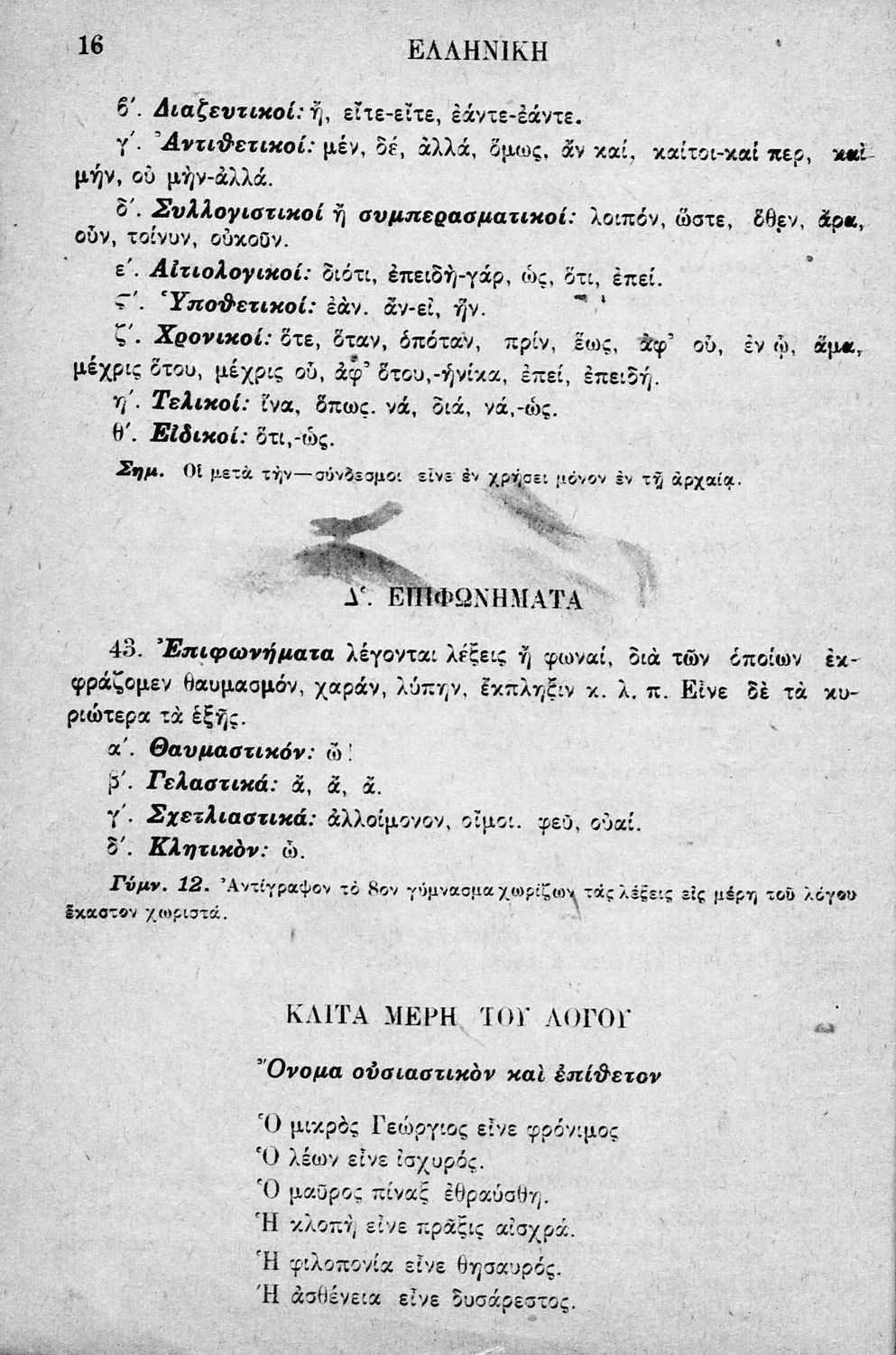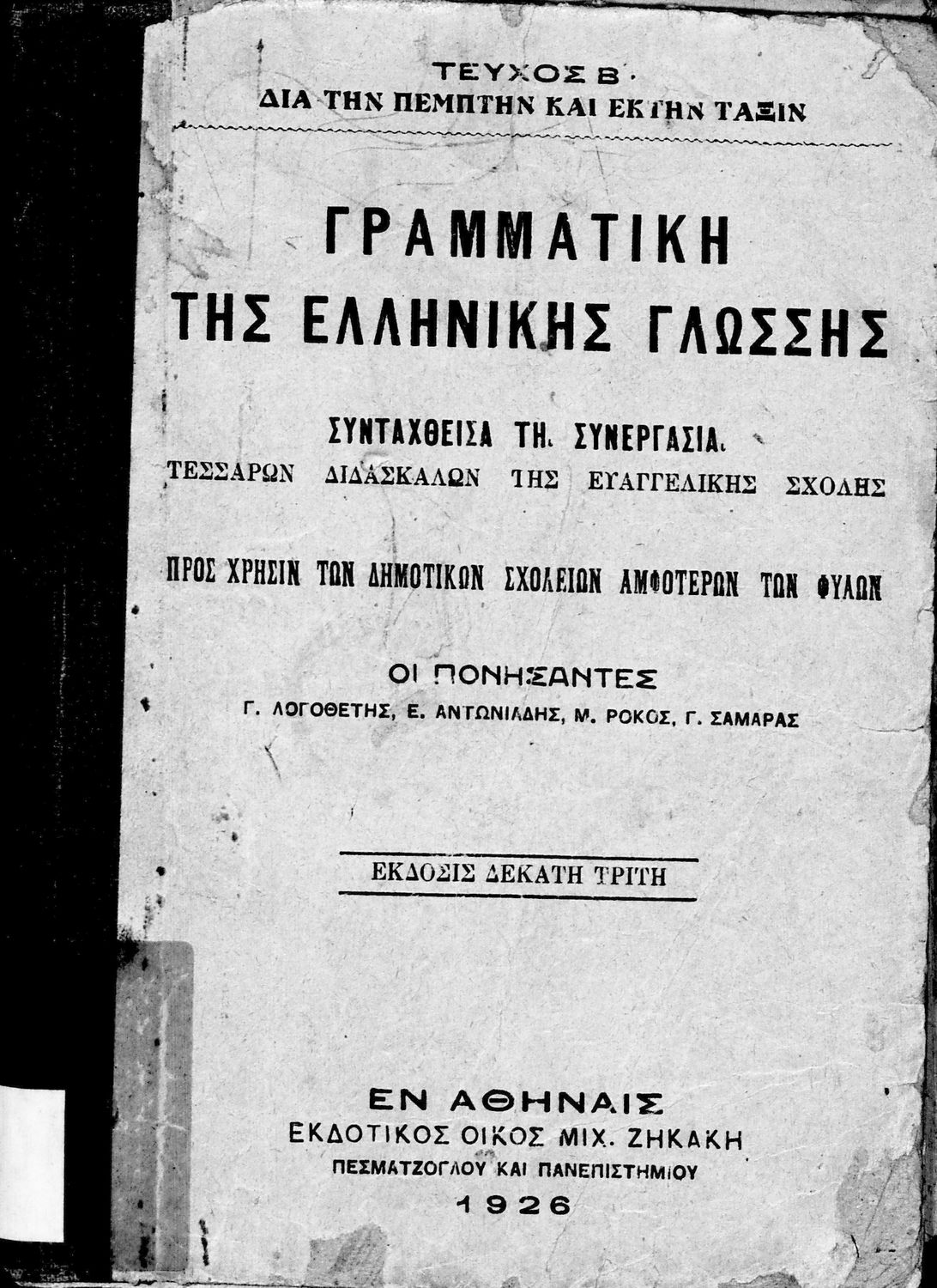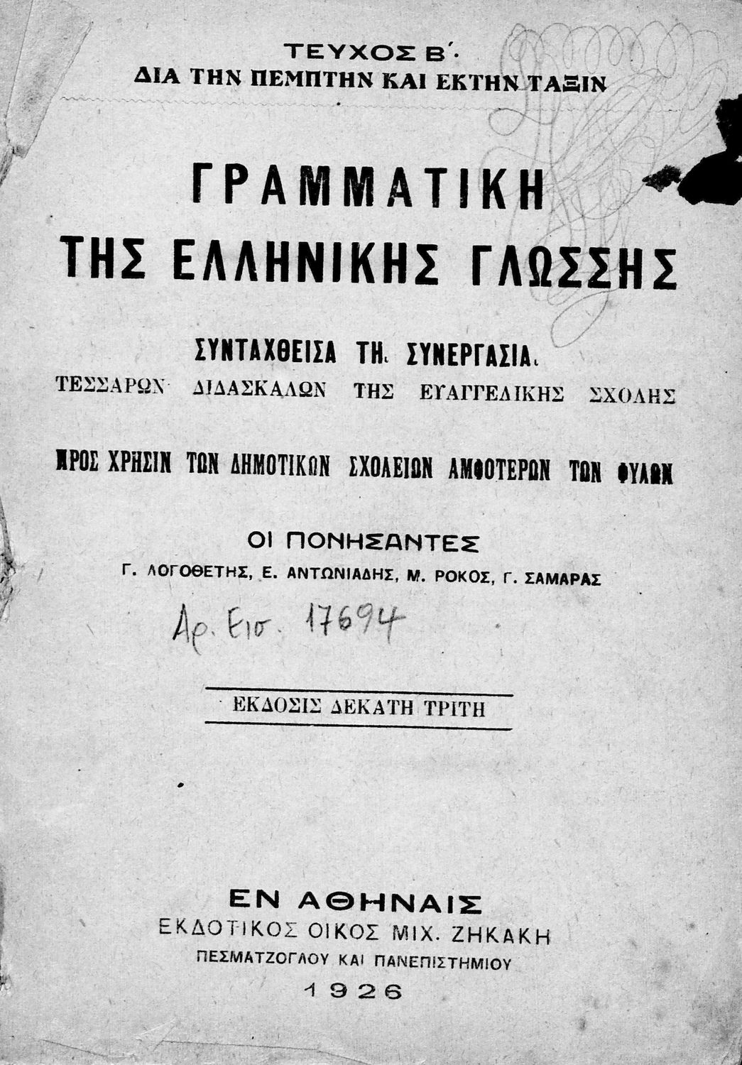 Σχολικό εγχειρίδιο Γ΄ και Δ΄ Δημοτικού που περιέχει τη γραμματικής της νέας ελληνικής. Την έκδοση επιμελήθηκε ο Γ. Λογοθέτης, τέως διευθυντής του επταταξίου δημ. Τμήμ.της Ευαγγελικής Σχολής.