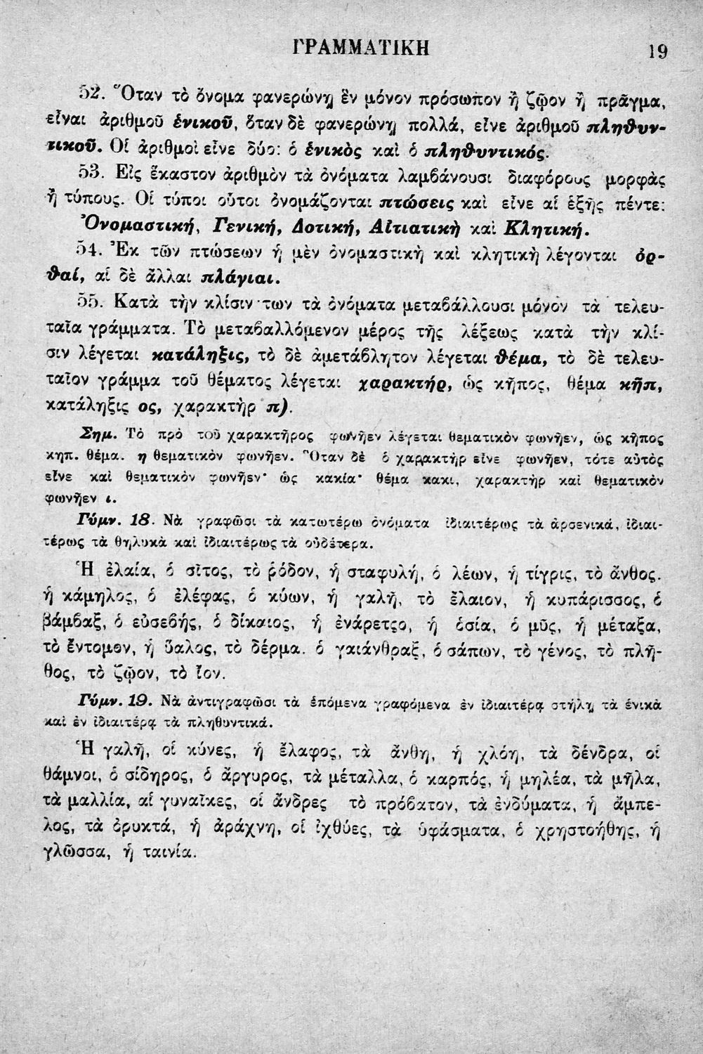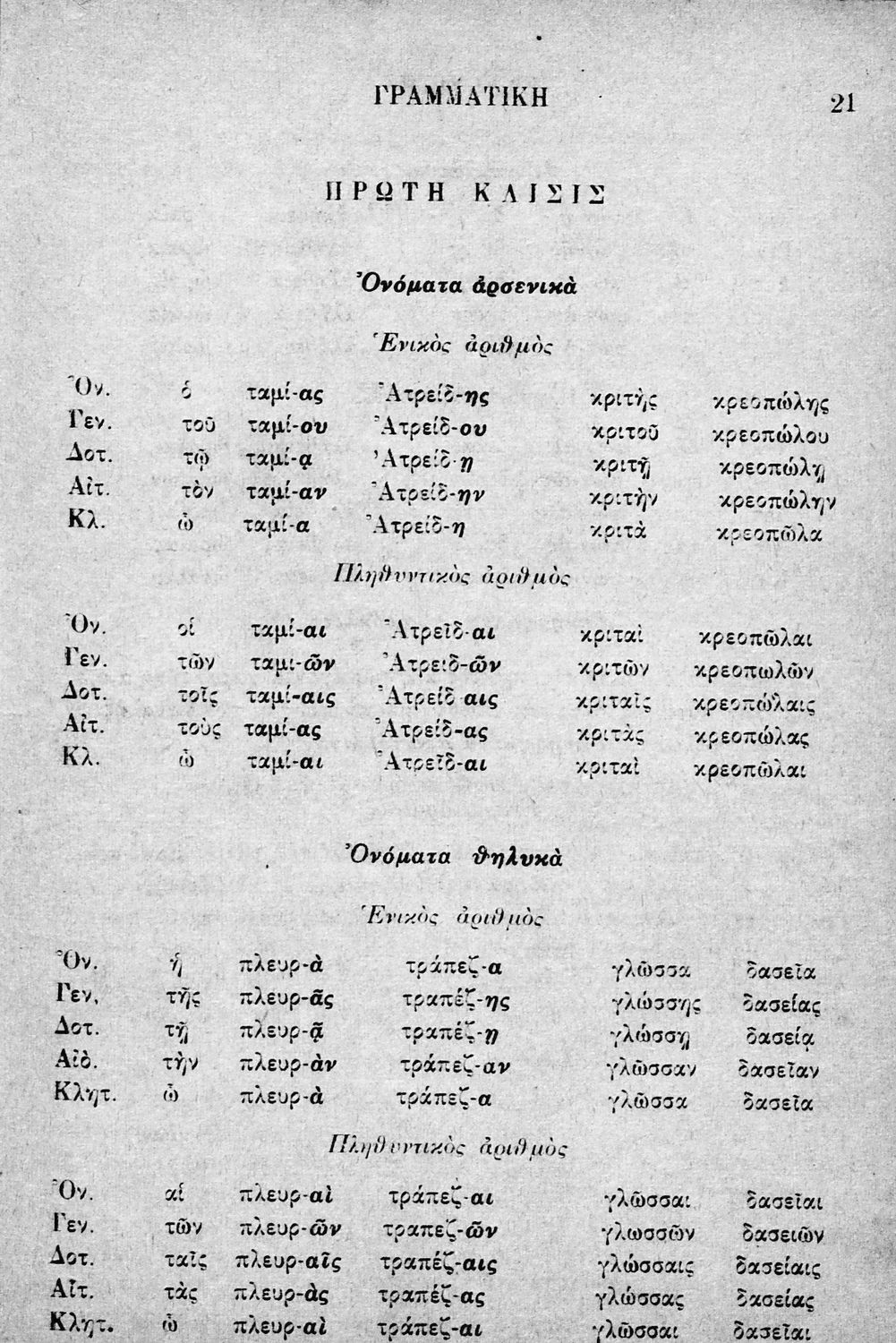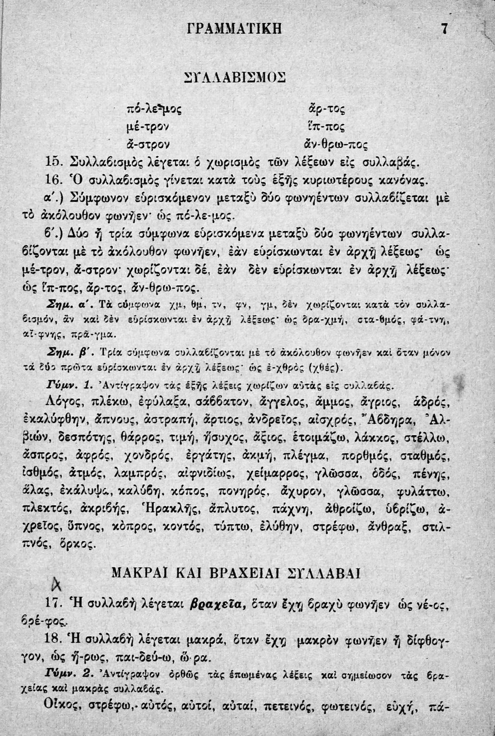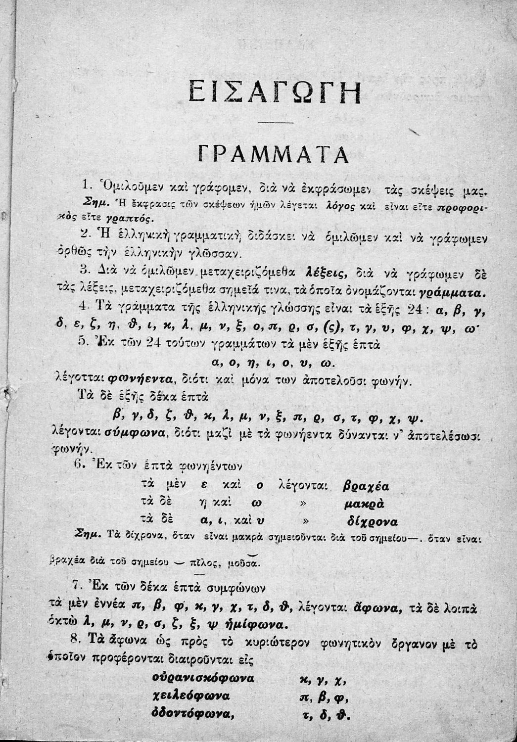 Σχολικό εγχειρίδιο Αρχαίων Ελληνικών Δημοτικού που περιλαμβάνει τους κανόνες γραμματικής και είναι χωρισμένο σε φθογγολογικό, τυπικό και ετυμολογικό μέρος.