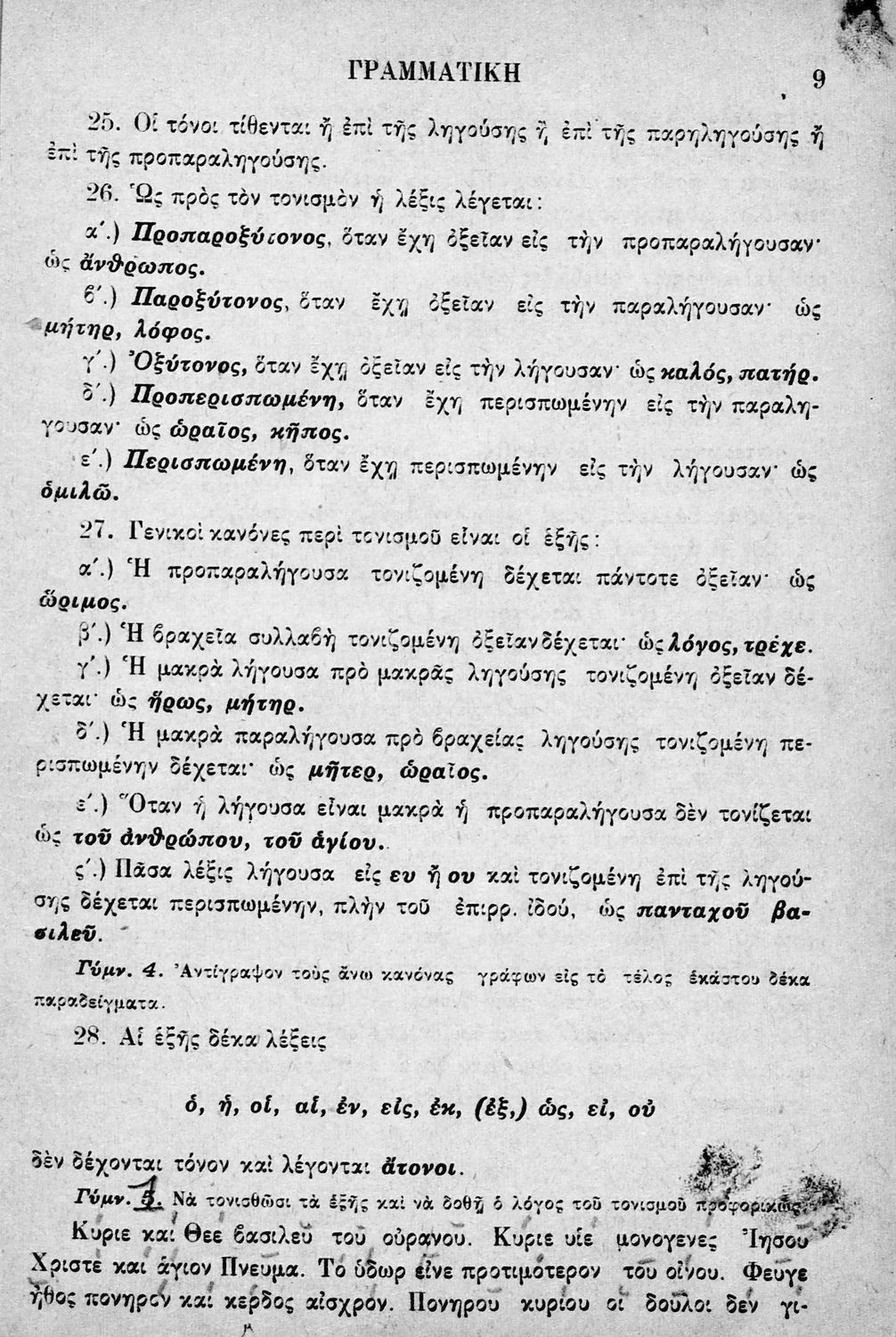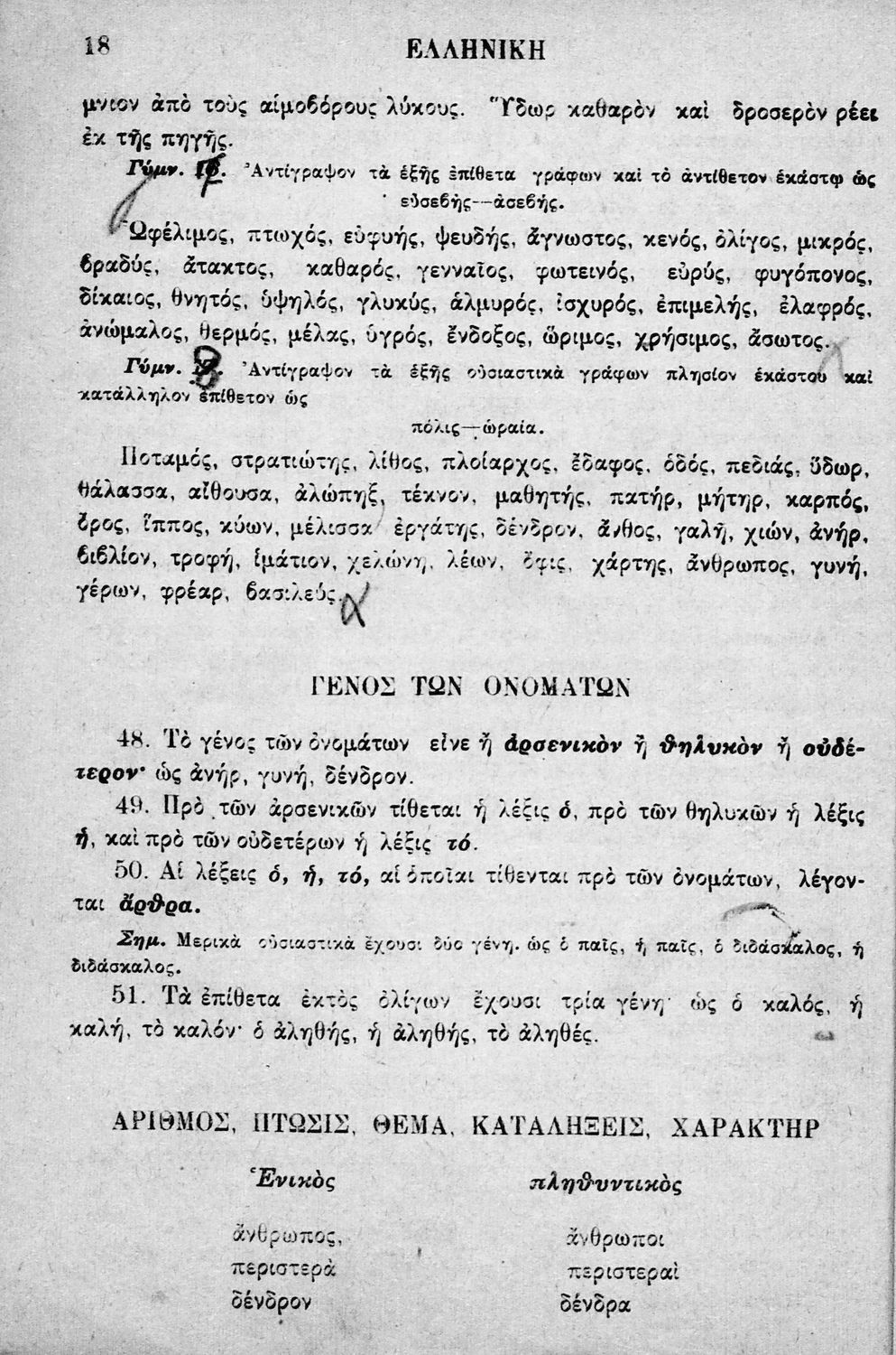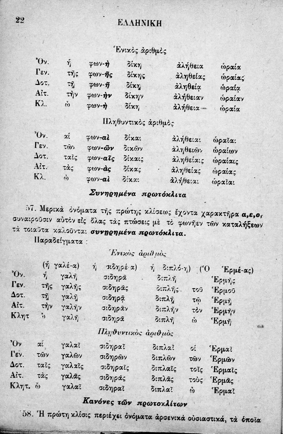 Σχολικό εγχειρίδιο Αρχαίων Ελληνικών Δημοτικού που περιλαμβάνει τους κανόνες γραμματικής και είναι χωρισμένο σε φθογγολογικό, τυπικό και ετυμολογικό μέρος.