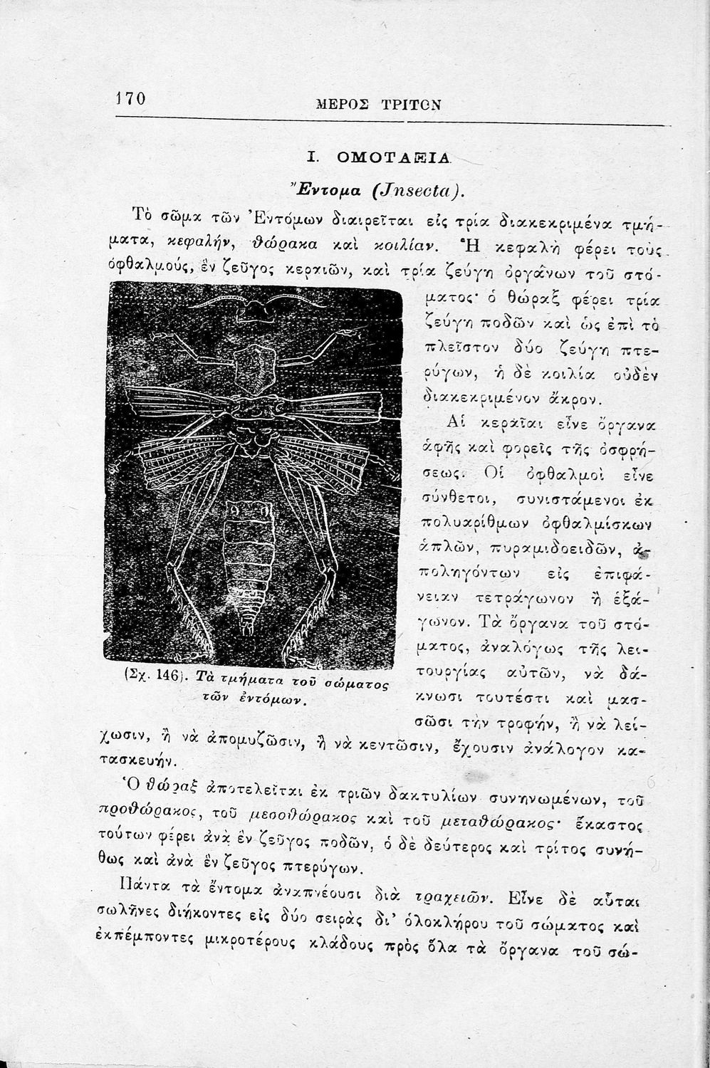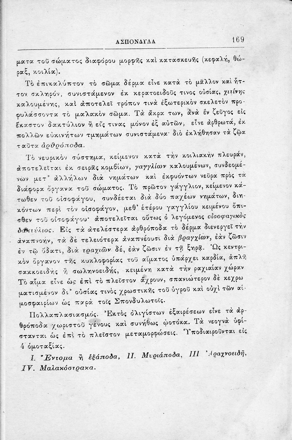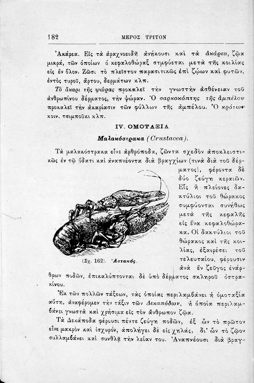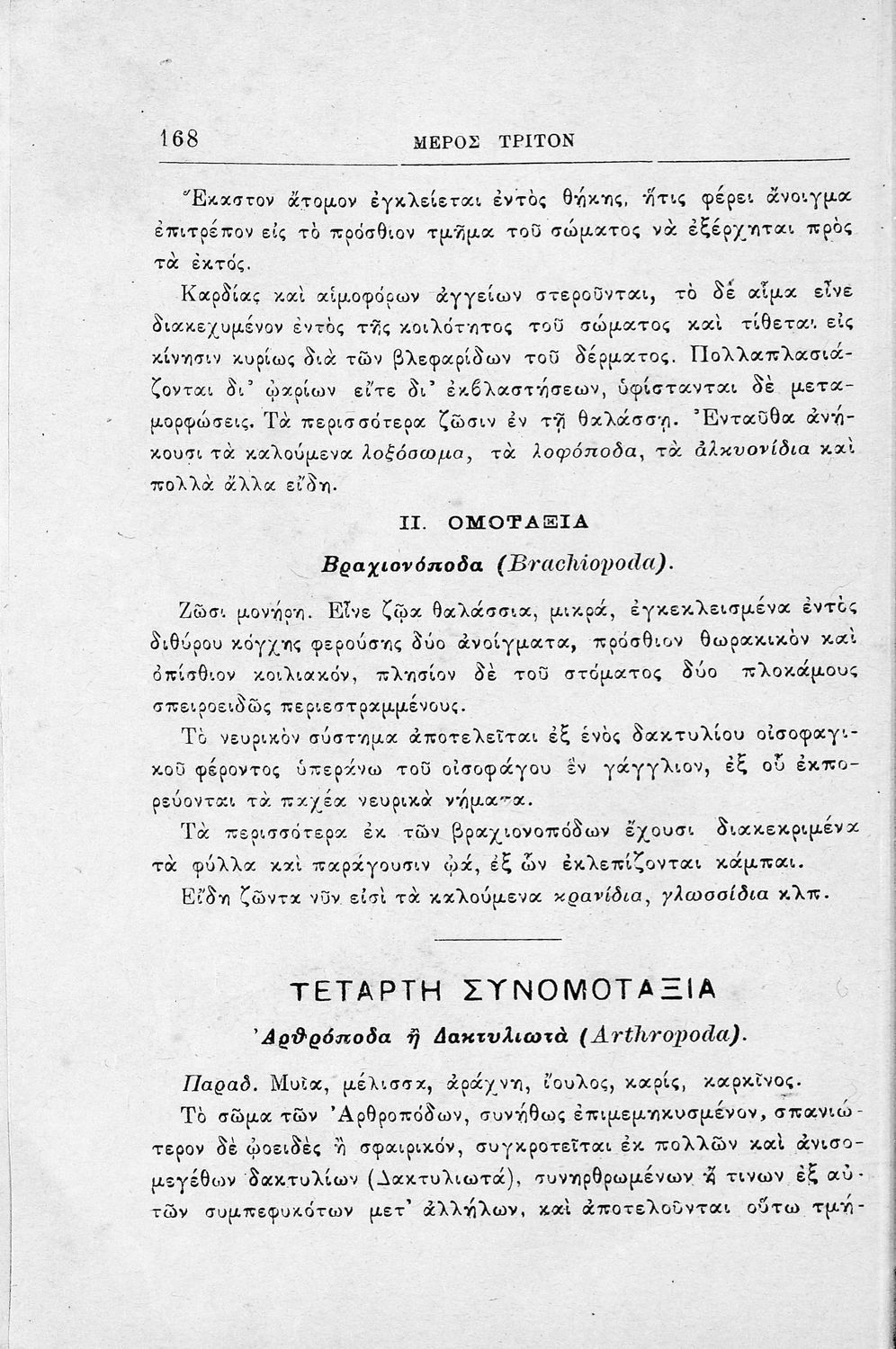 Σχολικό εγχειρίδιο Ζωολογίας για τα Γυμνάσια, τα Παρθεναγωγεία και τα Διδασκαλεία που εστιάζει στην ανθρώπινη φυσιολογία και παρουσιάζει τα διάφορα ζώα ανάλογα με την συνομοταξία στην οποία ανήκουν.