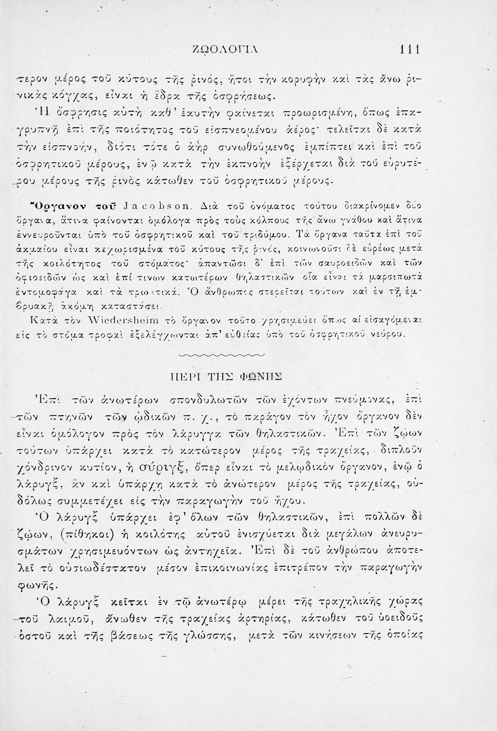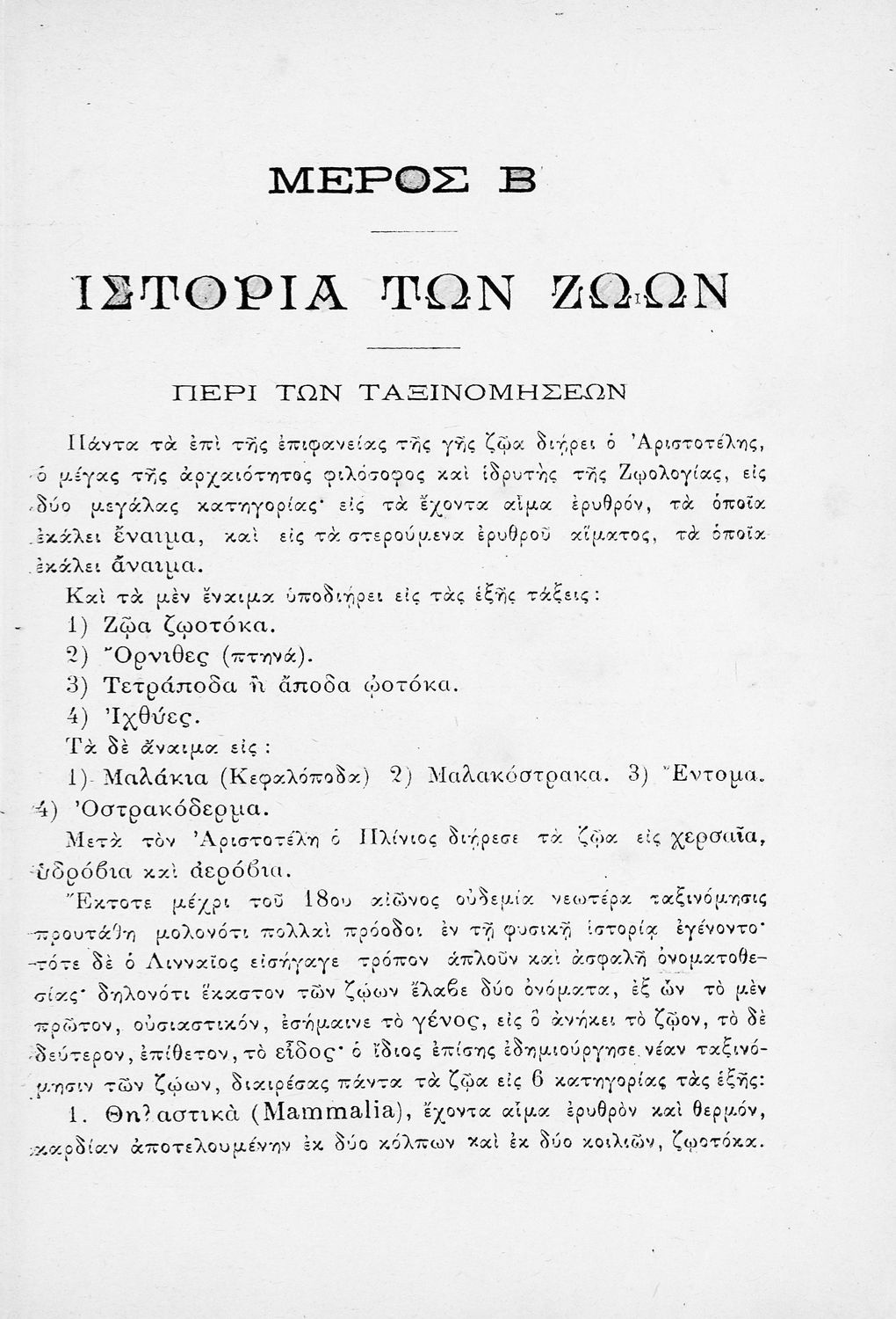 Σχολικό εγχειρίδιο Ζωολογίας για τα Γυμνάσια και τα Διδασκαλεία χωρισμένο σε δυο ενότητες: την ανατομία και φυσιολογία του ανθρώπου και την ιστορία των ζώων. Ο συγγραφέας ήταν καθηγητής ζωολογίας στο Εθνικό Πανεπιστήμιο.