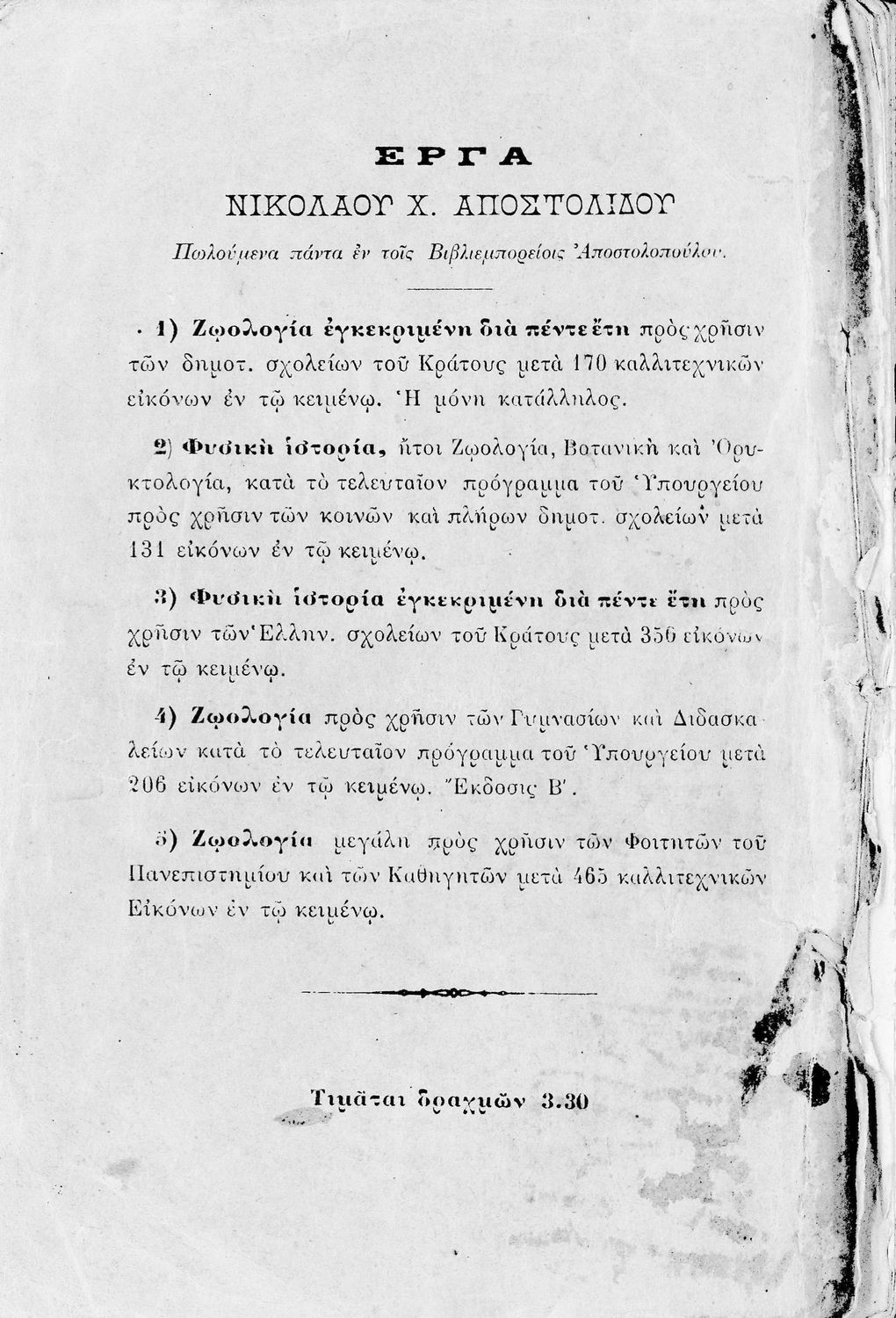 Τίτλος: Στοιχειώδης ζωολογία περιλαμβάνουσα συντόμως την ανατομικήν, την ιστολογίαν και την φυσιολογίαν του ανθρώπου και σύντομον φυσικήν ιστορίαν των ζώων προς χρήσιν των Γυμνασίων και Διδασκαλείων