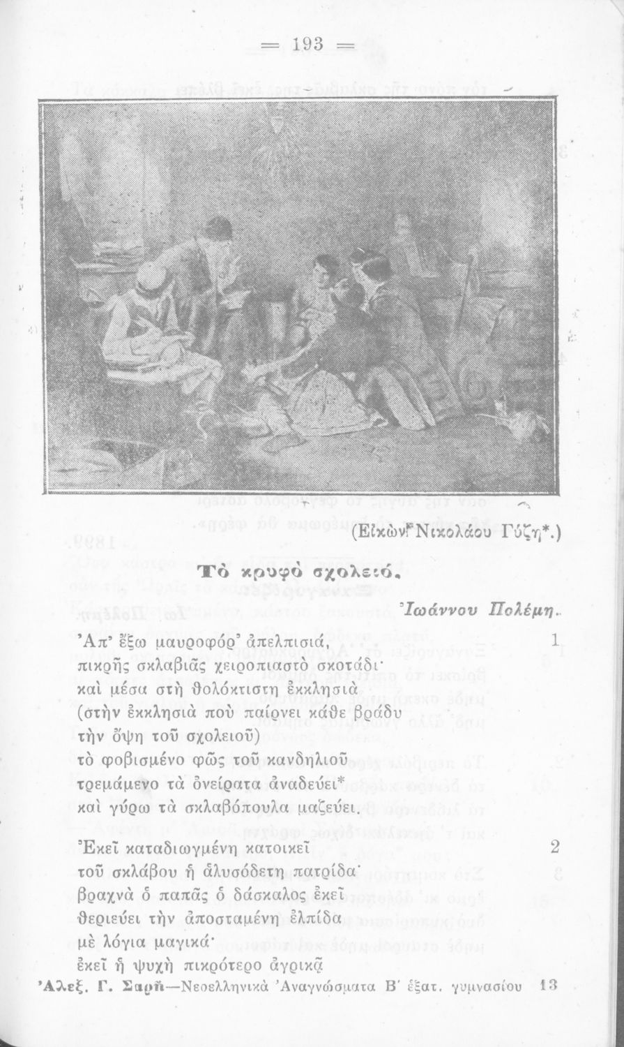 Σχολικό εγχειρίδιο Νέων Ελληνικών Γ' Ελληνικού Σχολείου που περιλαμβάνει κείμενα Ελλήνων συγγραφέων και δημοτικά τραγούδια εμπνευσμένα από την σύγχρονη ελληνική ιστορία, την ελληνική φύση και τη ζωή στην ...