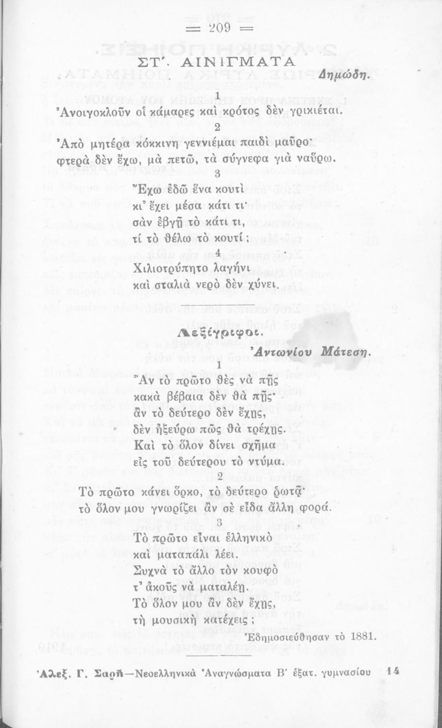 LDR 01781 2200217 4500 035 ## _a01-17700 040 ## _aΙνστιτούτο Εκπαιδευτικής Πολιτικής 041 ## _ael 100 ## _aΑλέξανδρος Γ. Σαρής 110 ## _a17700 245 0# _aΝεοελληνικά αναγνώσματα δια τους μαθητάς της Β΄ τάξεως των Εξαταξίων Γυμνασίων και Ημιγυμνασίων και της αντιστοίχου τάξεως των λοιπών σχολείων της Μέσης Εκπαιδεύσεως. 250 ## _a7η Έκδοση 260 ## _aΑθήνα _bΙωάννης Ν. Σιδέρης _c1930 300 ## _a288 _bΕικόνες (ασπρόμαυρες), Σκίτσα (ασπρόμαυρα) _c20 520 ## _aΣχολικό εγχειρίδιο Νέων Ελληνικών Β΄ Γυμνασίου που περιλαμβάνει ποιήματα και πεζά Ελλήνων συγγραφέων και δημοτικά τραγούδια εμπνευσμένα από την σύγχρονη ελληνική ιστορία, τη βυζαντινή ιστορία, την ελληνική φύση και τη ζωή στην ύπαιθρο, την οικογενειακή και κοινωνική ζωή και τη θρησκευτική παράδοση. Περιέχει και παράρτημα με βιογραφίες των συγγραφέων και λεξιλόγιο. 521 ## _aΒ' Γυμνασίου 522 ## _aΕλλάδα 546 ## _aΚαθαρεύουσα / Δημοτική 563 ## _aΣκληρό Εξώφυλλο 583 ## _a20986/2-8-1930 _c1930 650 #4 _aΔροσίνης _aΚορνάρος _aΠαλαμάς _aΠαπαρρηγόπουλος _aΣολωμός
