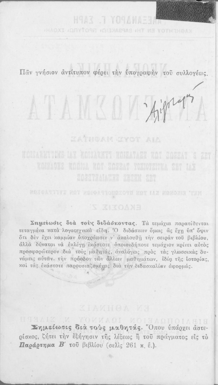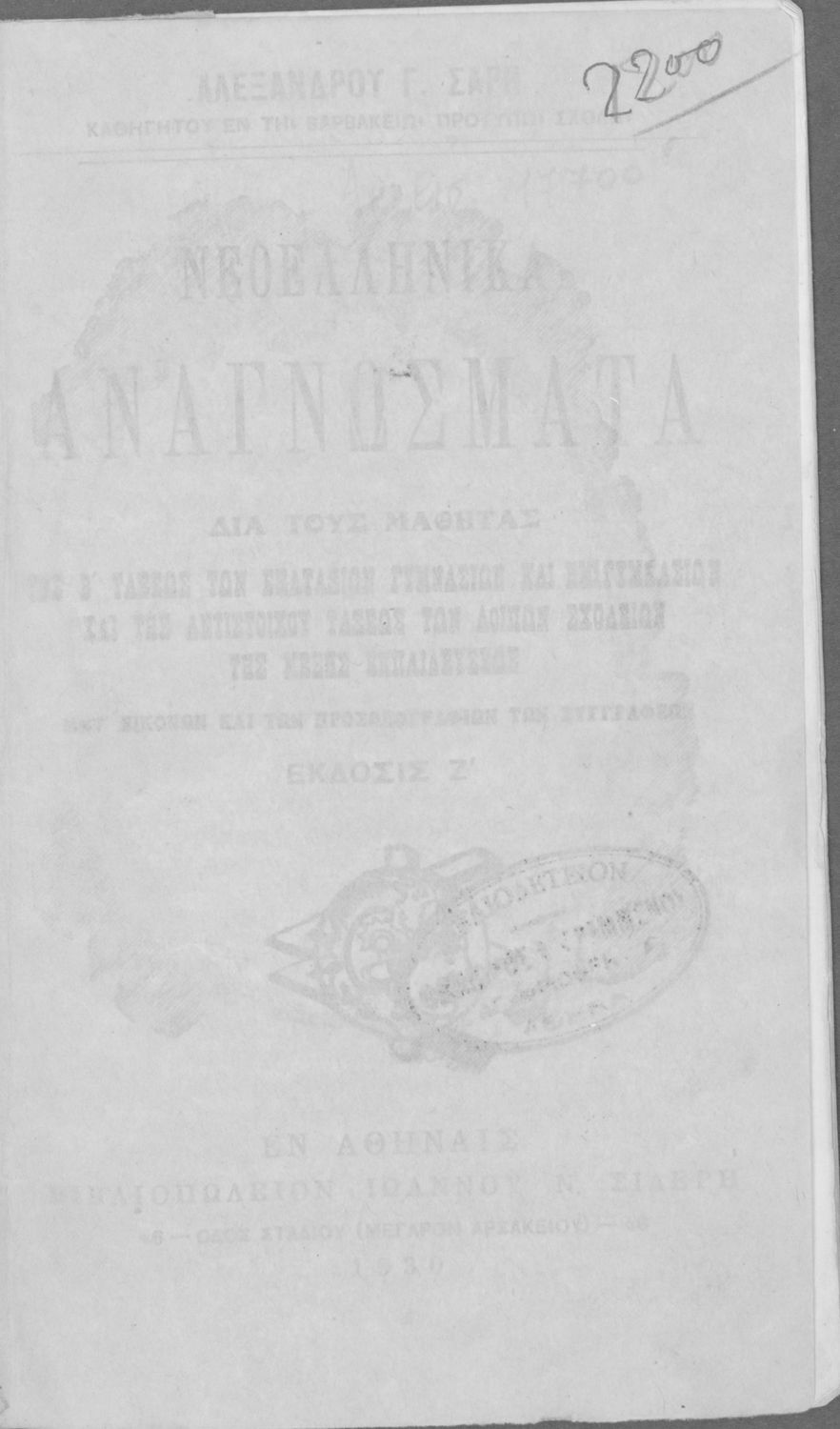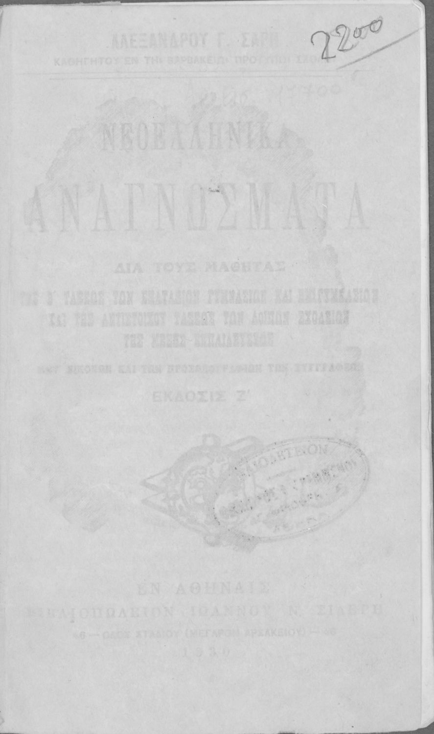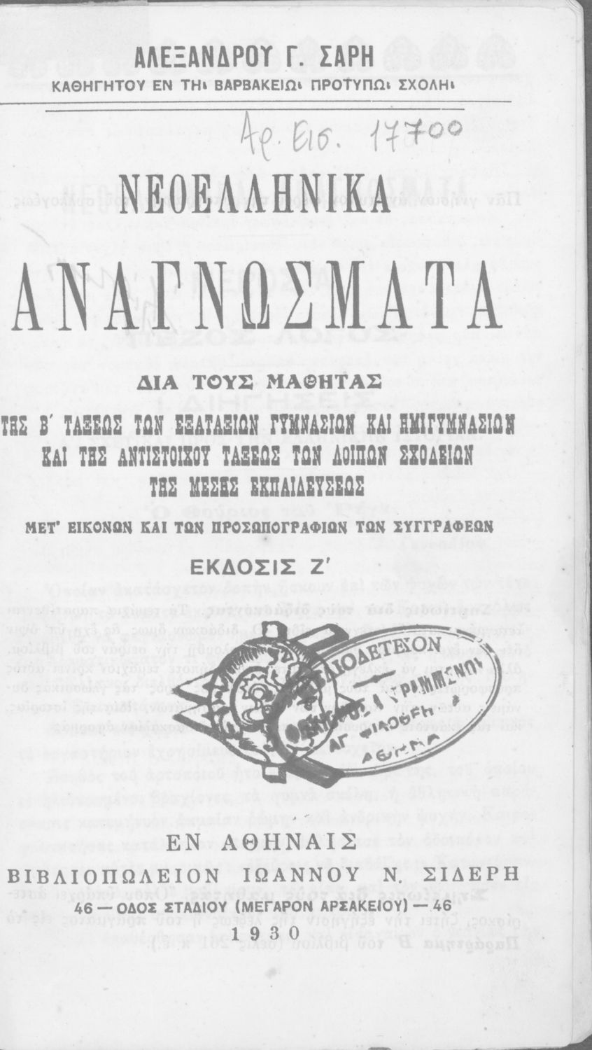 Εκδότης: Ιωάννης Ν. Σιδέρης Έτος έκδοσης: 1930 Τόπος έκδοσης: Αθήνα Έκδοση: 7η Υπουργική απόφαση / Σύμβαση: 20986/2-8-1930 Έτος έγκρισης: 1930 |