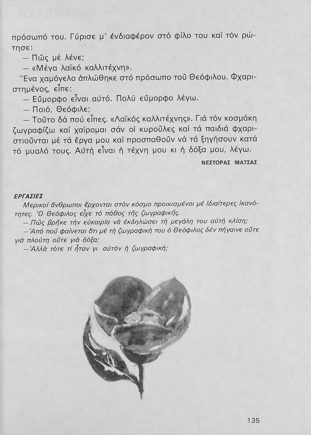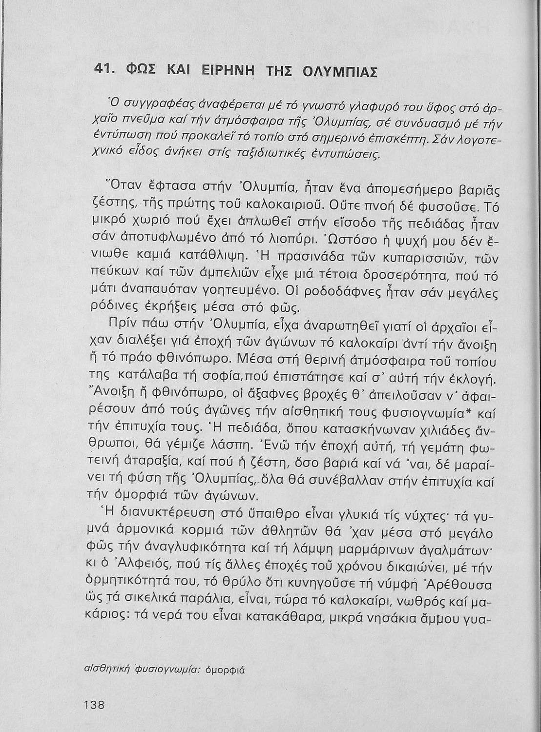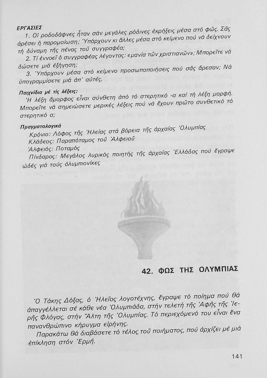 Αναγνωστικό ΣΤ΄ Δημοτικού που περιέχει πεζά και ποιήματα εμπνευσμένα από την κοινωνική, θρησκευτική και εθνική ζωή, την πολιτιστική κληρονομιά και τα ολυμπιακά ιδεώδη καθώς και από τις ασχολίες των ανθρώπων και τα προβλήματά τους.