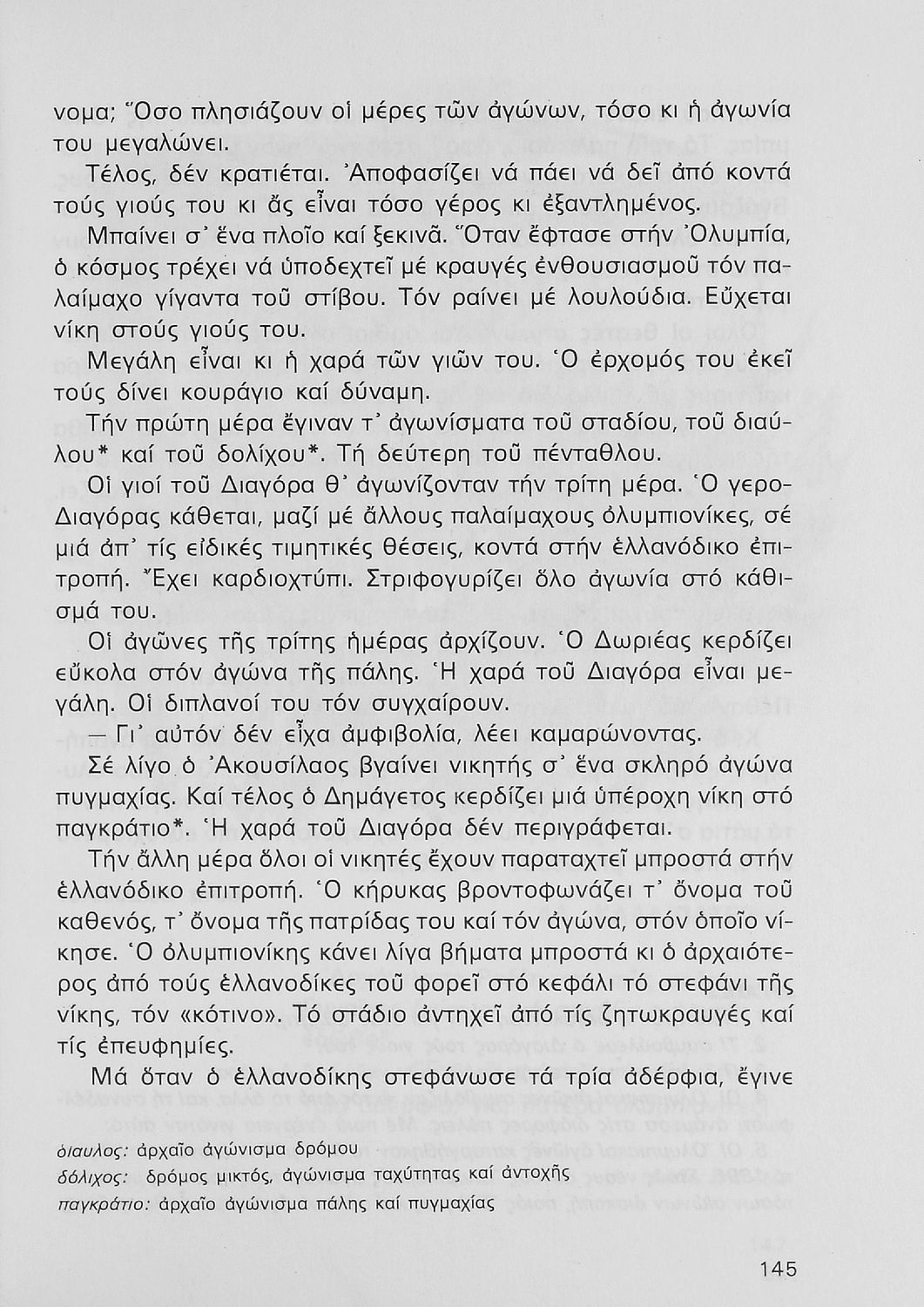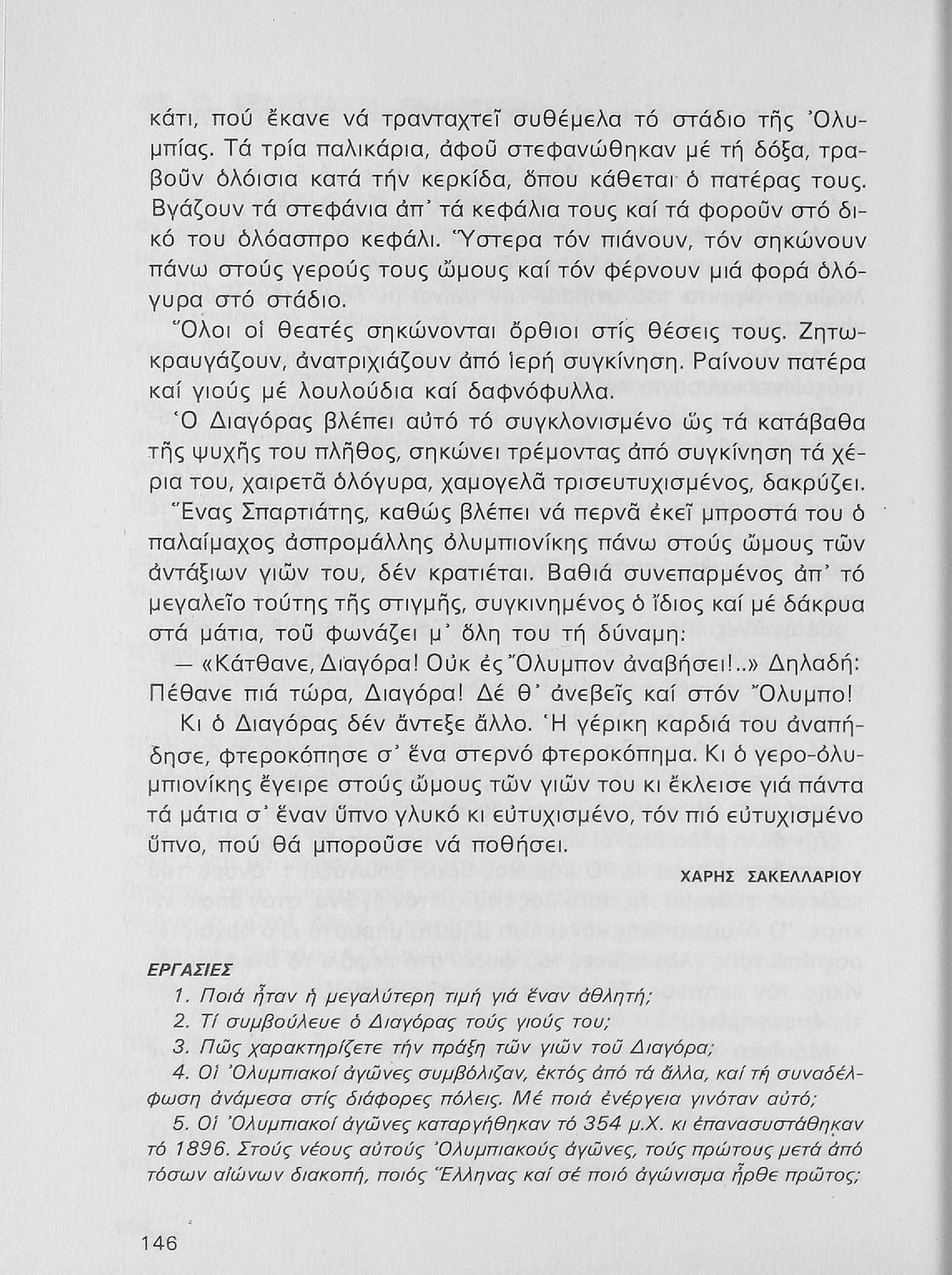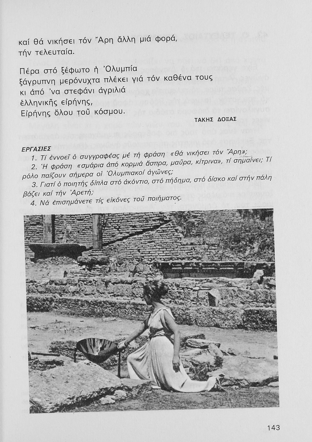 Αναγνωστικό ΣΤ΄ Δημοτικού που περιέχει πεζά και ποιήματα εμπνευσμένα από την κοινωνική, θρησκευτική και εθνική ζωή, την πολιτιστική κληρονομιά και τα ολυμπιακά ιδεώδη καθώς και από τις ασχολίες των ανθρώπων και τα προβλήματά τους.