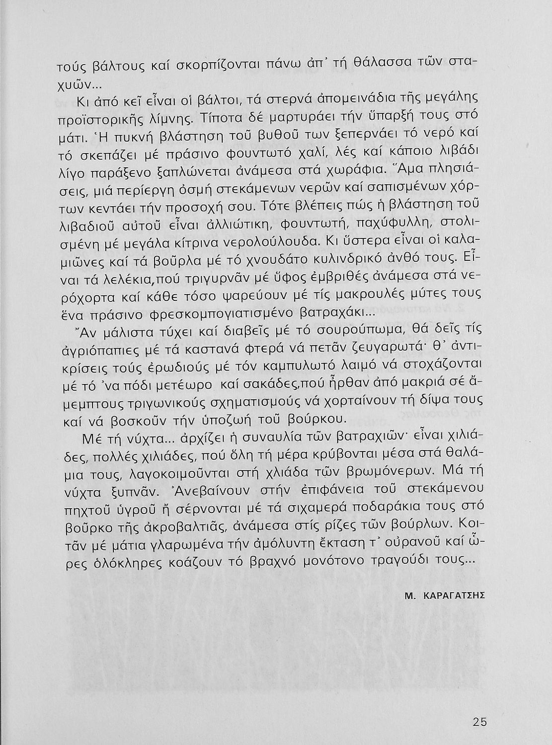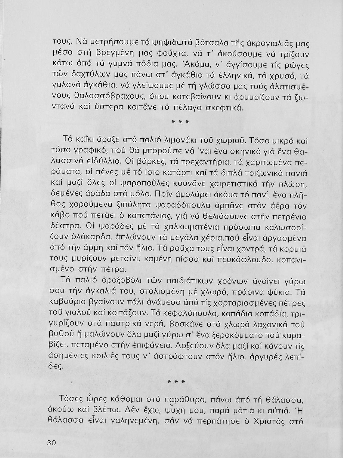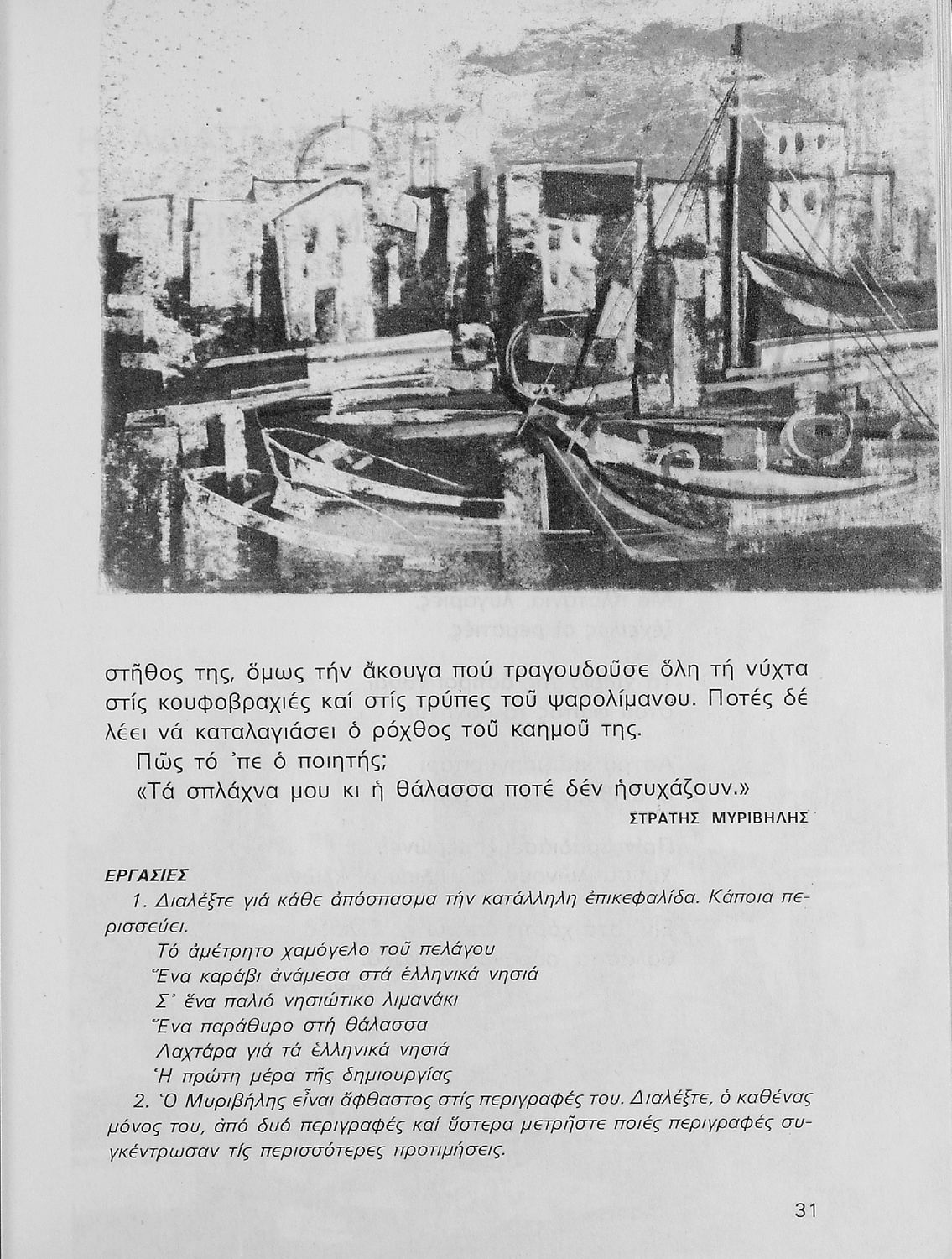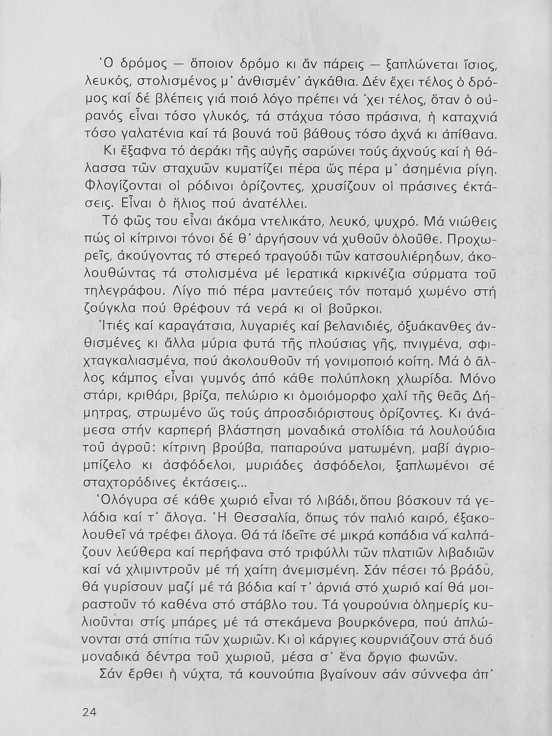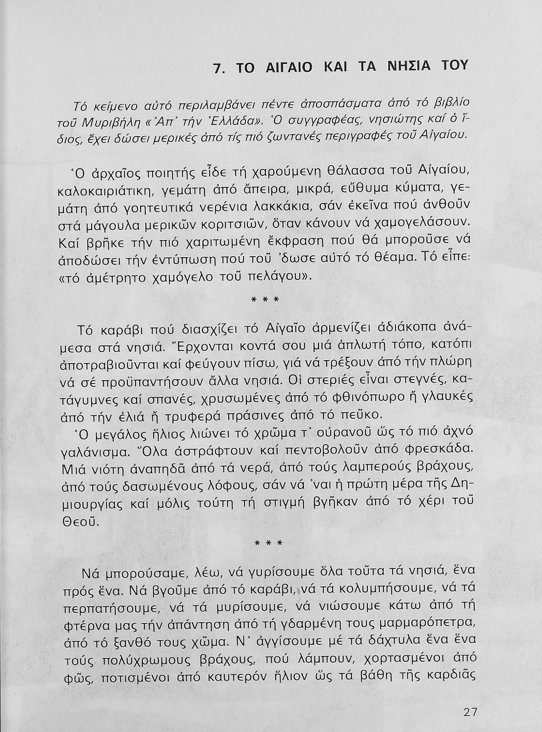 Αναγνωστικό ΣΤ΄ Δημοτικού που περιέχει πεζά και ποιήματα εμπνευσμένα από την κοινωνική, θρησκευτική και εθνική ζωή, την πολιτιστική κληρονομιά και τα ολυμπιακά ιδεώδη καθώς και από τις ασχολίες των ανθρώπων και τα προβλήματά τους.