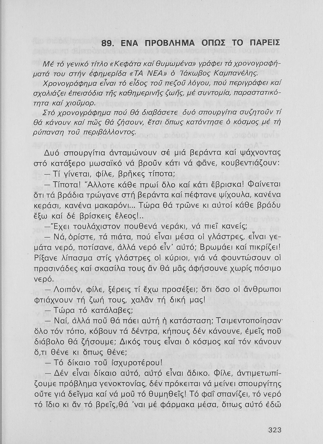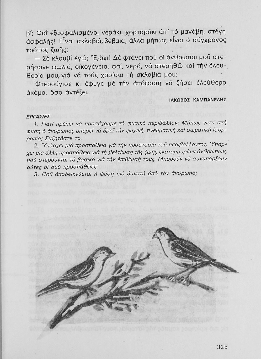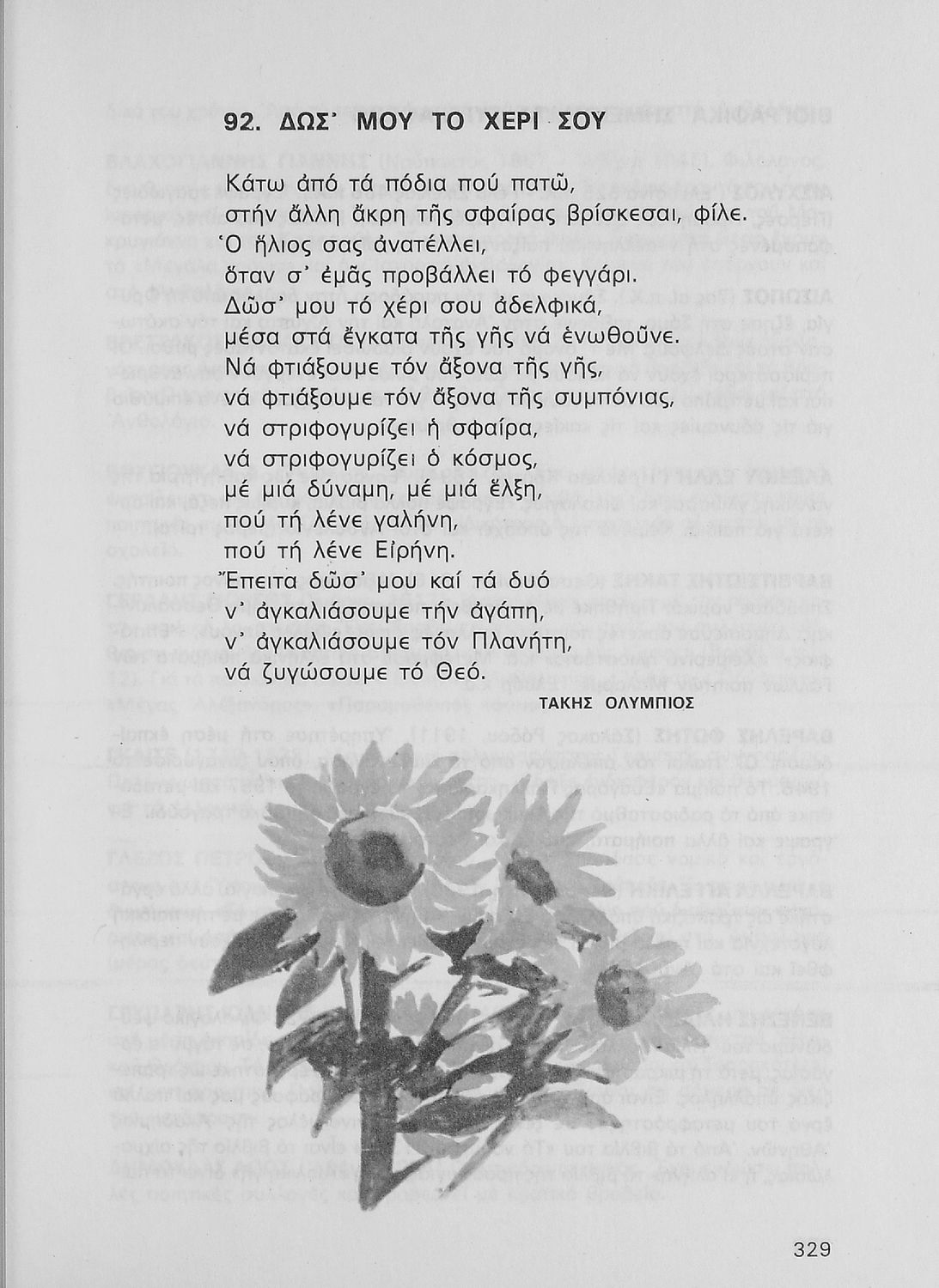 Αναγνωστικό ΣΤ΄ Δημοτικού που περιέχει πεζά και ποιήματα εμπνευσμένα από την κοινωνική, θρησκευτική και εθνική ζωή, την πολιτιστική κληρονομιά και τα ολυμπιακά ιδεώδη καθώς και από τις ασχολίες των ανθρώπων και τα προβλήματά τους.