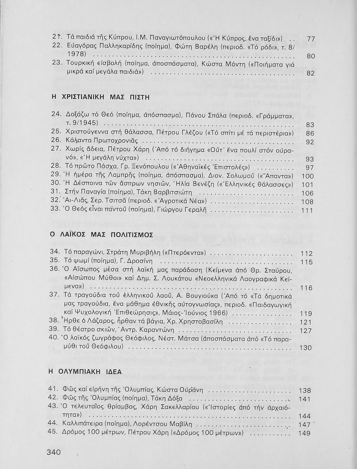 Αναγνωστικό ΣΤ΄ Δημοτικού που περιέχει πεζά και ποιήματα εμπνευσμένα από την κοινωνική, θρησκευτική και εθνική ζωή, την πολιτιστική κληρονομιά και τα ολυμπιακά ιδεώδη καθώς και από τις ασχολίες των ανθρώπων και τα προβλήματά τους.