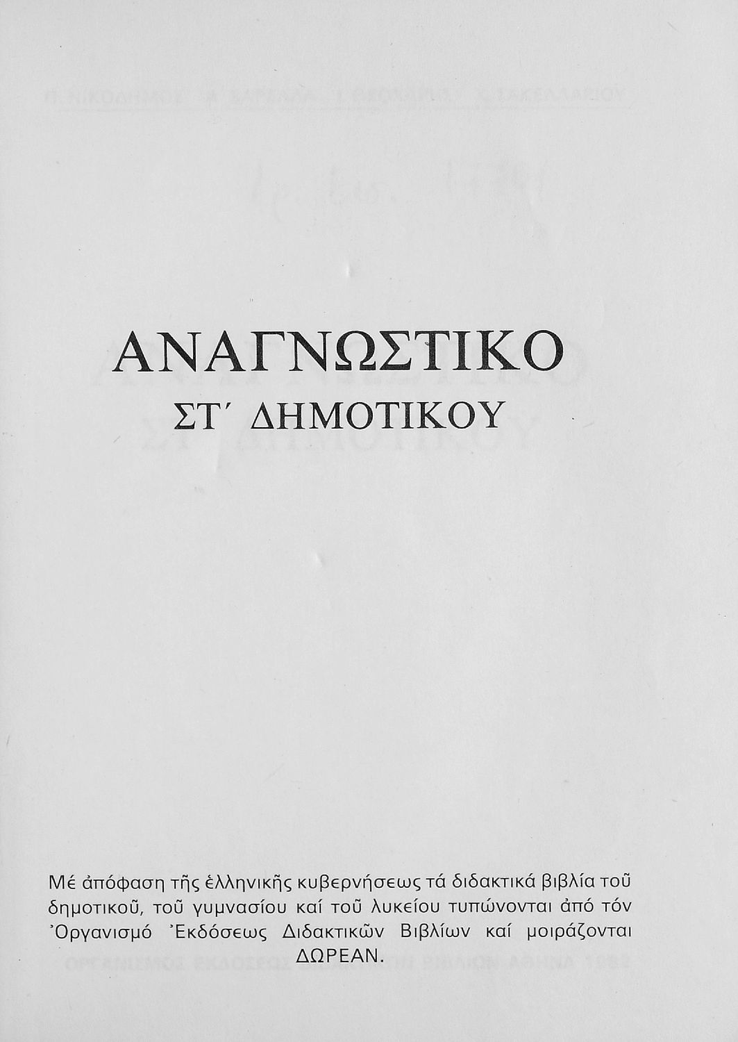 Αναγνωστικό της ΣΤ΄ Δημοτικού που κυκλοφόρησε σε 7.000 αντίτυπα 25 ημέρες πριν την 4η Αυγούστου 1936, οπότε κατά την επόμενη σχολική χρονιά διδάχτηκε ελάχιστα και η έκδοσή του με αυτή την μορφή σταμάτησε.