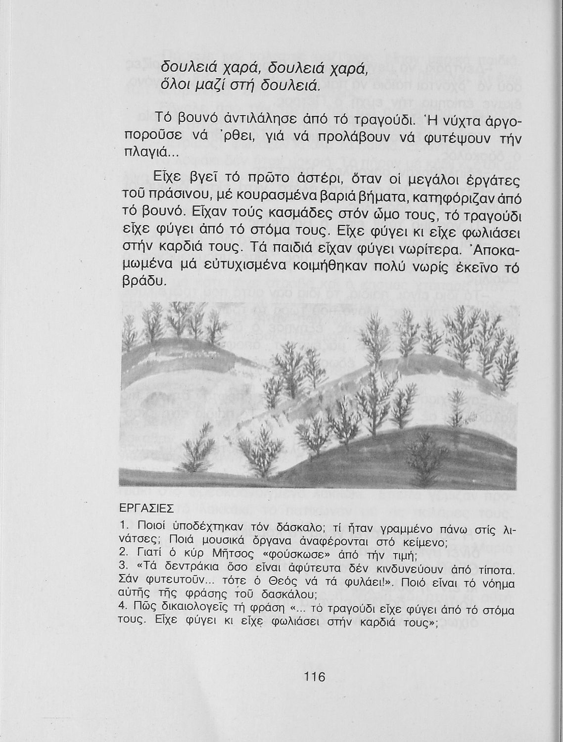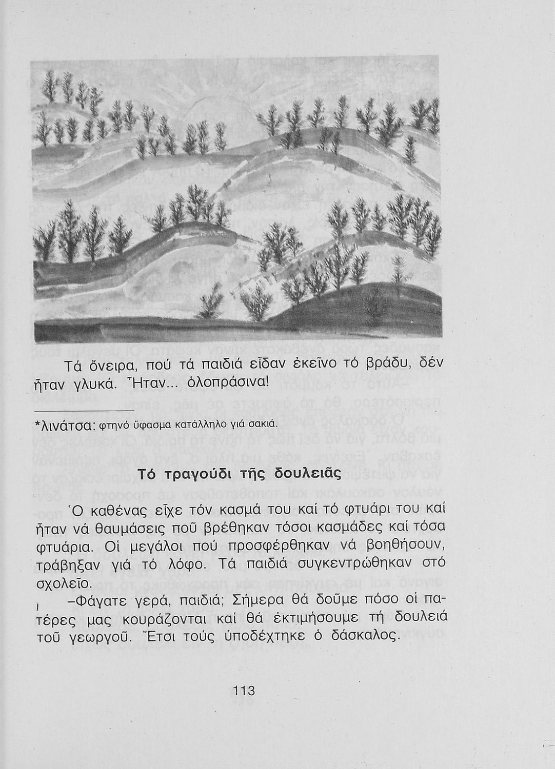 Αναγνωστικό Δ΄ Δημοτικού που περιέχει πεζά και ποιήματα με περιεχόμενο διδακτικό και ηθικοπλαστικό εμπνευσμένα από την αγροτική ζωή και κοινωνική ζωή, την ελληνική φύση και παράδοση, και τις ασχολίες των ανθρώπων. Περιλαμβάνει και σύντομα βιογραφικά σημειώματα των συγγραφέων.