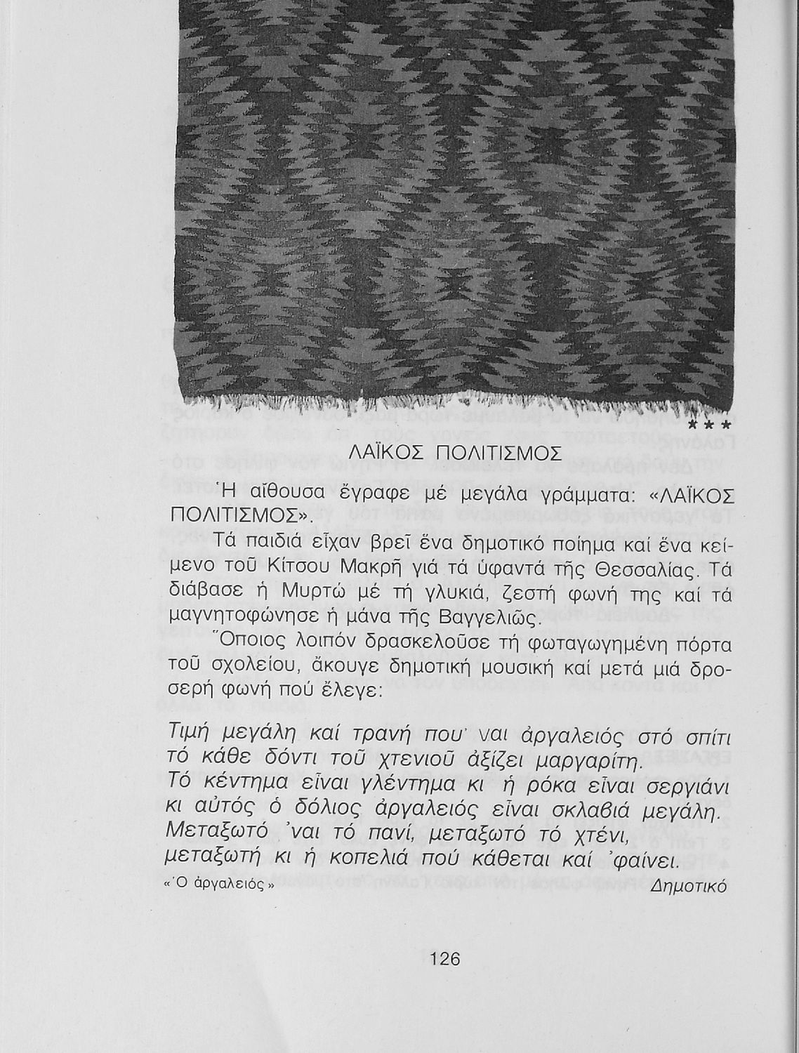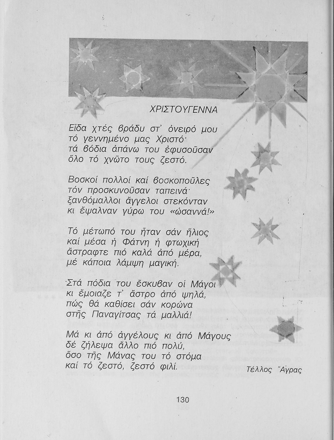 Αναγνωστικό για την Δ΄ τάξη του Δημοτικού. Περιλαμβάνει ένα κείμενο στο οποίο παρεμβάλλονται ποιήματα δημοτικά και Ελλήνων ποιητών.