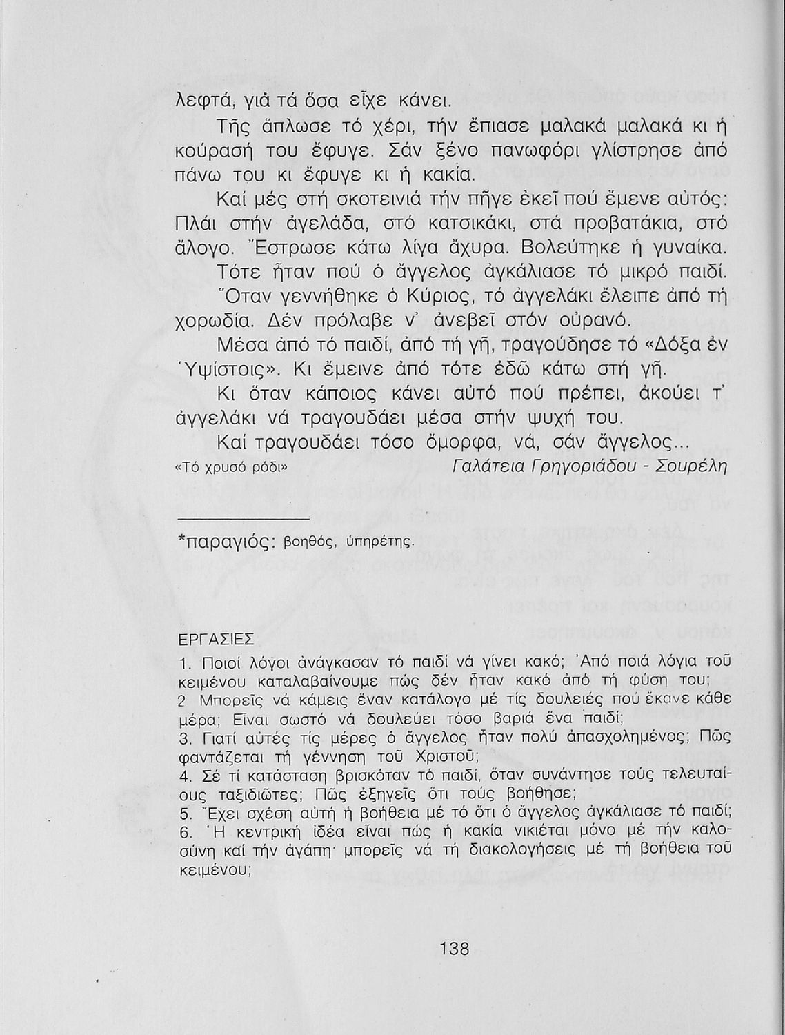 Αναγνωστικό Δ΄ Δημοτικού που περιέχει πεζά και ποιήματα με περιεχόμενο διδακτικό και ηθικοπλαστικό εμπνευσμένα από την αγροτική ζωή και κοινωνική ζωή, την ελληνική φύση και παράδοση, και τις ασχολίες των ανθρώπων. Περιλαμβάνει και σύντομα βιογραφικά σημειώματα των συγγραφέων.