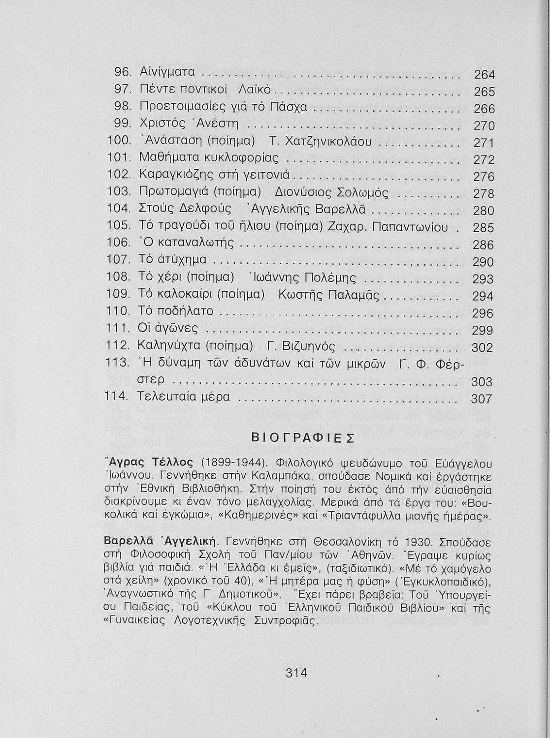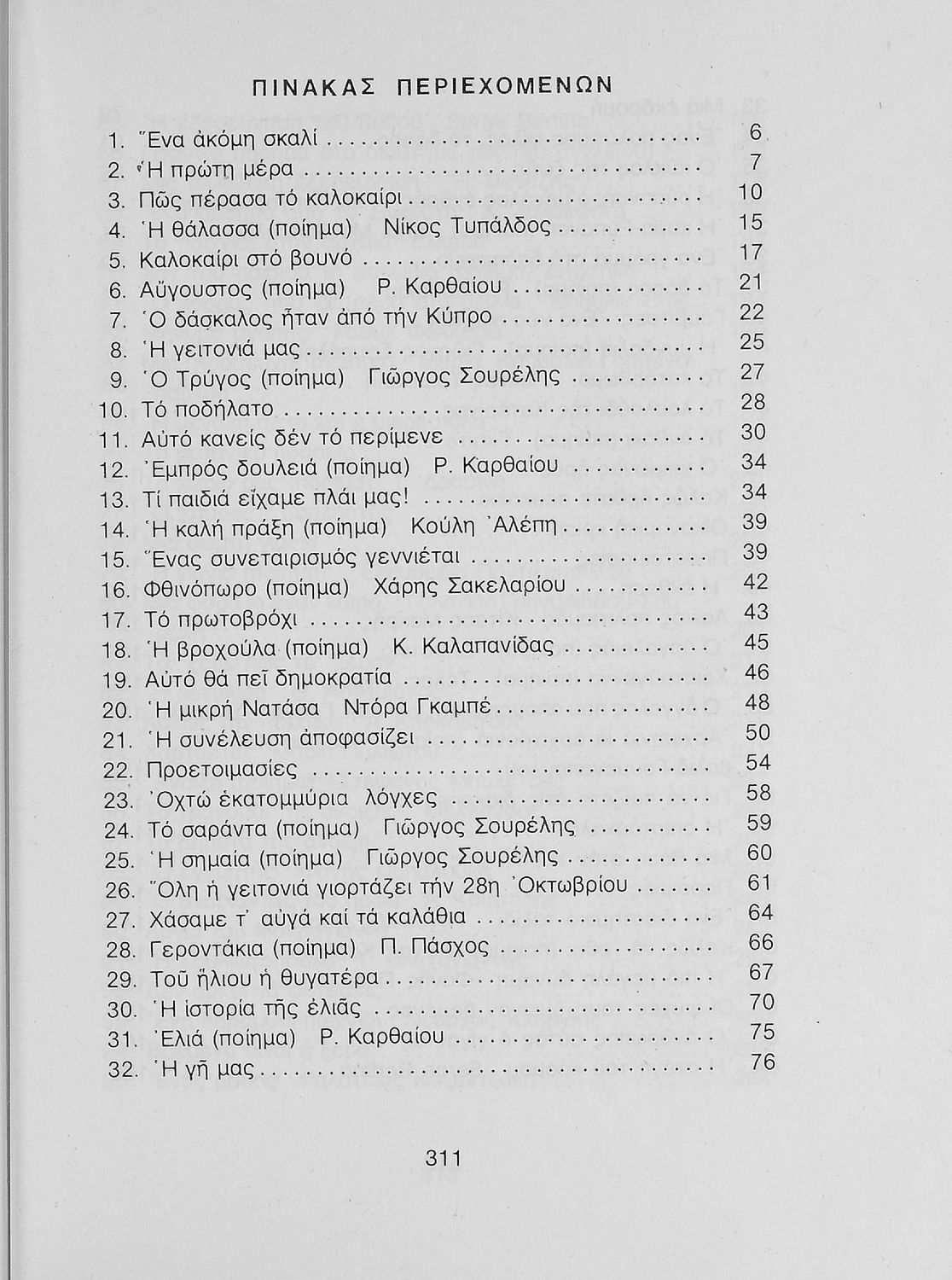 Αναγνωστικό για την Δ΄ τάξη του Δημοτικού. Περιλαμβάνει ένα κείμενο στο οποίο παρεμβάλλονται ποιήματα δημοτικά και Ελλήνων ποιητών.