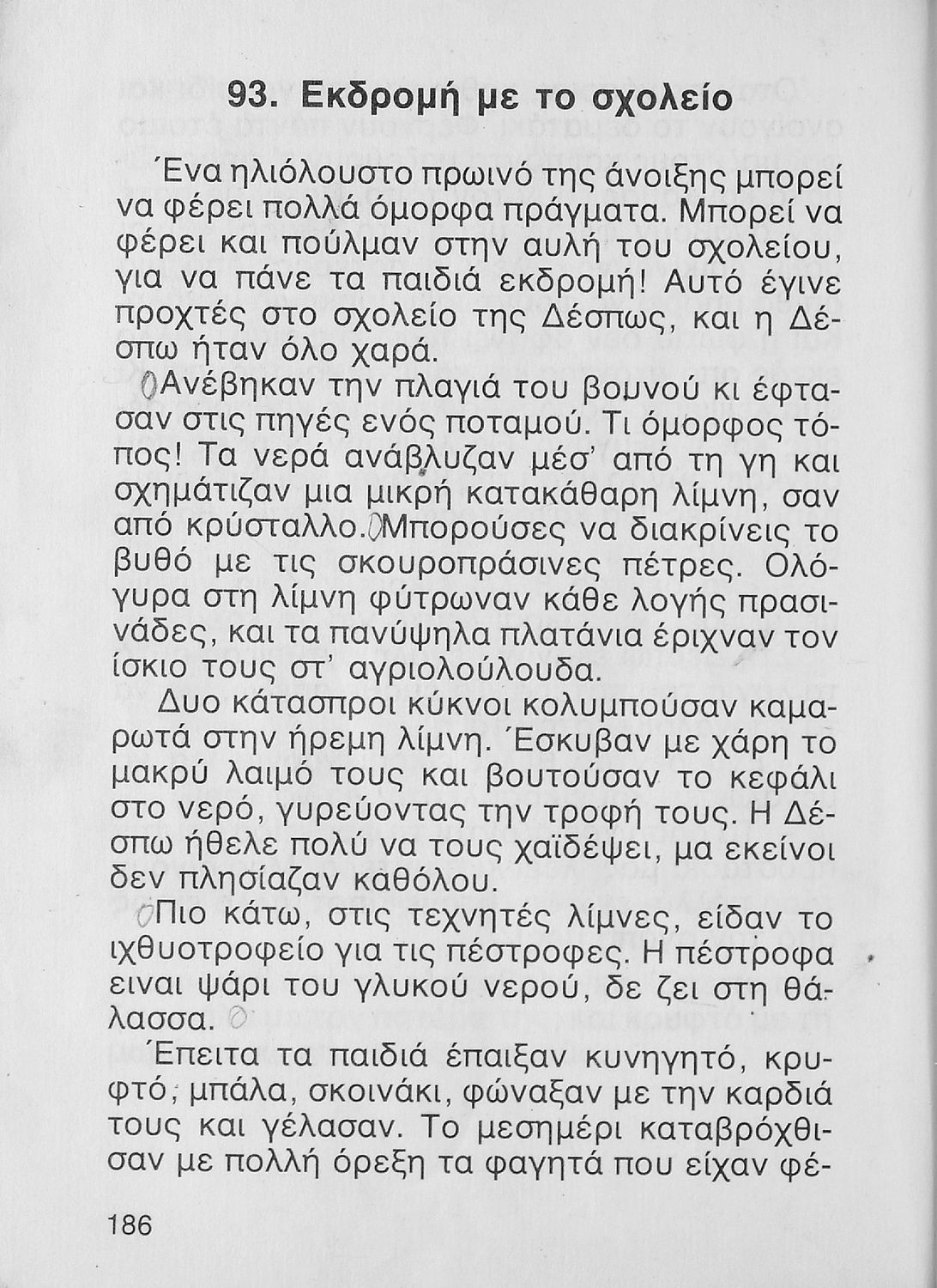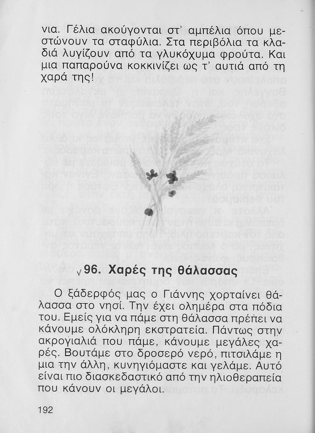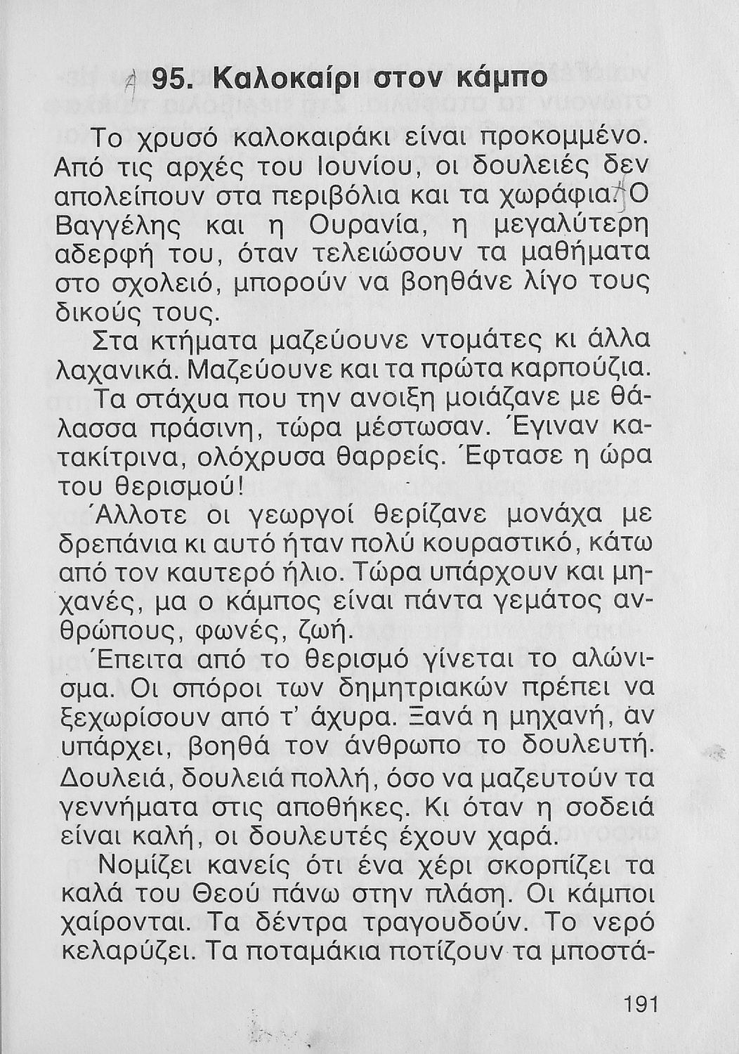 Αναγνωστικό Β' Δημοτικού που περιλαμβάνει ποιήματα και πεζά εμπνευσμένα από την καθημερινή ζωή, την ελληνική μυθολογία, την ελληνική φύση και τη θρησκευτική παράδοση.