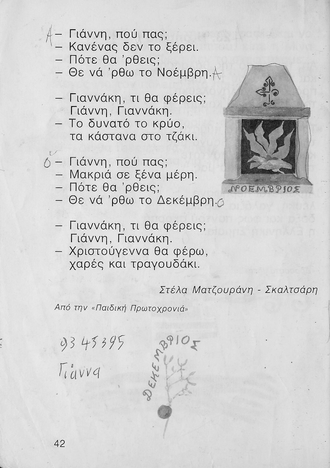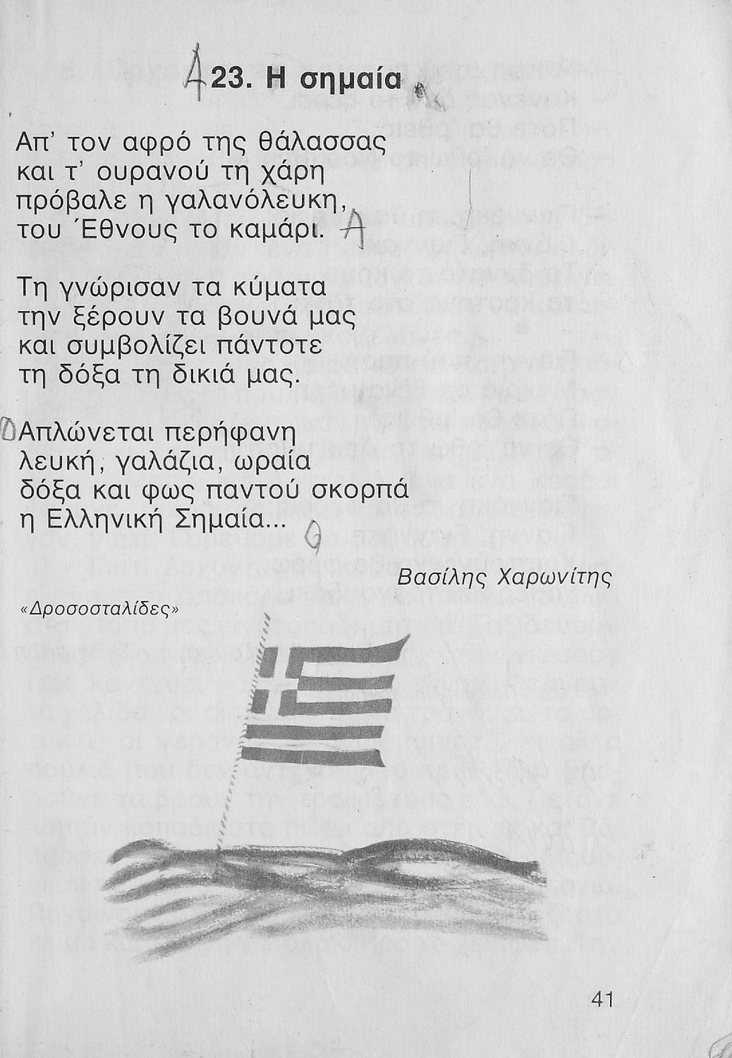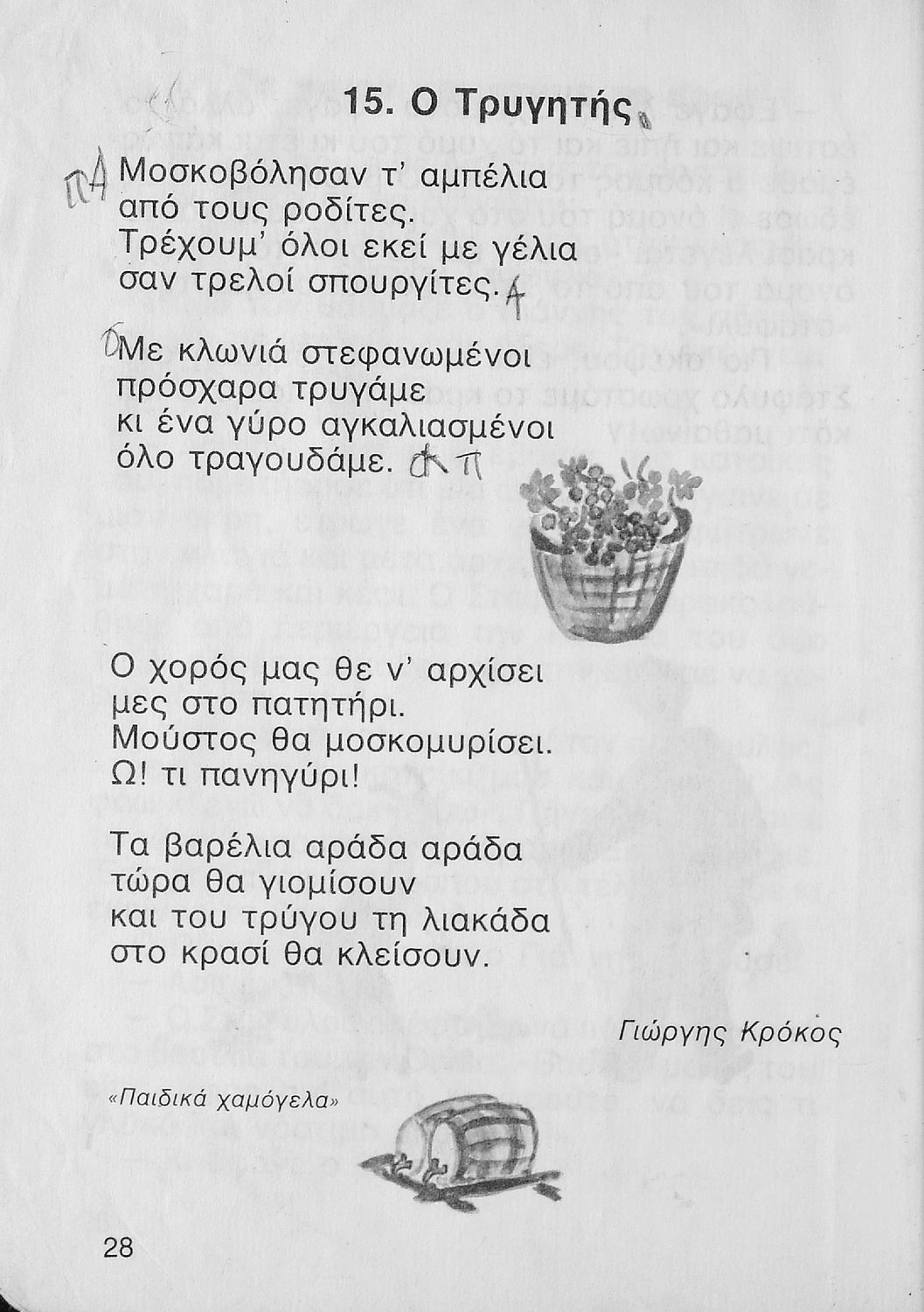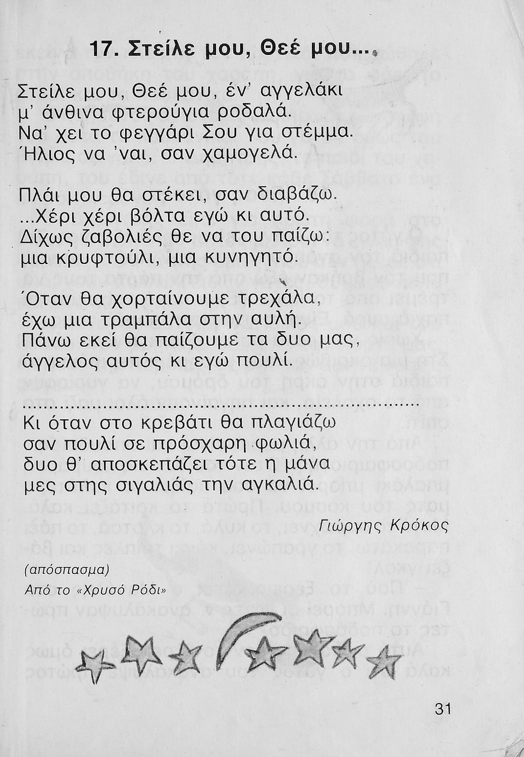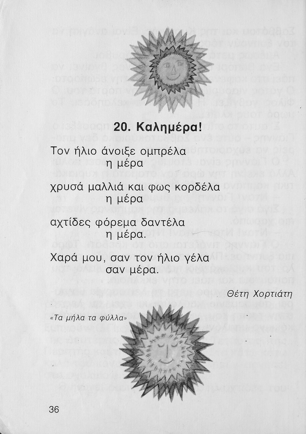 Αναγνωστικό Β' Δημοτικού που περιλαμβάνει ποιήματα και πεζά εμπνευσμένα από την καθημερινή ζωή, την ελληνική μυθολογία, την ελληνική φύση και τη θρησκευτική παράδοση.