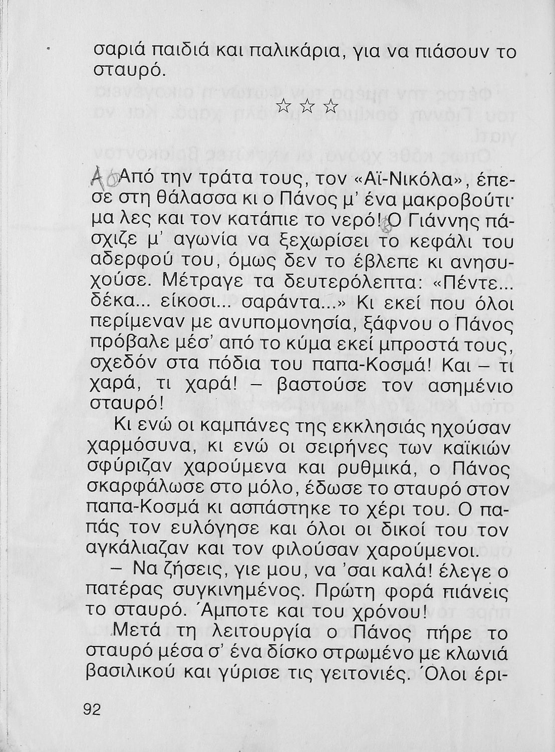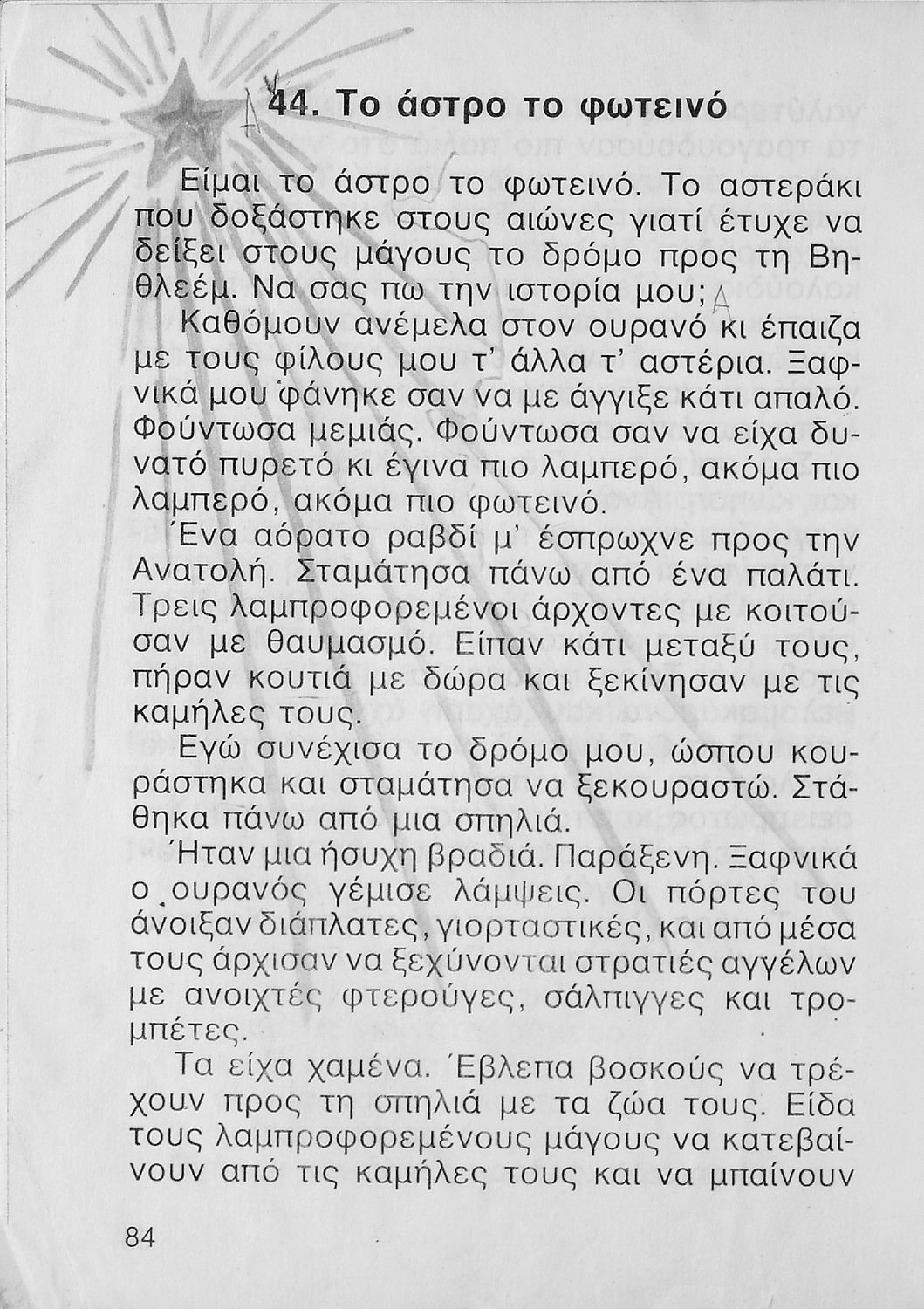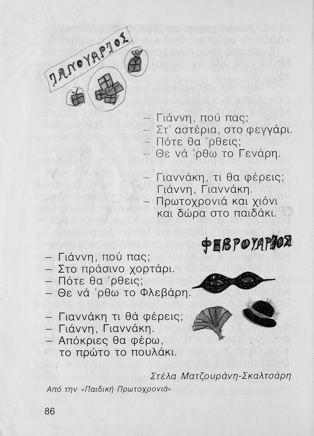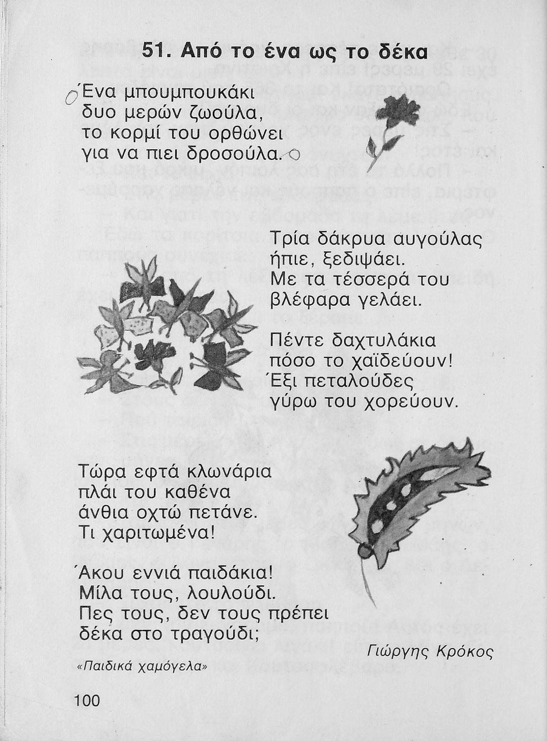 Αναγνωστικό Β' Δημοτικού που περιλαμβάνει ποιήματα και πεζά εμπνευσμένα από την καθημερινή ζωή, την ελληνική μυθολογία, την ελληνική φύση και τη θρησκευτική παράδοση.