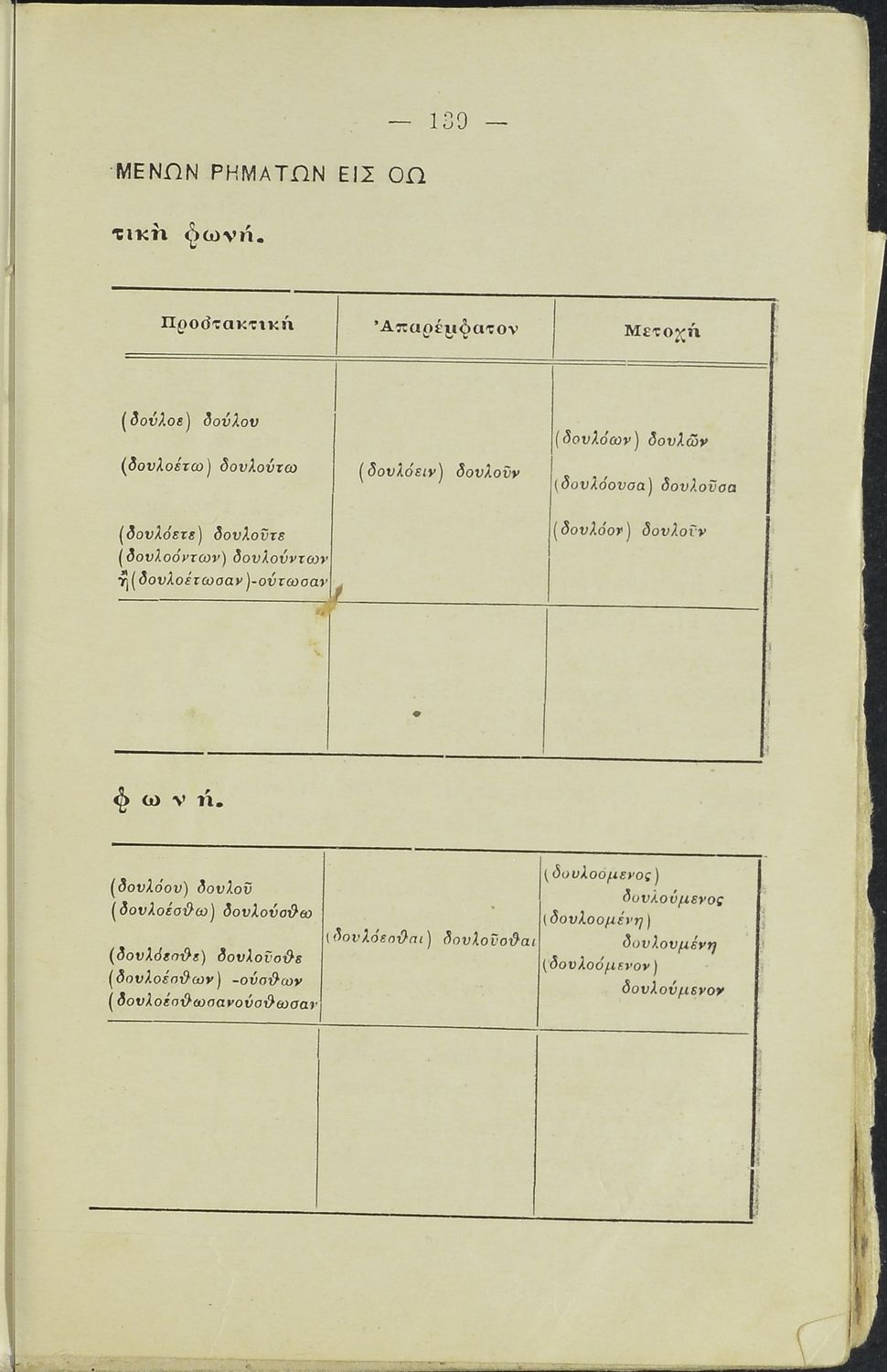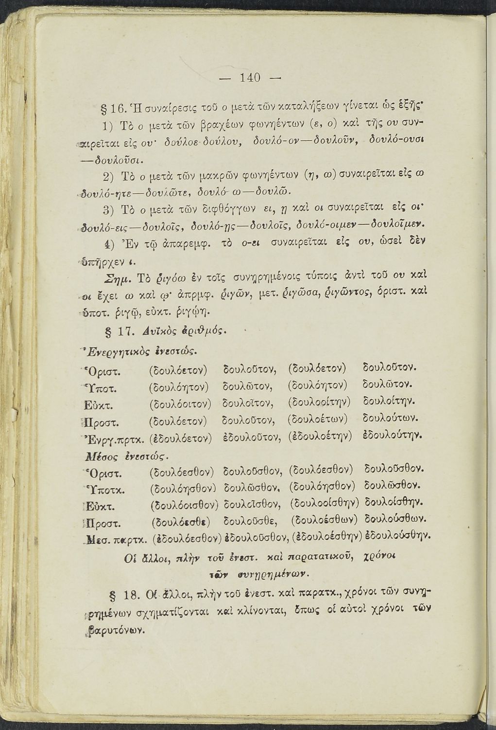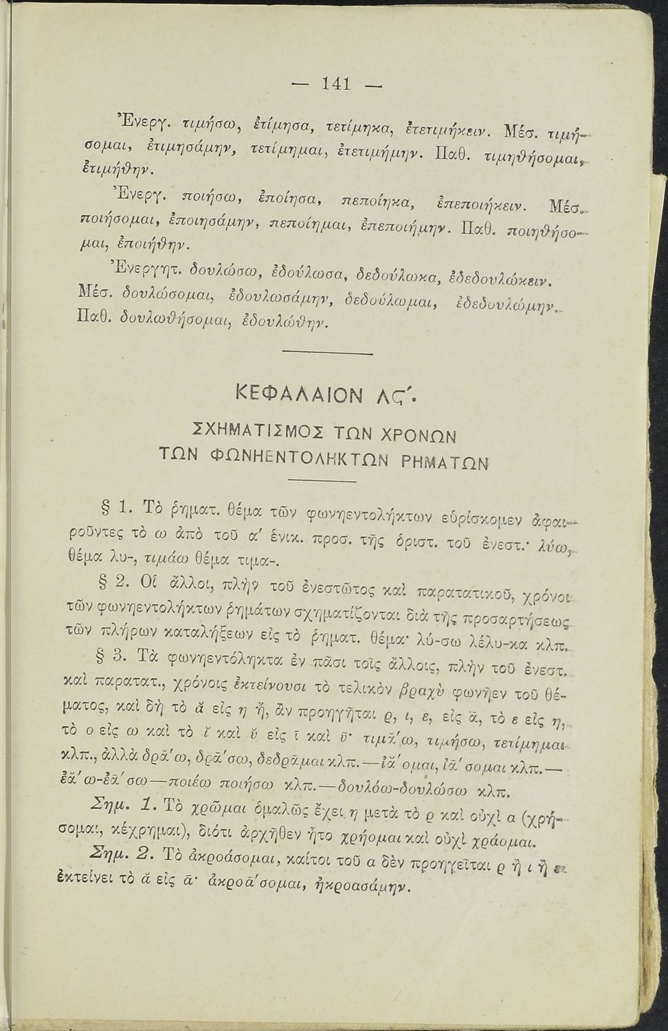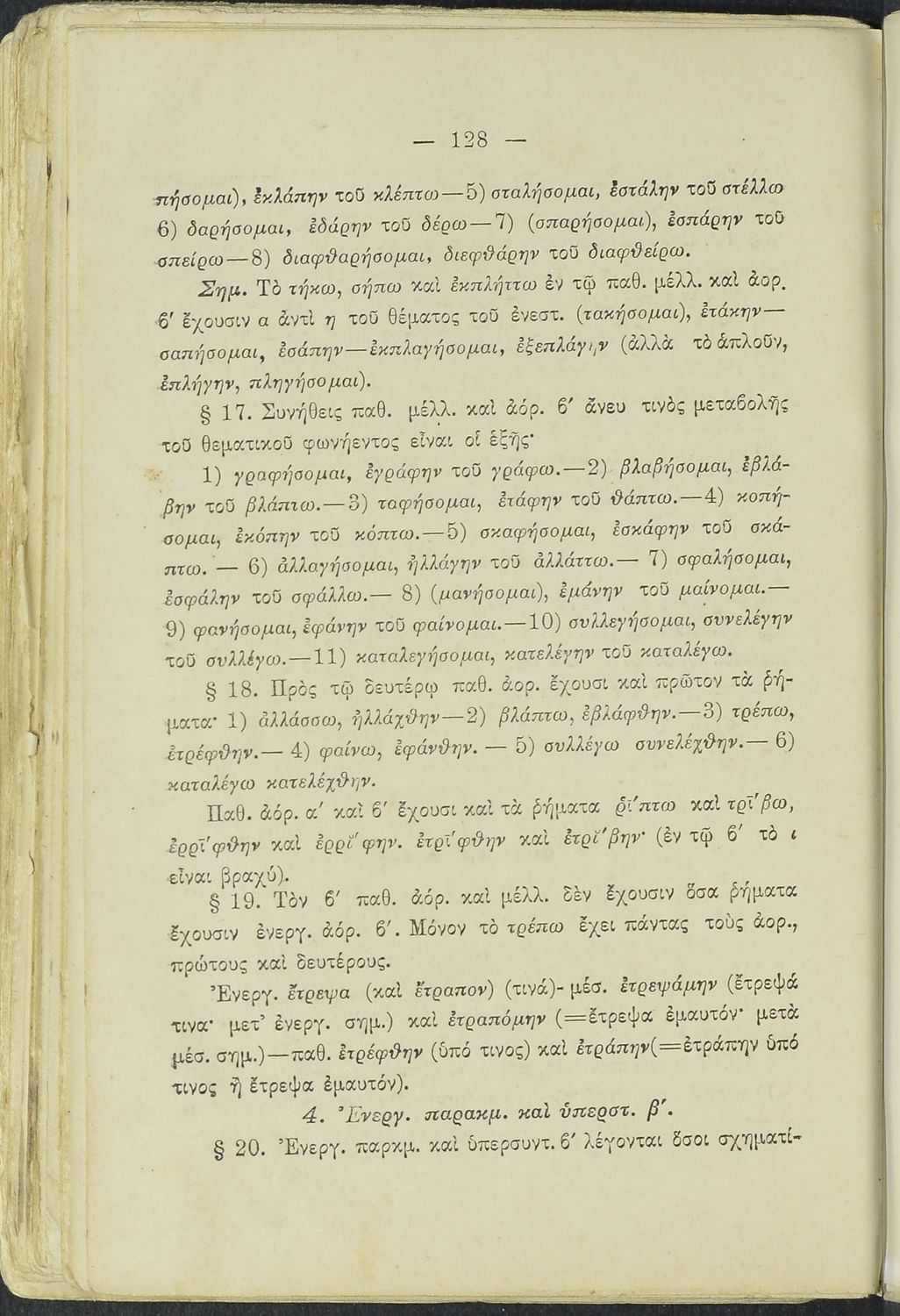 Σχολικό εγχειρίδιο Αρχαίων Ελληνικών για τα Ελληνικά Σχολεία και Παρθεναγωγεία που περιέχει τους κανόνες γραμματικής και είναι χωρισμένο σε φθογγολογικό, τυπολογικό και ετυμολογικό μέρος.