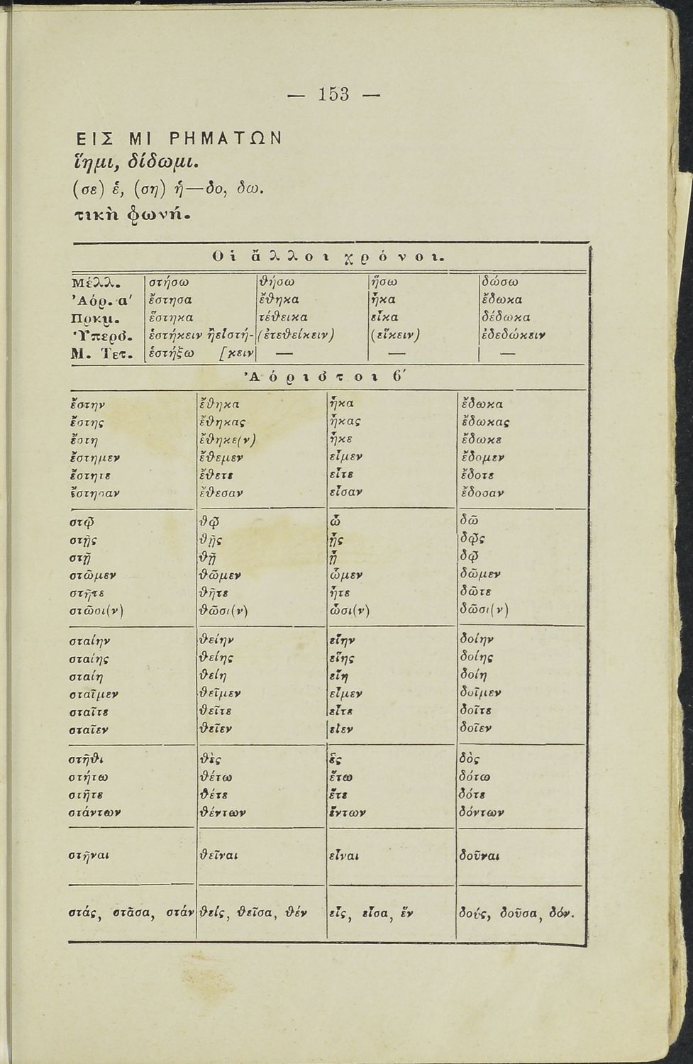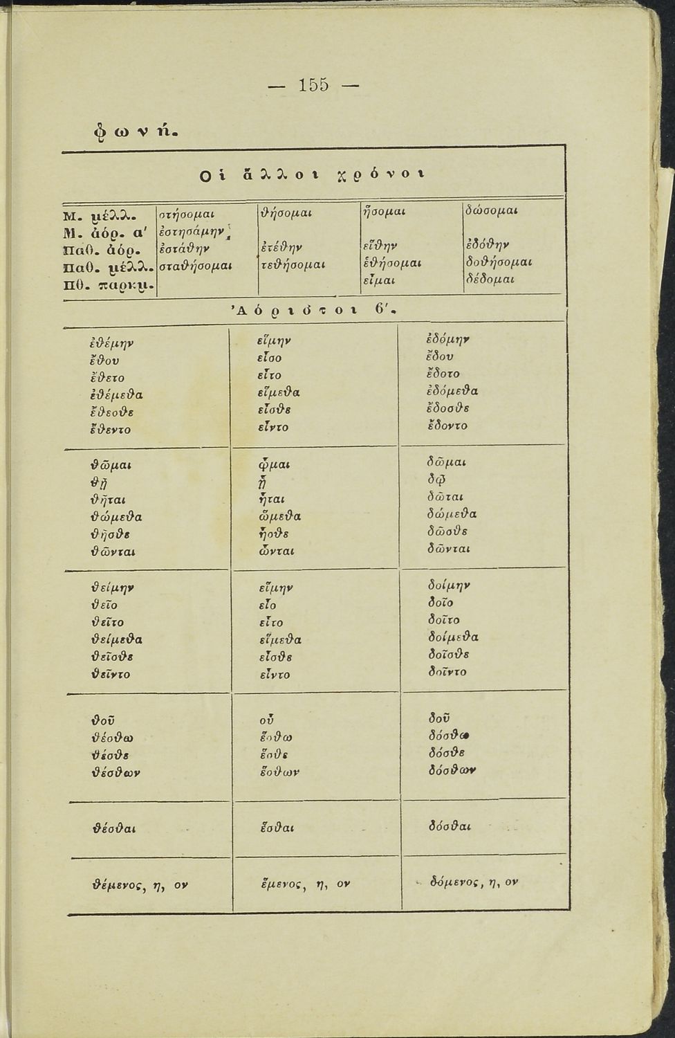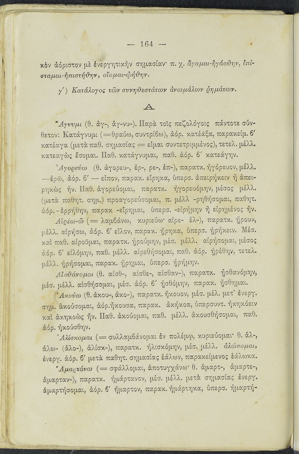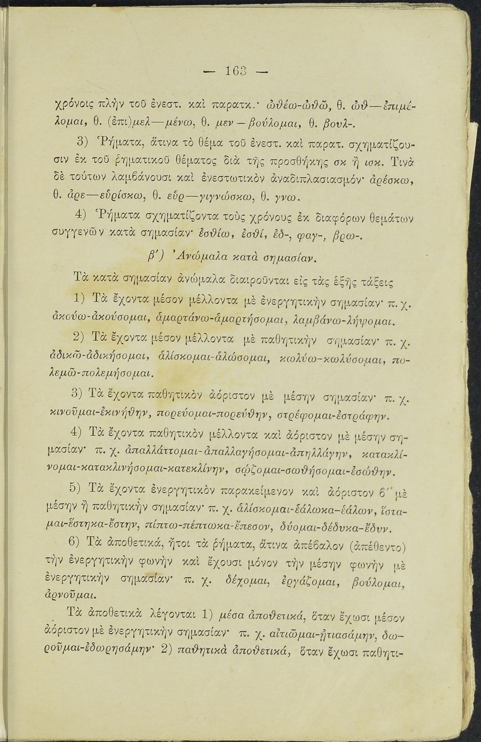 Μαθητικό βοήθημα Αρχαίων Ελληνικών για τα Ελληνικά Σχολεία, Παρθεναγωγεία και Γυμνάσια που περιλαμβάνει γραμματική της αρχαίας ελληνικής και κατάλογο ανωμάλων ρημάτων.