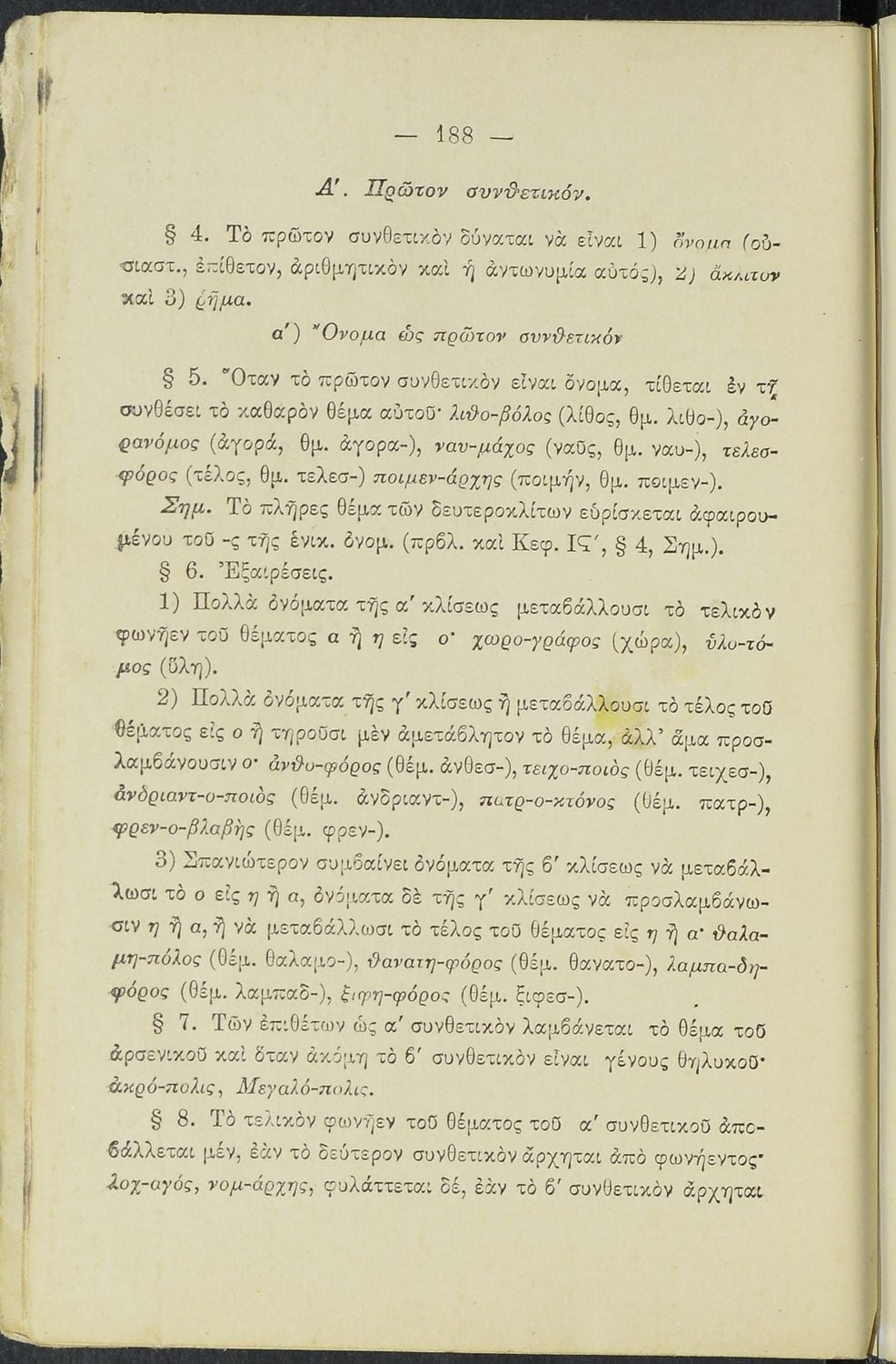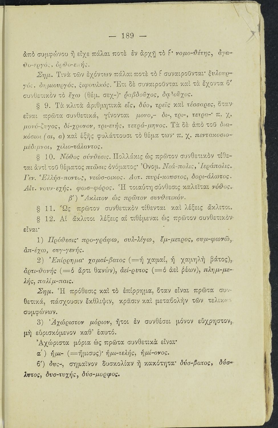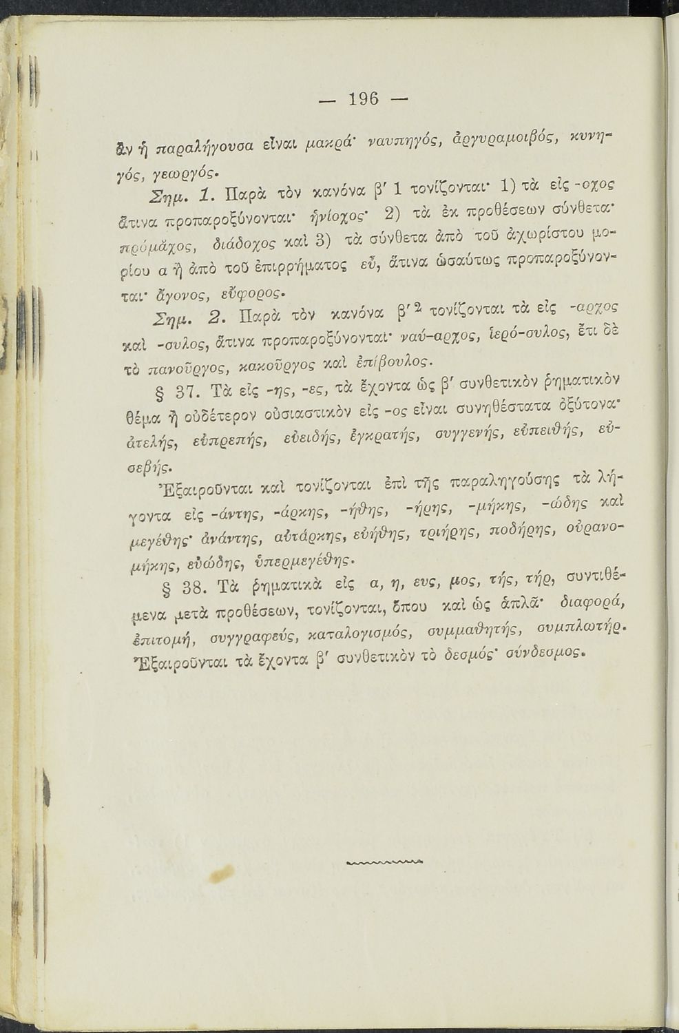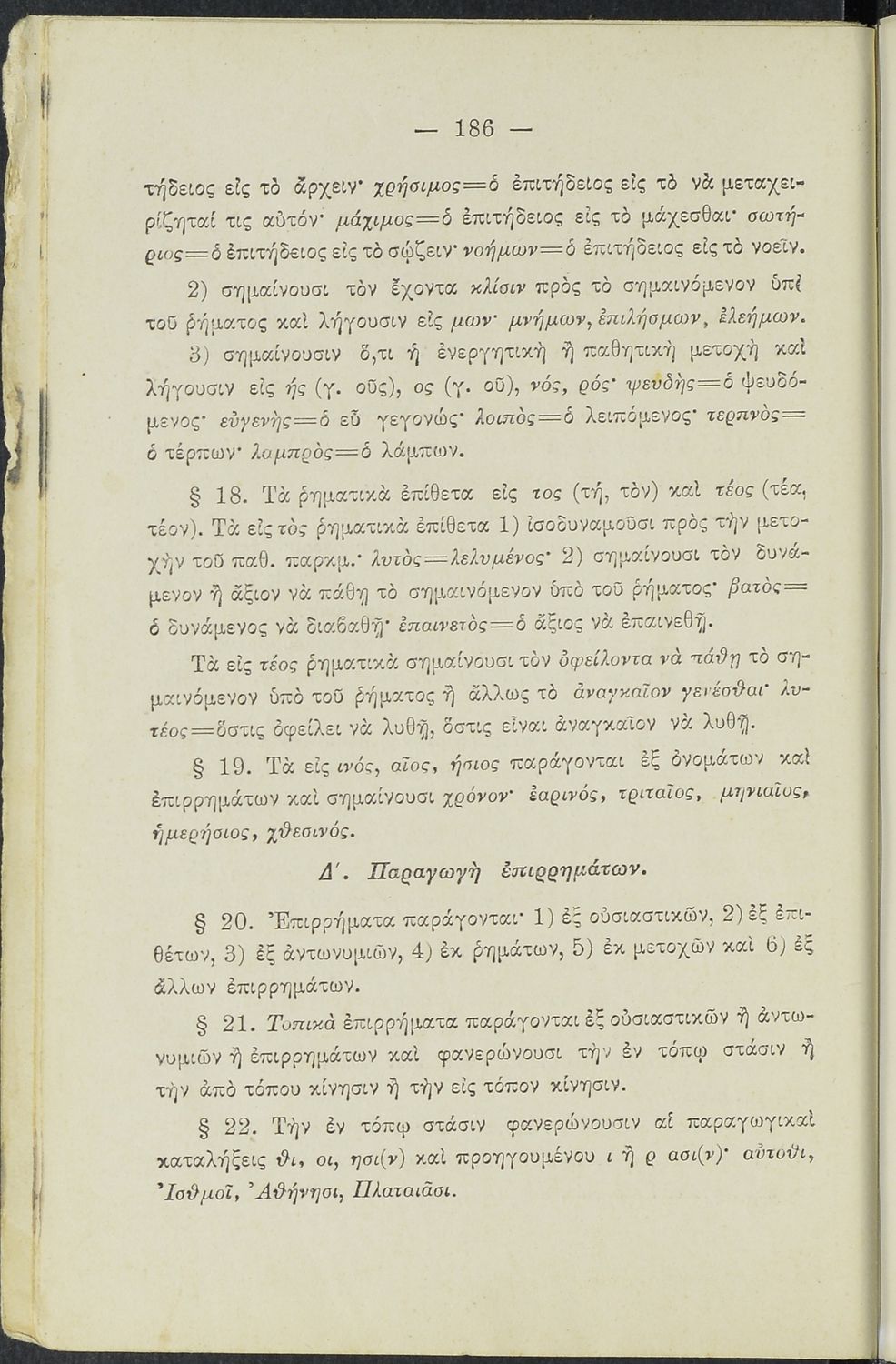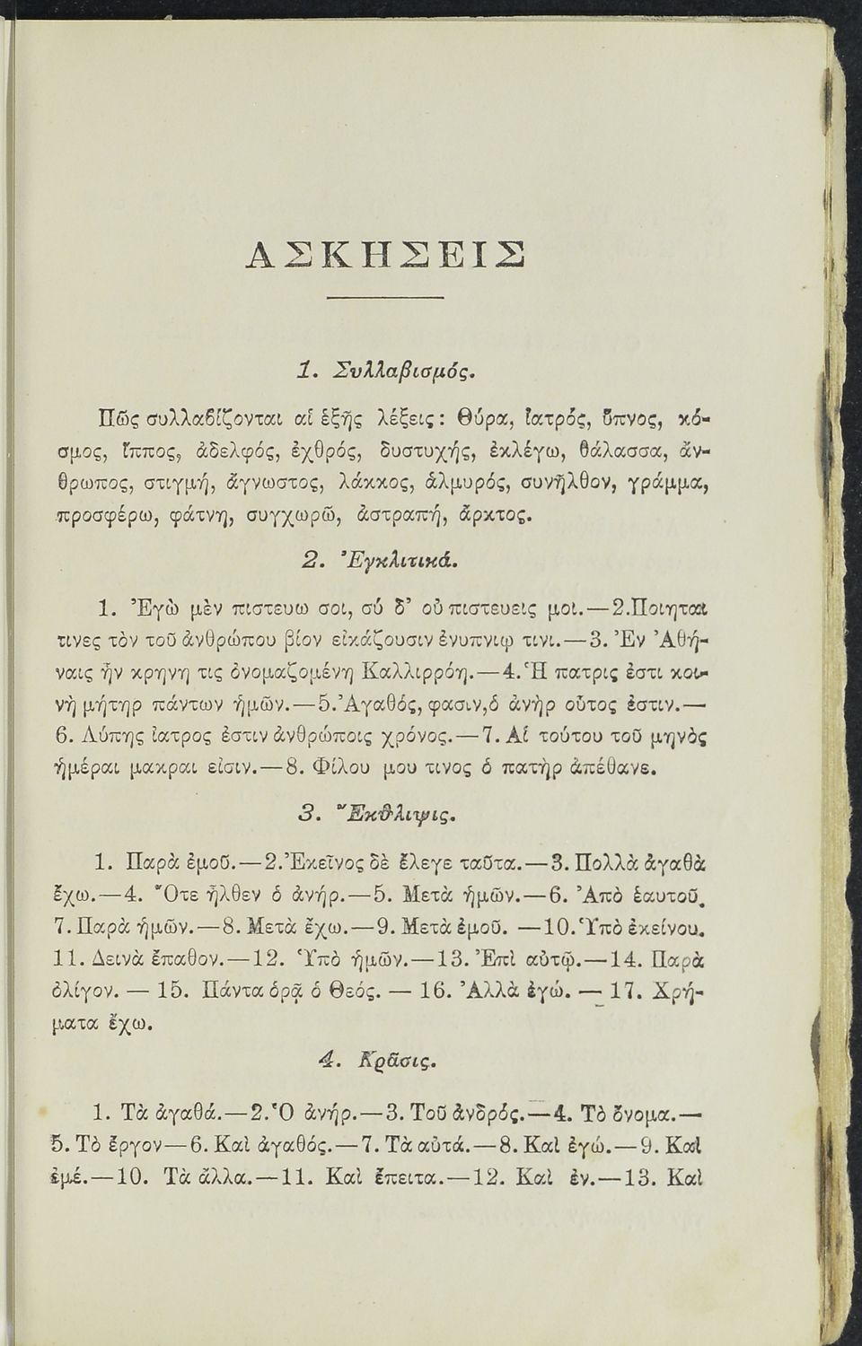 Σχολικό εγχειρίδιο Αρχαίων Ελληνικών για τα Ελληνικά Σχολεία και Παρθεναγωγεία που περιέχει τους κανόνες γραμματικής και είναι χωρισμένο σε φθογγολογικό, τυπολογικό και ετυμολογικό μέρος.