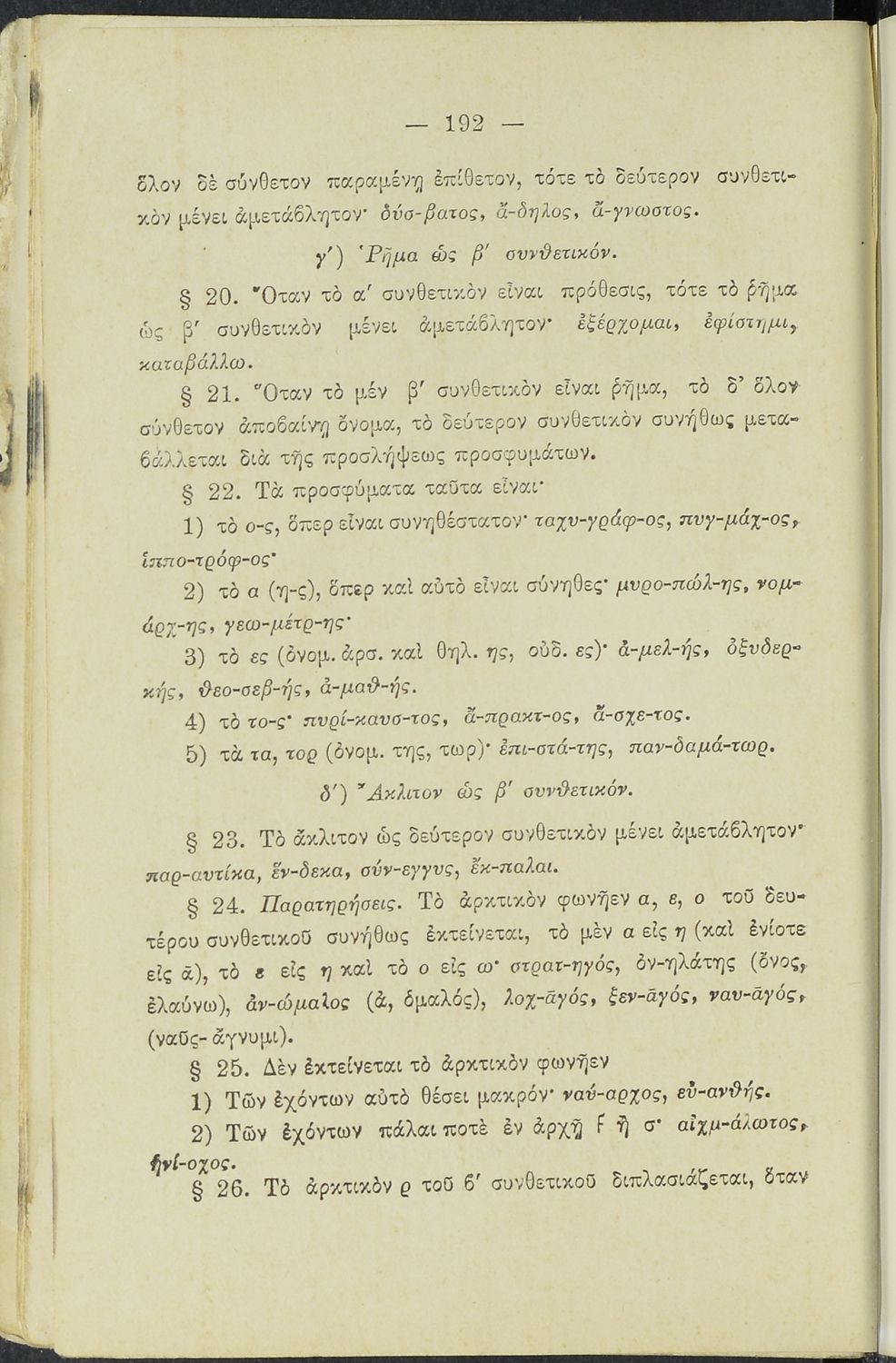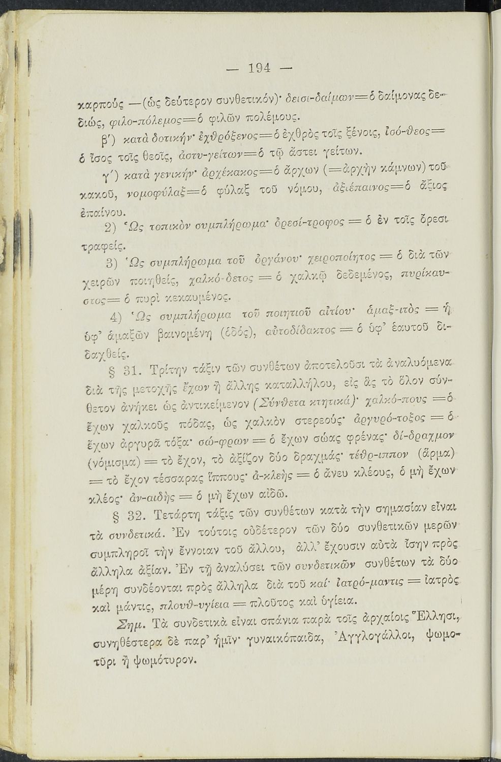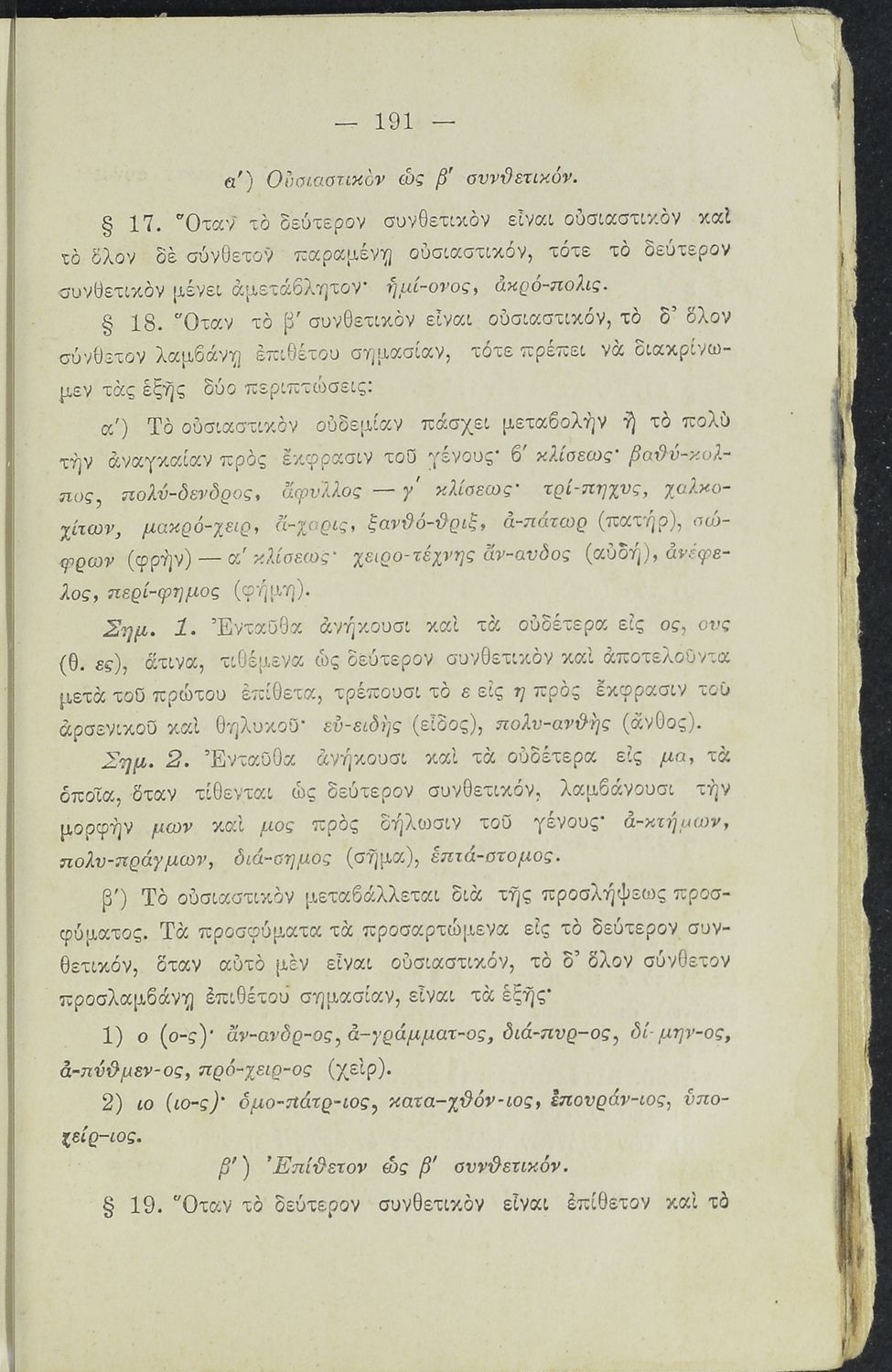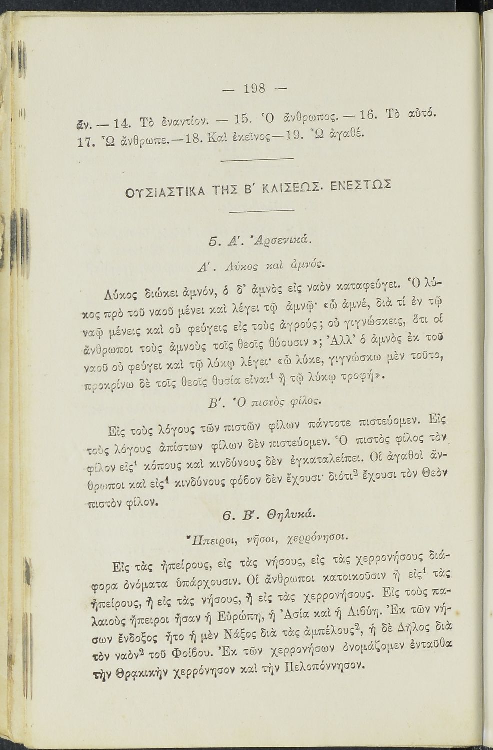 Σχολικό εγχειρίδιο Αρχαίων Ελληνικών για τα Ελληνικά Σχολεία και Παρθεναγωγεία που περιέχει τους κανόνες γραμματικής και είναι χωρισμένο σε φθογγολογικό, τυπολογικό και ετυμολογικό μέρος.