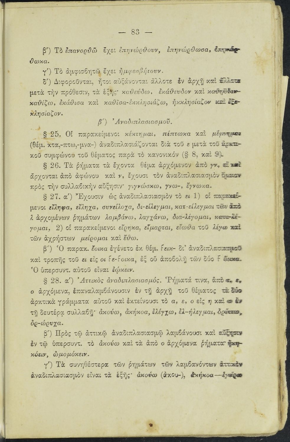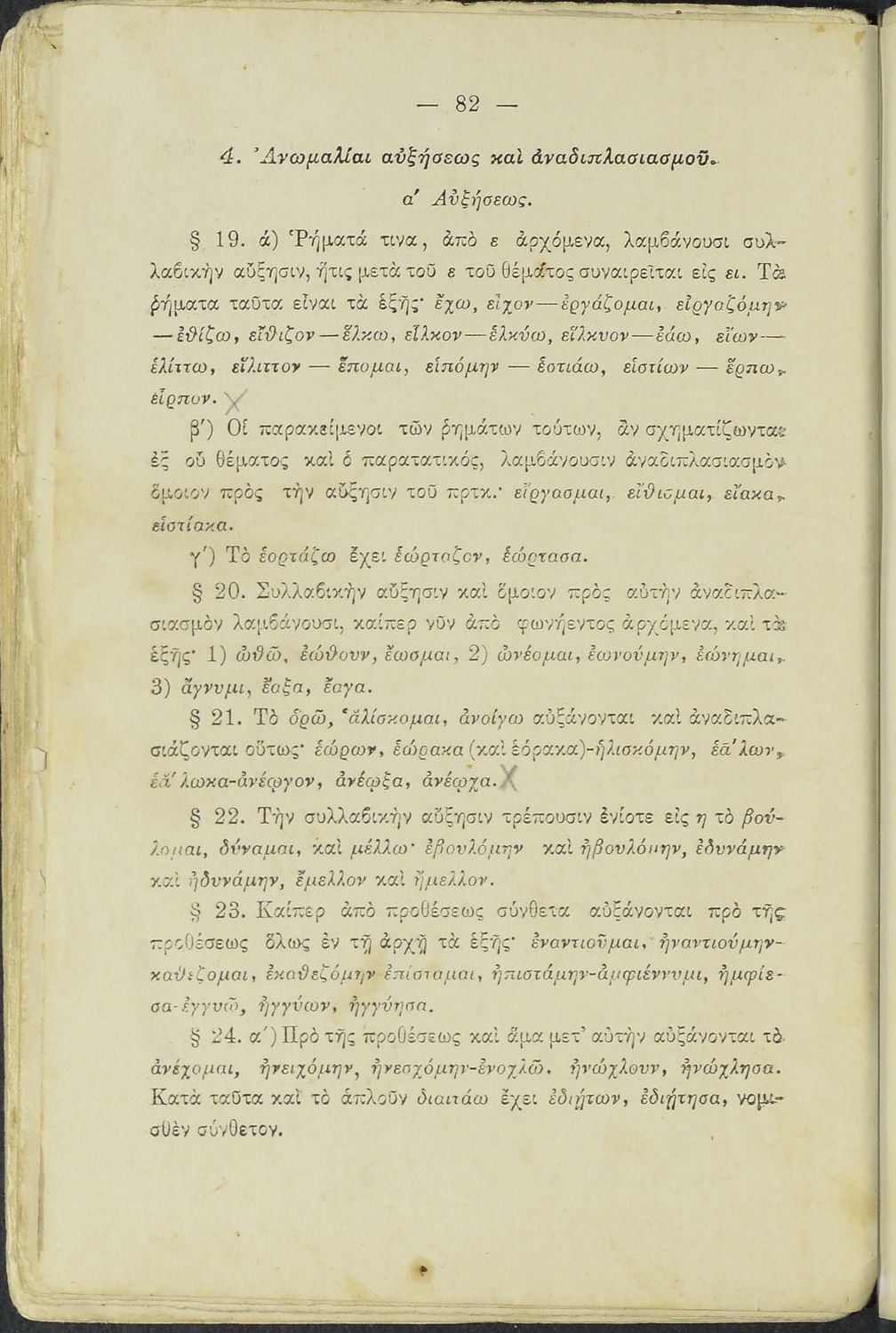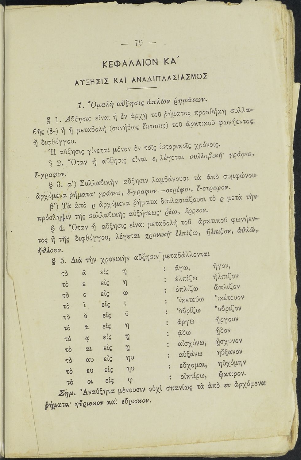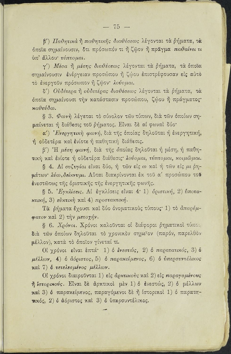 Σχολικό εγχειρίδιο Αρχαίων Ελληνικών για τα Ελληνικά Σχολεία και Παρθεναγωγεία που περιέχει τους κανόνες γραμματικής και είναι χωρισμένο σε φθογγολογικό, τυπολογικό και ετυμολογικό μέρος.