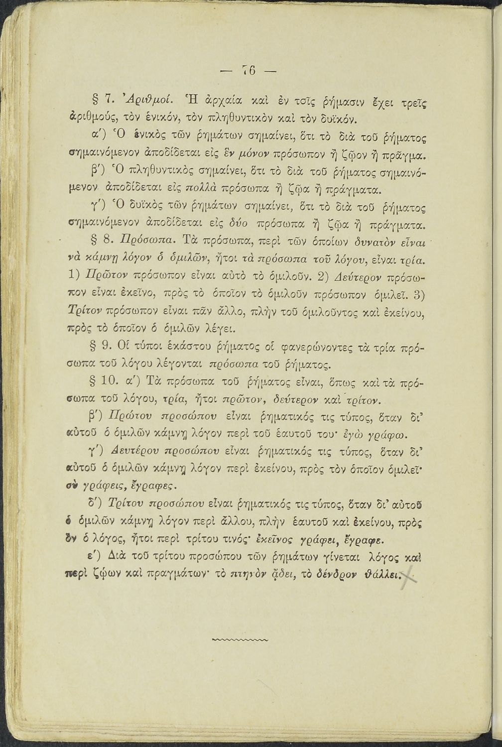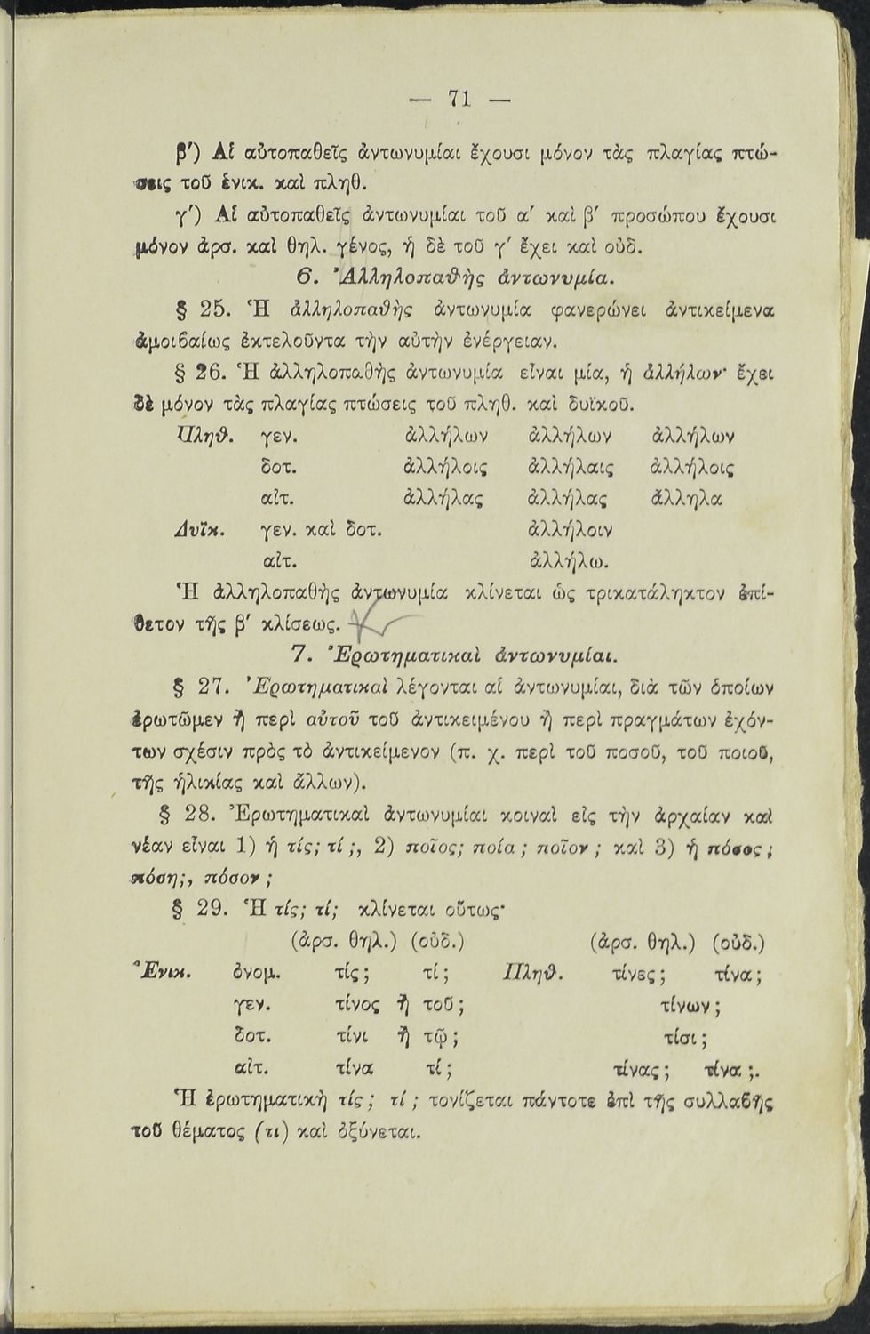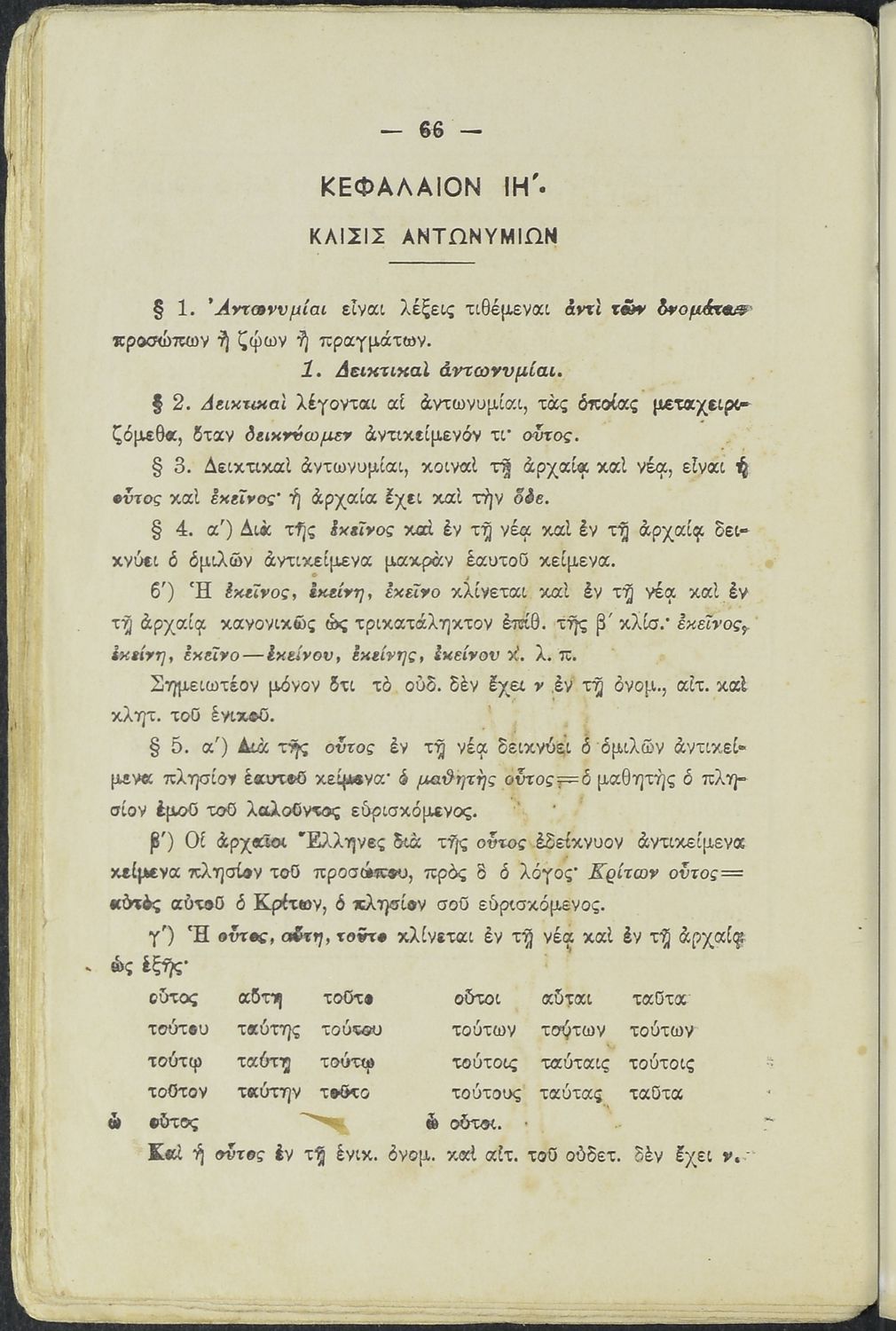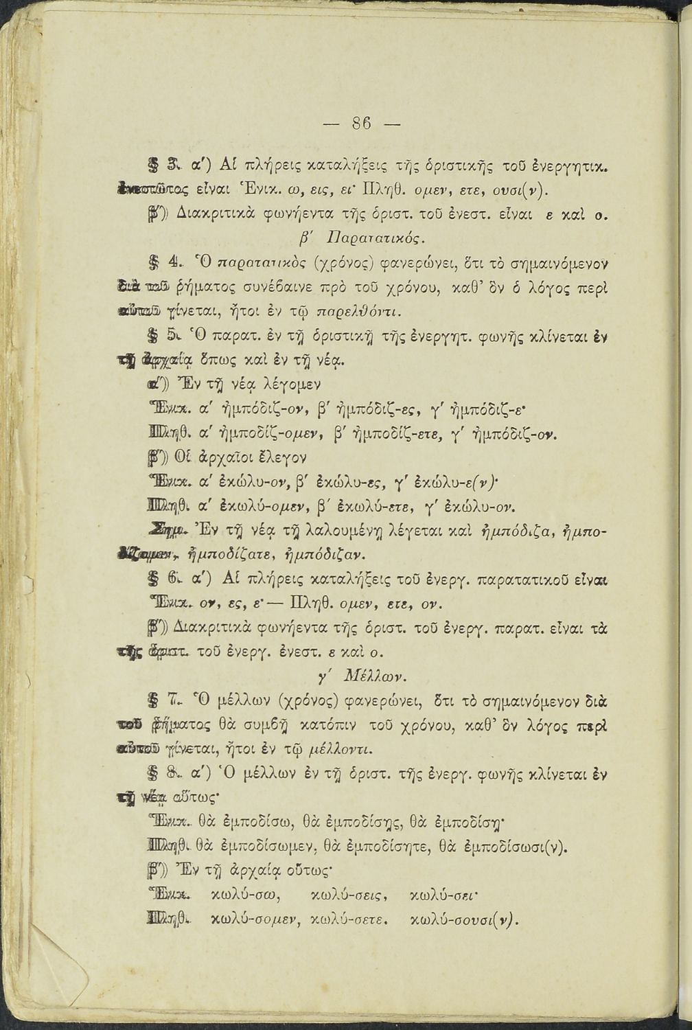 Σχολικό εγχειρίδιο Αρχαίων Ελληνικών για τα Ελληνικά Σχολεία και Παρθεναγωγεία που περιέχει τους κανόνες γραμματικής και είναι χωρισμένο σε φθογγολογικό, τυπολογικό και ετυμολογικό μέρος.
