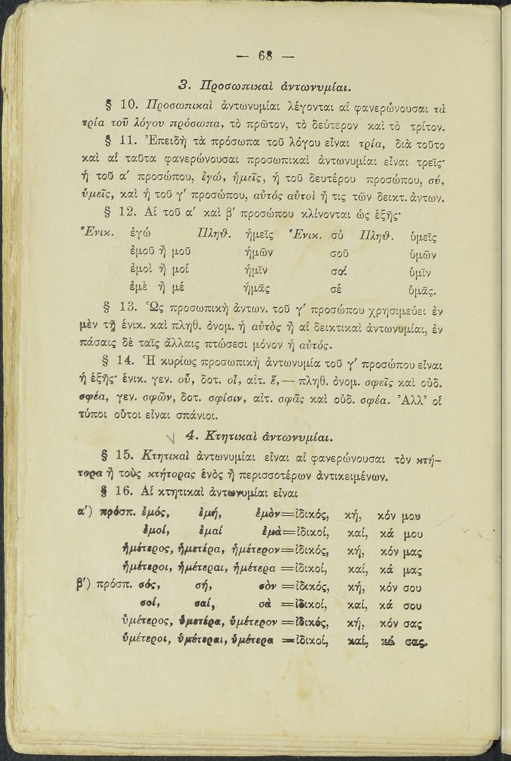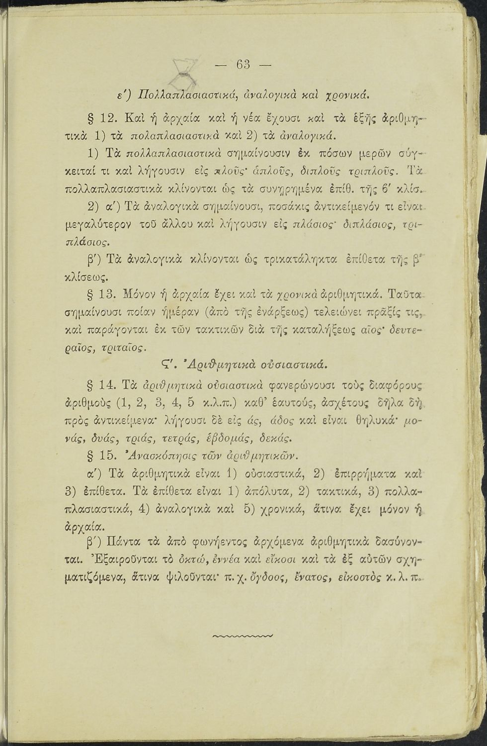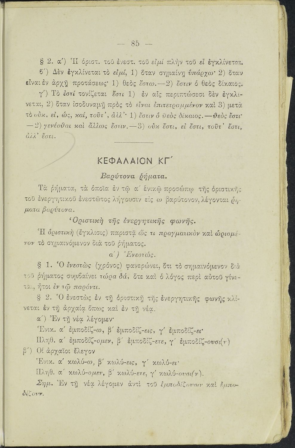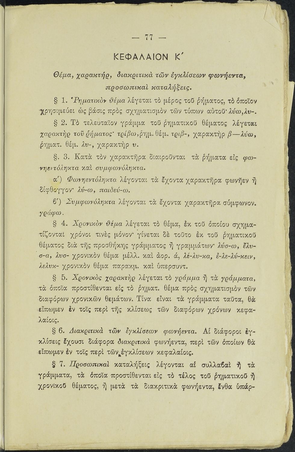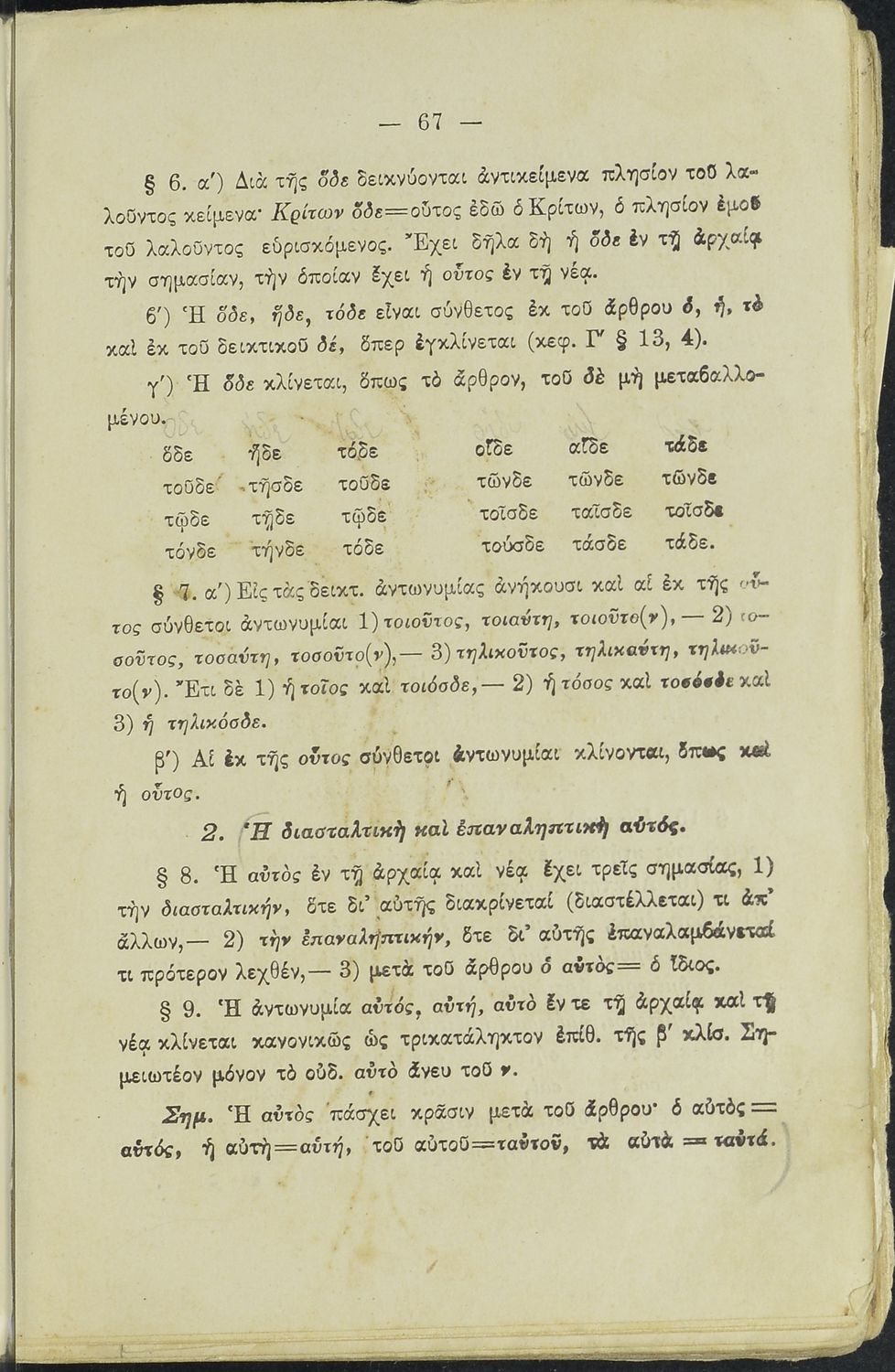 Σχολικό εγχειρίδιο Αρχαίων Ελληνικών για τα Ελληνικά Σχολεία και Παρθεναγωγεία που περιέχει τους κανόνες γραμματικής και είναι χωρισμένο σε φθογγολογικό, τυπολογικό και ετυμολογικό μέρος.