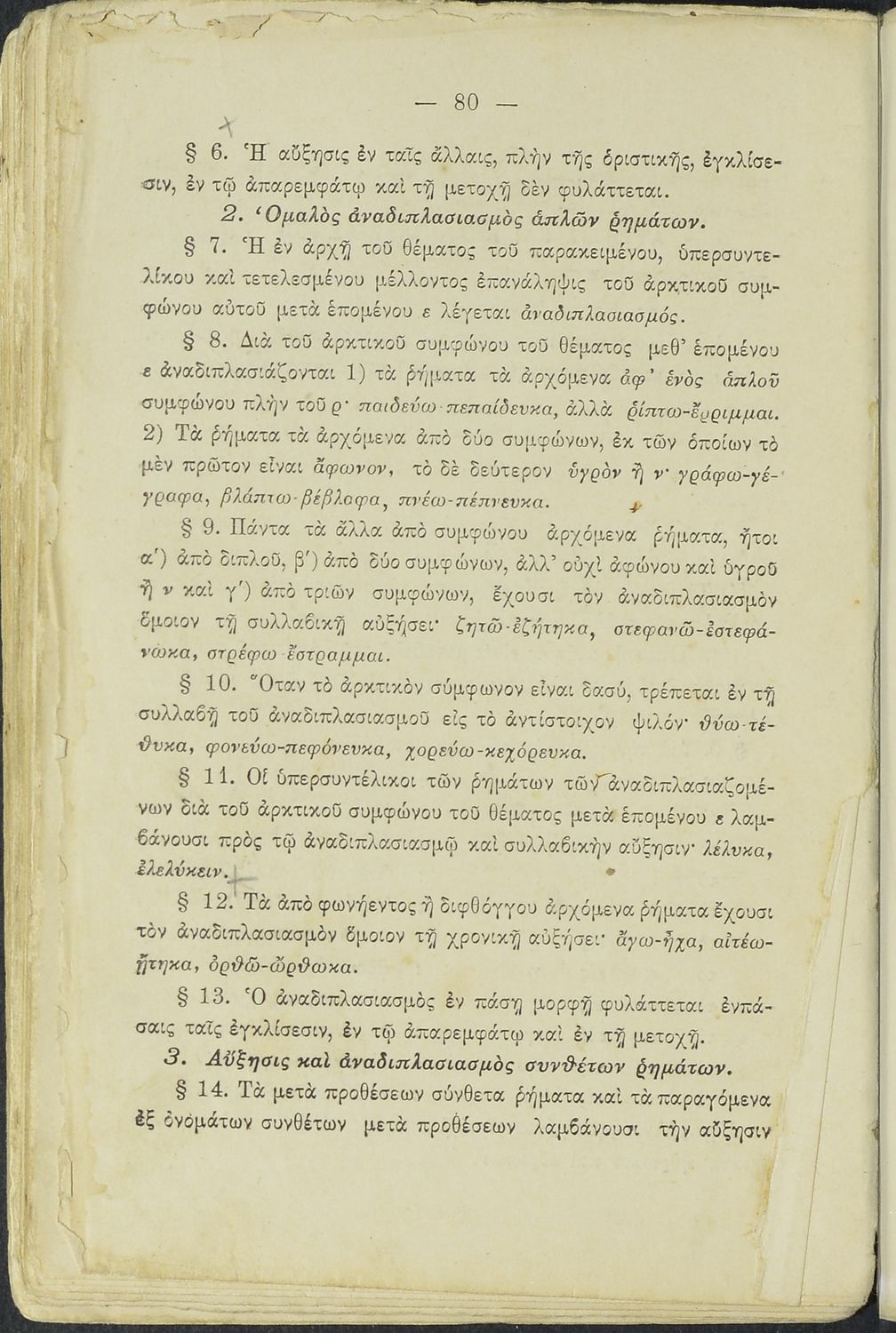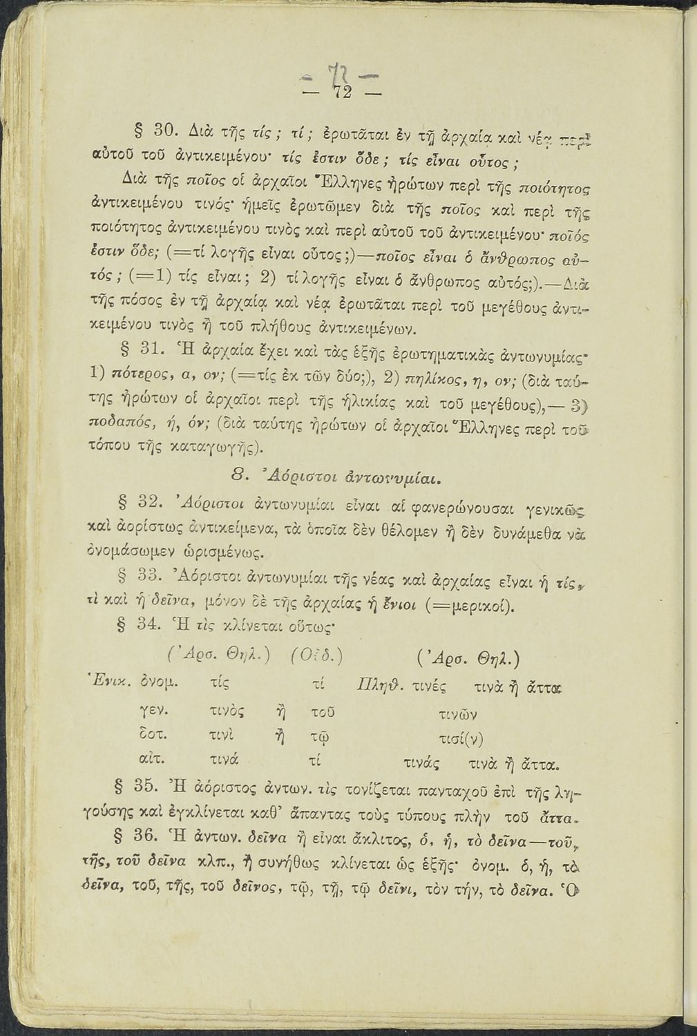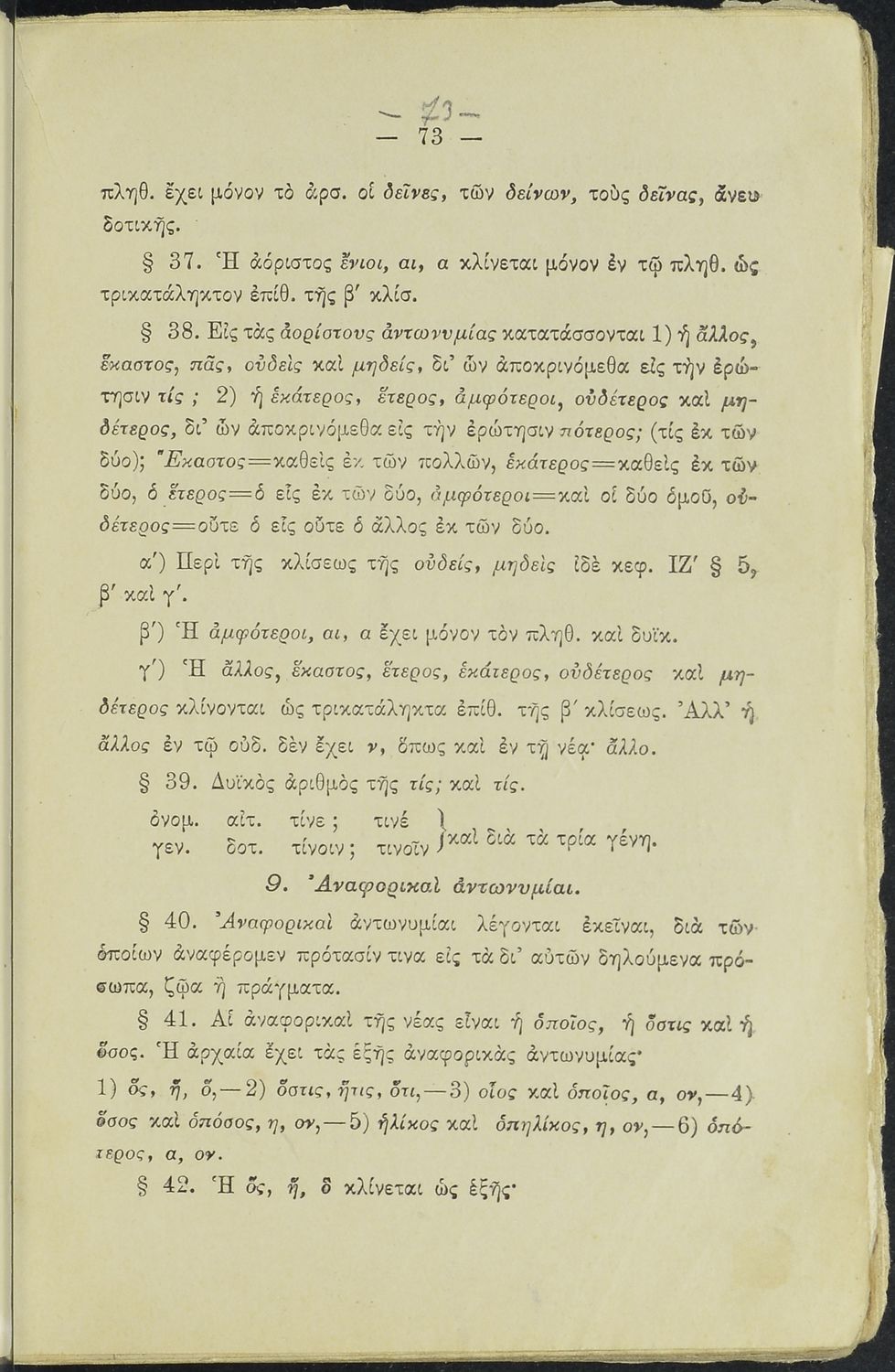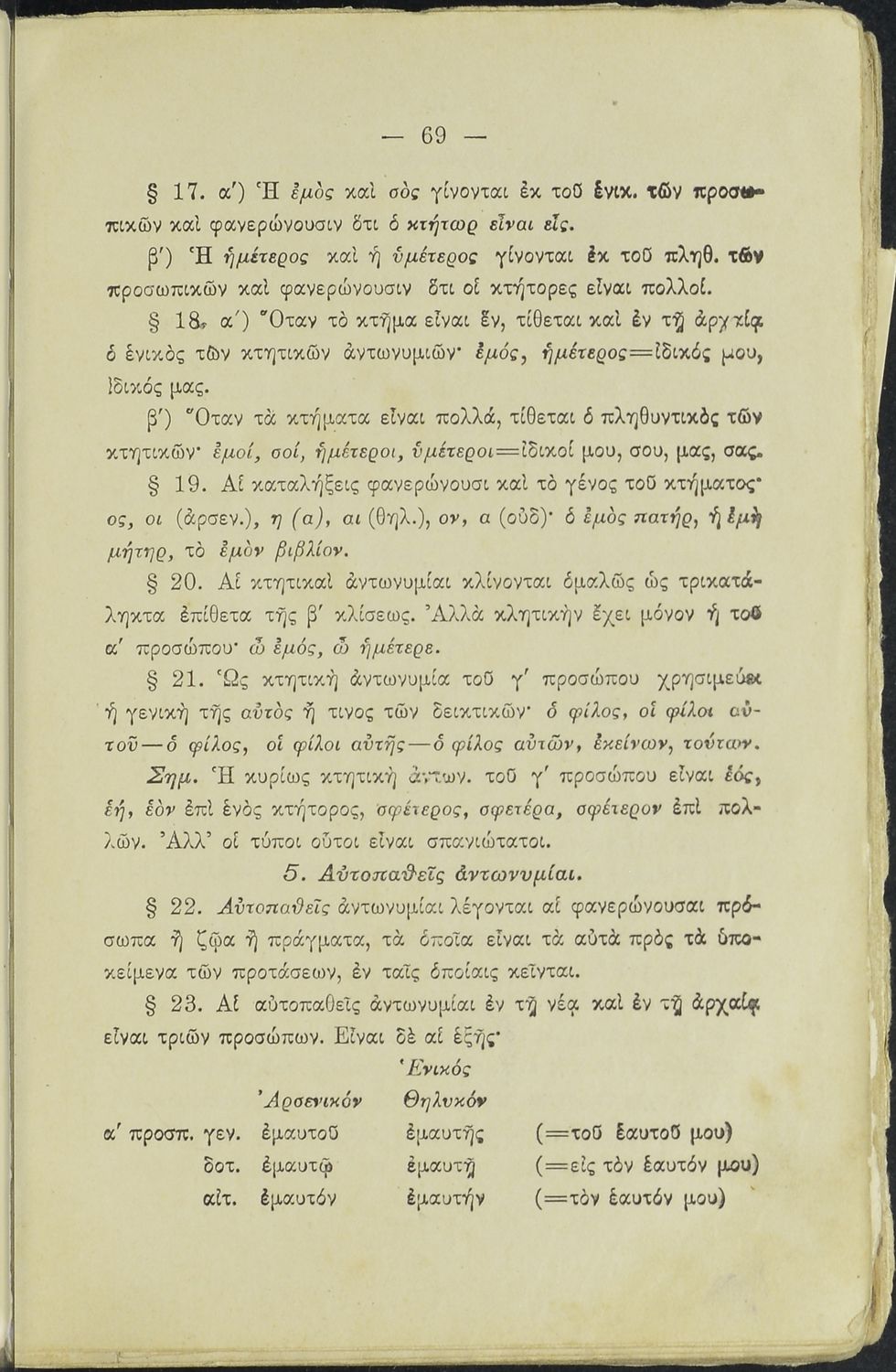 Σχολικό εγχειρίδιο Αρχαίων Ελληνικών για τα Ελληνικά Σχολεία και Παρθεναγωγεία που περιέχει τους κανόνες γραμματικής και είναι χωρισμένο σε φθογγολογικό, τυπολογικό και ετυμολογικό μέρος.