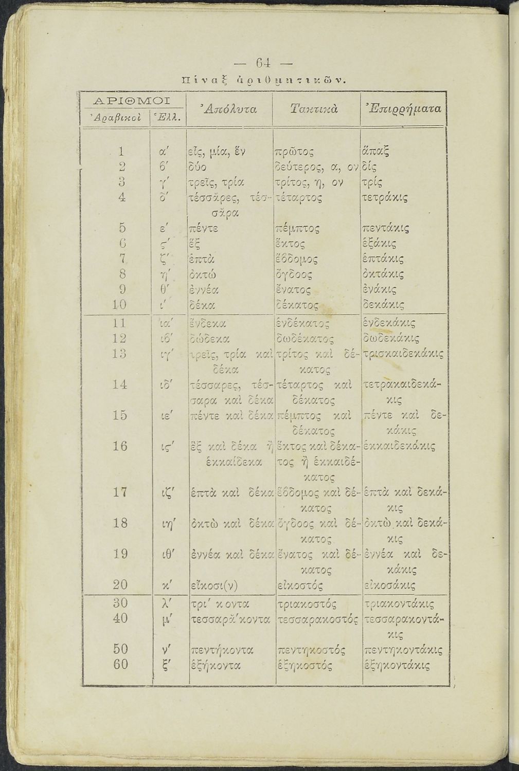 Μαθητικό βοήθημα Αρχαίων Ελληνικών για τα Ελληνικά Σχολεία, Παρθεναγωγεία και Γυμνάσια που περιλαμβάνει γραμματική της αρχαίας ελληνικής και κατάλογο ανωμάλων ρημάτων.