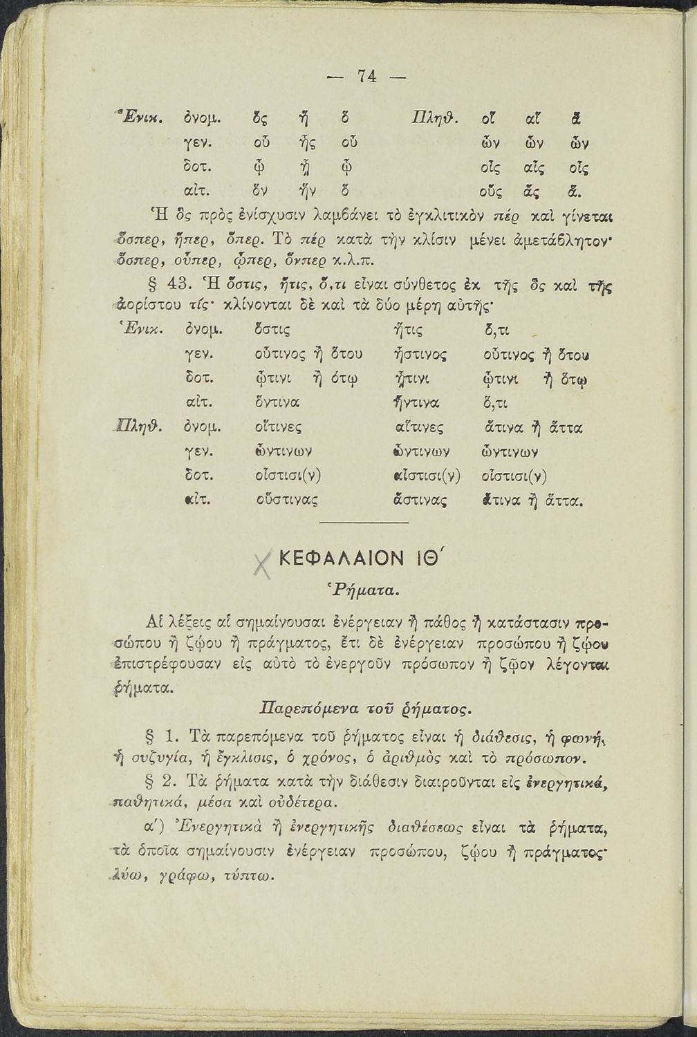Σχολικό εγχειρίδιο Αρχαίων Ελληνικών Γυμνασίου που περιλαμβάνει τους κανόνες γραμματικής και είναι χωρισμένη στο φθογγολογικό, το τυπολογικό και ετυμολογικό μέρος.