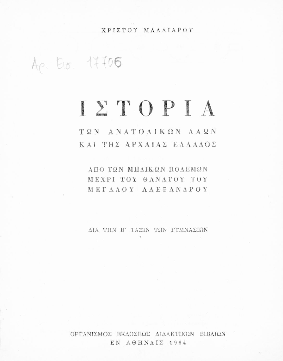 Τίτλος: Ιστορία των ανατολικών λαών και της αρχαίας Ελλάδος από των Μηδικών Πολέμων μέχρι του θανάτου του Μεγάλου Αλεξάνδρου δια την Β΄ Τάξιν των Γυμνασίων