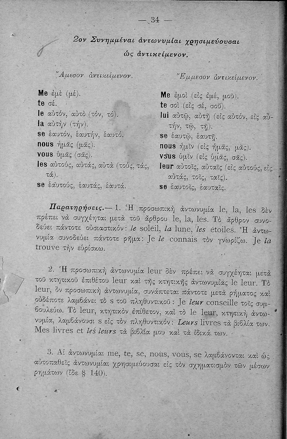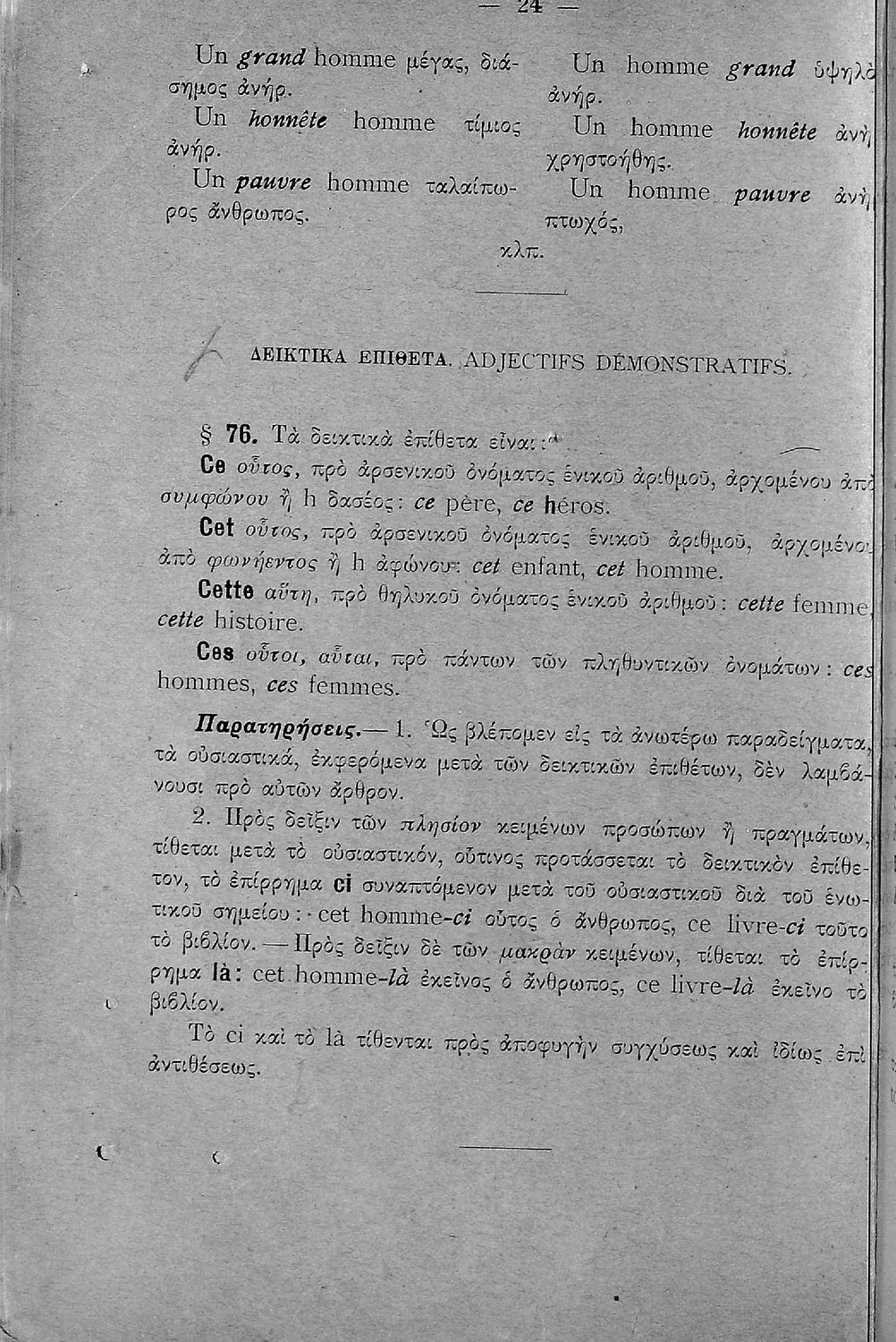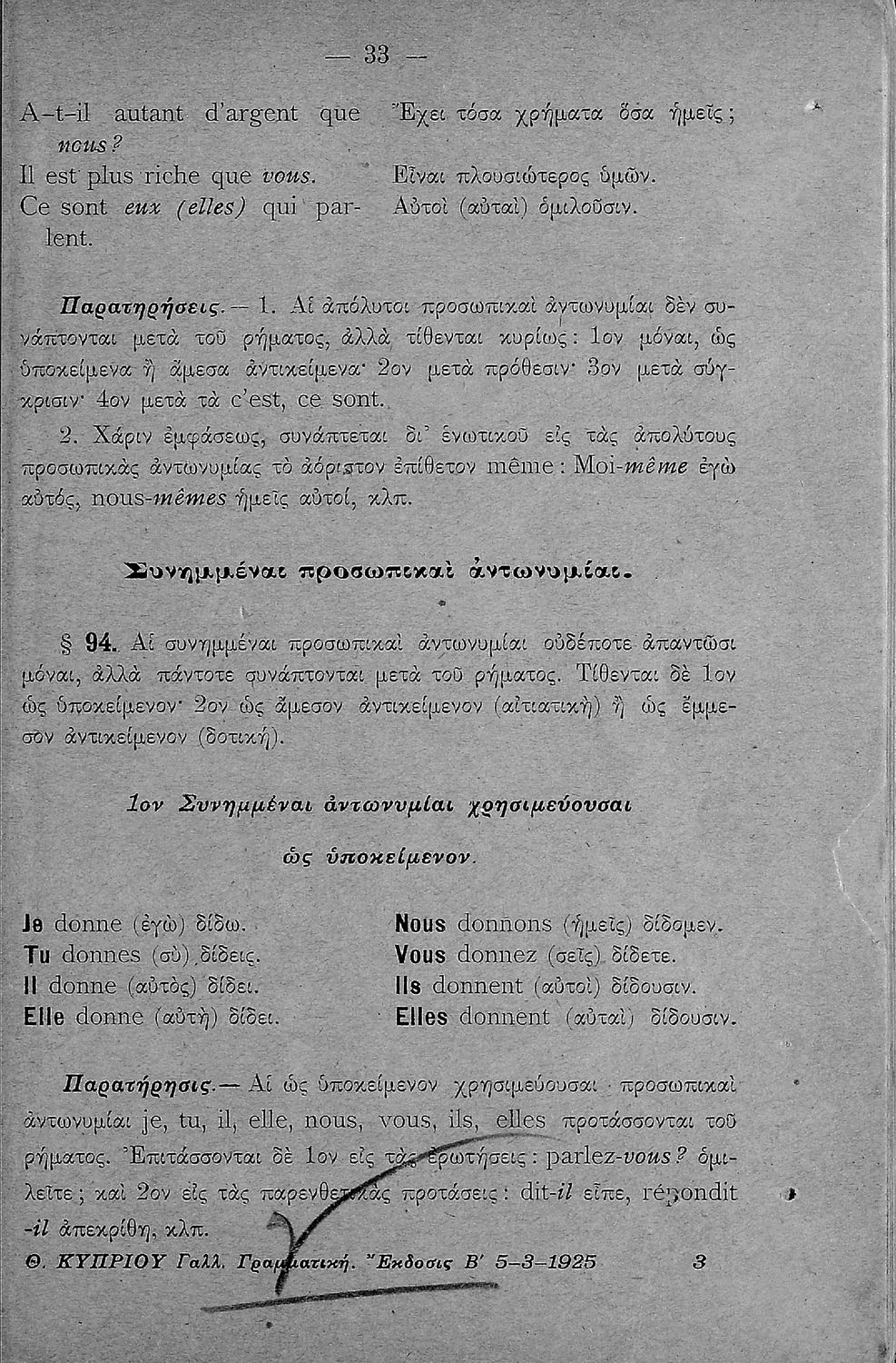 Γραμματική της Γαλλικής γλώσσας για τα Τετρατάξια Γυμνάσια, τη Γ΄ τάξη των Αστικών Σχολείων των Θηλέων και τα Διδασκαλεία της Δημοτικής Εκπαίδευσης που περιλαμβάνει θεωρία, ασκήσεις και λεξιλόγιο.