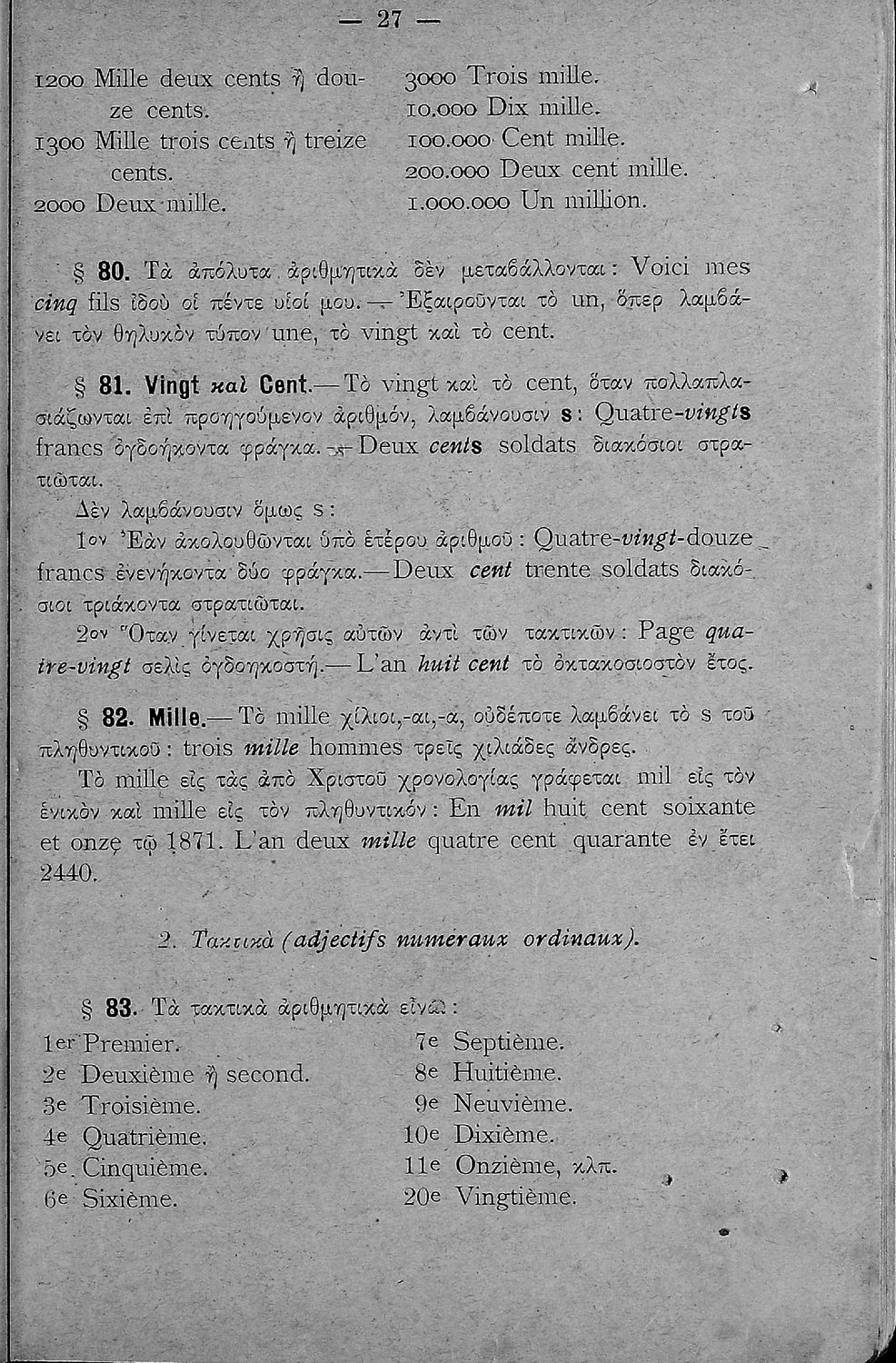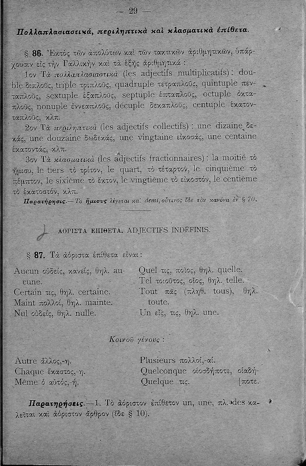 Γραμματική της Γαλλικής γλώσσας για τα Τετρατάξια Γυμνάσια, τη Γ΄ τάξη των Αστικών Σχολείων Θηλέων και τα Διδασκαλεία της Δημοτικής Εκπαίδευσης που περιλαμβάνει θεωρία, ασκήσεις και λεξιλόγιο.