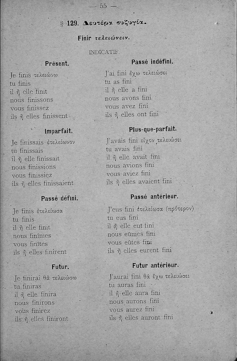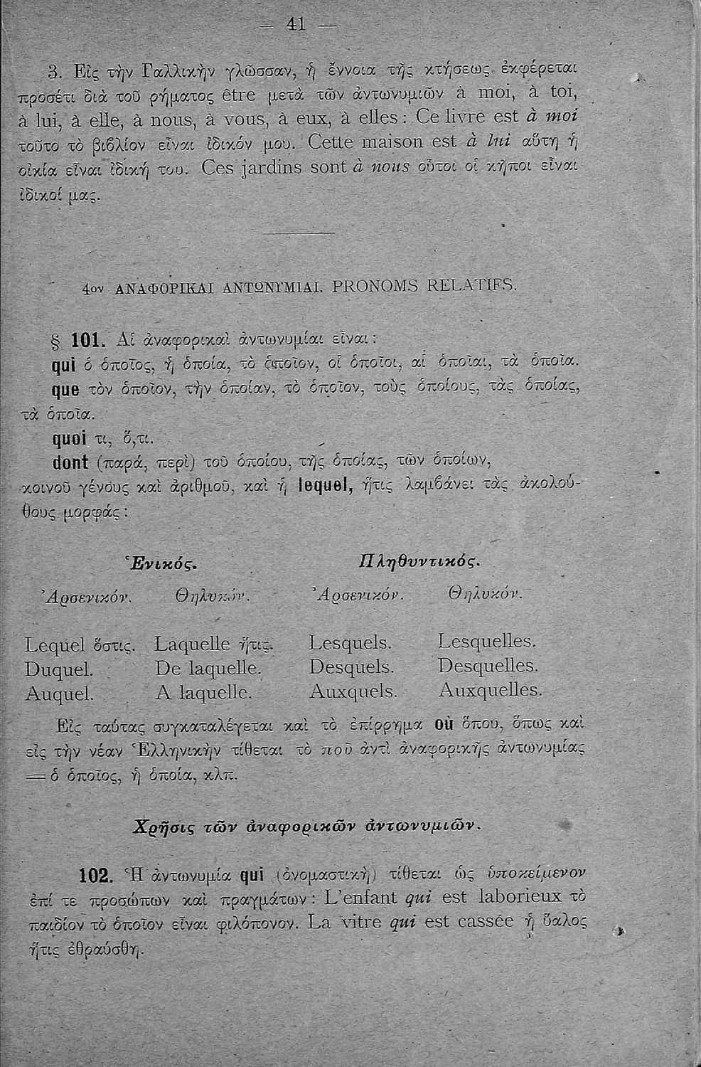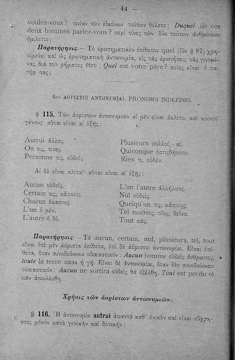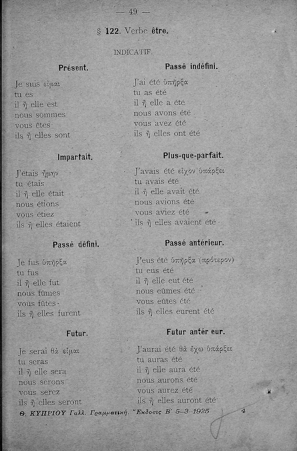 Γραμματική της Γαλλικής γλώσσας για τα Τετρατάξια Γυμνάσια, τη Γ΄ τάξη των Αστικών Σχολείων των Θηλέων και τα Διδασκαλεία της Δημοτικής Εκπαίδευσης που περιλαμβάνει θεωρία, ασκήσεις και λεξιλόγιο.